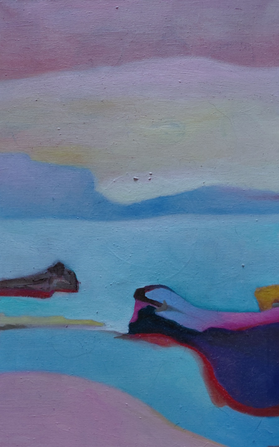 Obraz, który mamy przed sobą, to prawdziwa uczta dla oka. Dominują na nim pastelowe tonacje niebieskiego, różu i fioletu, tworząc harmonijną całość. Kształty są łagodne, niemalże płynne. Przywodzą na myśl pejzaż, lecz abstrakcyjny, pełen subtelnych przejść kolorystycznych. Kompozycja jest otwarta, pozwala oczom wędrować po płótnie bez pośpiechu. To jak podróż po krainie snów, gdzie rzeczywistość miesza się z wyobraźnią. Atmosfera obrazu jest spokojna, ale ma w sobie coś intrygującego. Jakby zapraszała do zadumy. Jest to, co nazywamy "chill". Artysta wykorzystał technikę impresjonistyczną, z naciskiem na grę światła i koloru. Delikatne pociągnięcia pędzla, miękkie przejścia - wszystko to buduje wrażenie spokoju. Jednak przy dłuższym spojrzeniu, zauważyć można pewną dynamikę. Może odrobina tajemnicy? Dla 7-latka to po prostu piękny obrazek z niebieskim niebem! Obraz może budzić refleksję nad kruchością chwili, przenosząc w przestrzeń ciszy i kontemplacji. Dla mnie to jak chwila na plaży przed zmrokiem, gdy słońce już znikło, ale jego blask nadal trwa. Ach, aż chce się tam być!