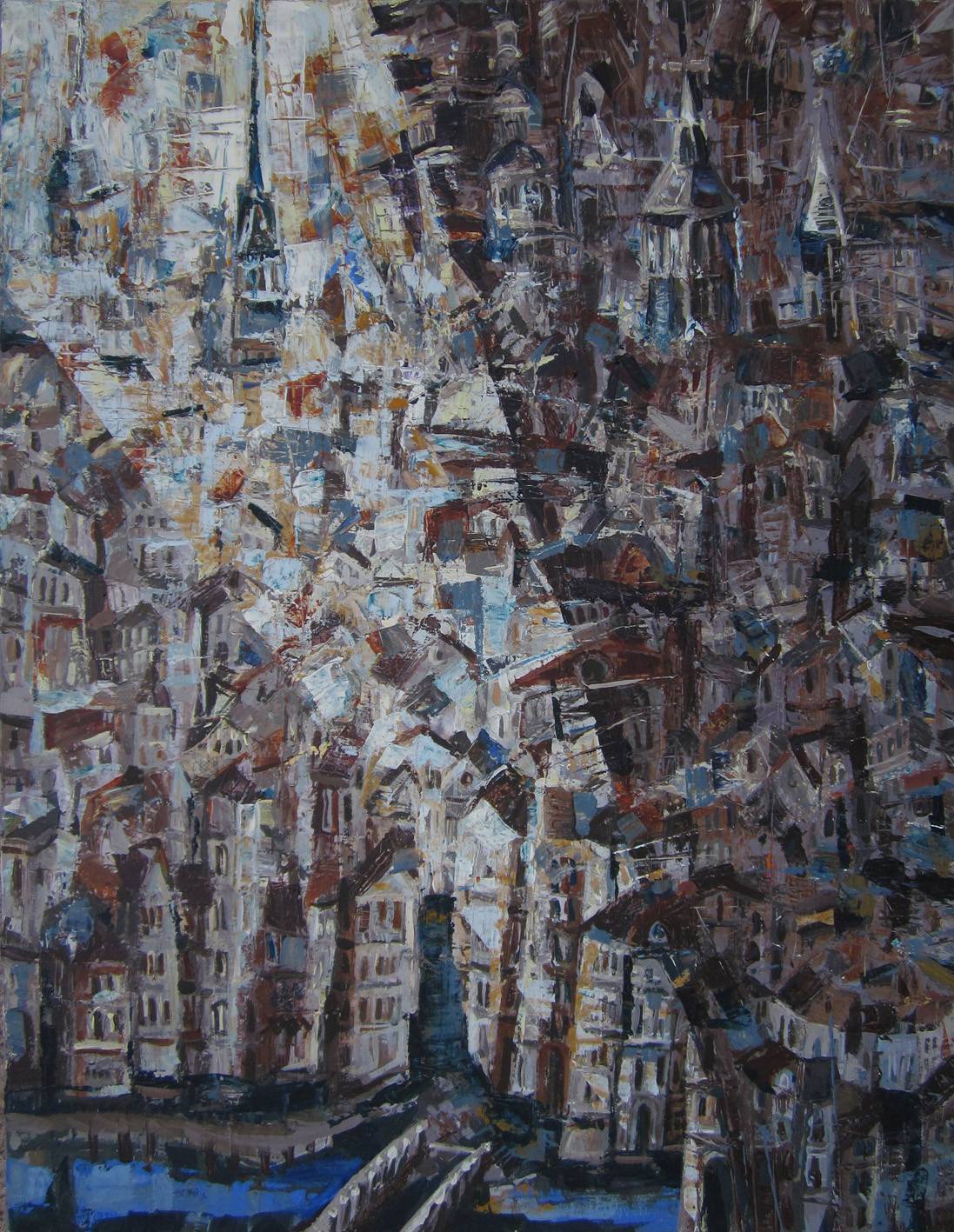Szaro-brązowy pejzaż miejski z rzeką i mostem zakochanych, oświetlony smugą światła księzycowego