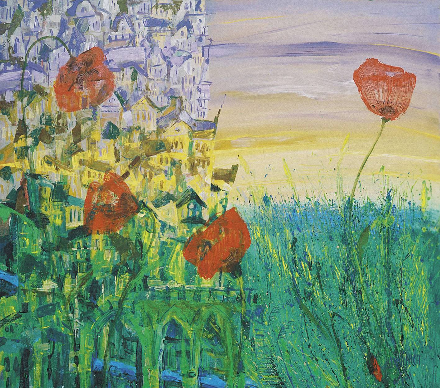 Obraz emanuje życiem, zestawiając miejskie krajobrazy z naturą. Po lewej stronie dominują barwy zieleni i błękitu, tworząc skomplikowany labirynt budynków. To jakby miasto wyłaniające się z nicości, wplecione w strukturę wzgórza. Te nieoczywiste kształty przeplatają się z czerwonymi plamami maków, które przenikają miasto swoją intensywnością. Z kolei prawa część obrazu to eksplozja natury, pełna zieleni i błękitu, gdzie maki rosną dumnie na tle wschodzącego słońca (sunrise). Maki wyglądają jakby tańczyły na wietrze. Atmosfera obrazu przepełniona jest kontrastem, jednocześnie chaotyczna i spokojna. Styl artysty wydaje się być dynamiczny; używa grubych, wyraźnych pociągnięć pędzla, dodając obrazu ekspresji. To artystyczna gra między miastem a naturą, gdzie techniki mieszania kolorów tworzą wrażenie przejścia z jednej rzeczywistości do drugiej. Obraz może wywoływać uczucie nostalgii, przypominając o harmonii, którą często gubimy we współczesnym świecie. Patrząc na niego, myślę sobie: "Jak to możliwe, że coś tak prostego może być tak piękne?" Dziecko mogłoby powiedzieć: "To jest jak dwie bajki zmieszane razem!" To dzieło skłania do refleksji nad połączeniem dwóch światów, które często postrzegamy jako oddzielone. Wow, naprawdę piękne.