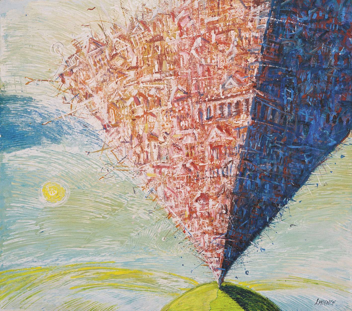 Obraz, który oglądamy, jest prawdziwym kalejdoskopem kolorów. Ciepłe, rude odcienie przeplatają się z chłodnymi, głębokimi błękity. Kształtuje się on w formie stożka, który zdaje się wybuchać z zielonego wzgórza. Niesamowita dynamika! Kompozycja jest jak z surrealistycznego snu – nieco chaotyczna, ale pełna harmonii. Artysta użył techniki impasto, co nadaje dziełu wyjątkową fakturę, a grubo nałożona farba tworzy efekt niemal trójwymiarowy. Atmosfera obrazu wydaje się magiczna i nieco niepokojąca, jakbyśmy patrzyli na świat na granicy jawy i snu. Trudno się nie zastanowić, co kryje się za tą wizją. Może to metafora miasta, które wznosi się ku chmurom, dążąc do nieba. Wyczuwalna jest pewna nostalgia – coś się zmienia, coś ucieka. Z jednej strony to może być "wow", z drugiej zaś niemal tęsknota za spokojem. Patrząc na ten obraz, czuję podekscytowanie i niepokój jednocześnie. Jest jak emocjonalna podróż, gdzie każdy detal skrywa historię. Dla mnie – to trochę jak patrzenie na kalejdoskop pełen tajemnic. Te misz-masze kolorów i kształtów są fascynujące. Może to wywołać radość, a może nawet refleksję nad przemijaniem. Jak napisałby to siedmiolatek: niebo się przekręca, bo lubi tak być. A może to tylko mrugnięcie oka wyobraźni. Fascynujące, prawda?