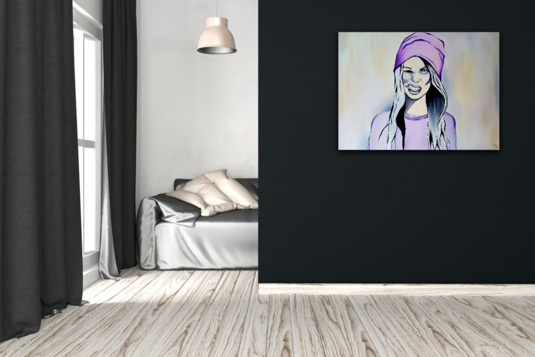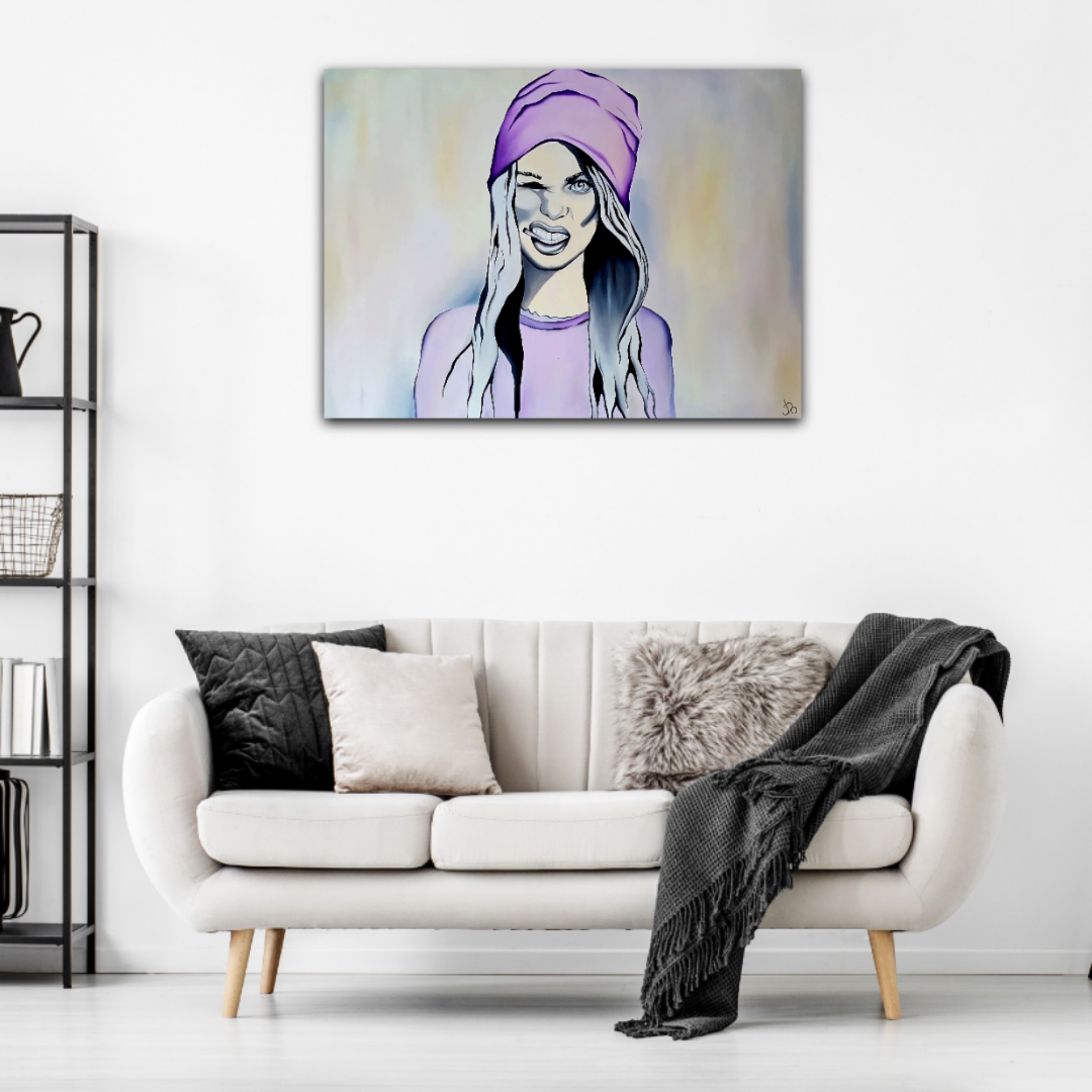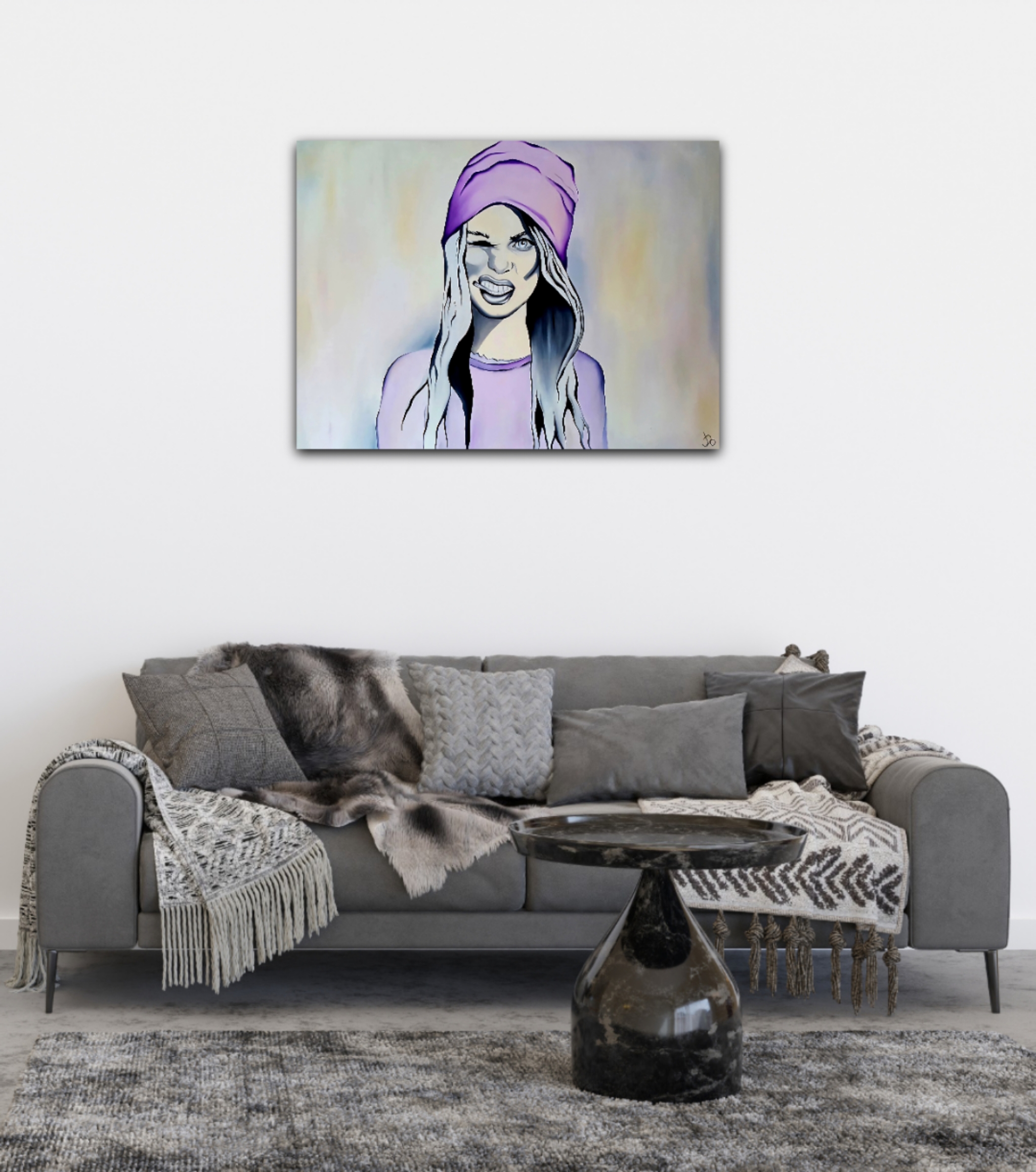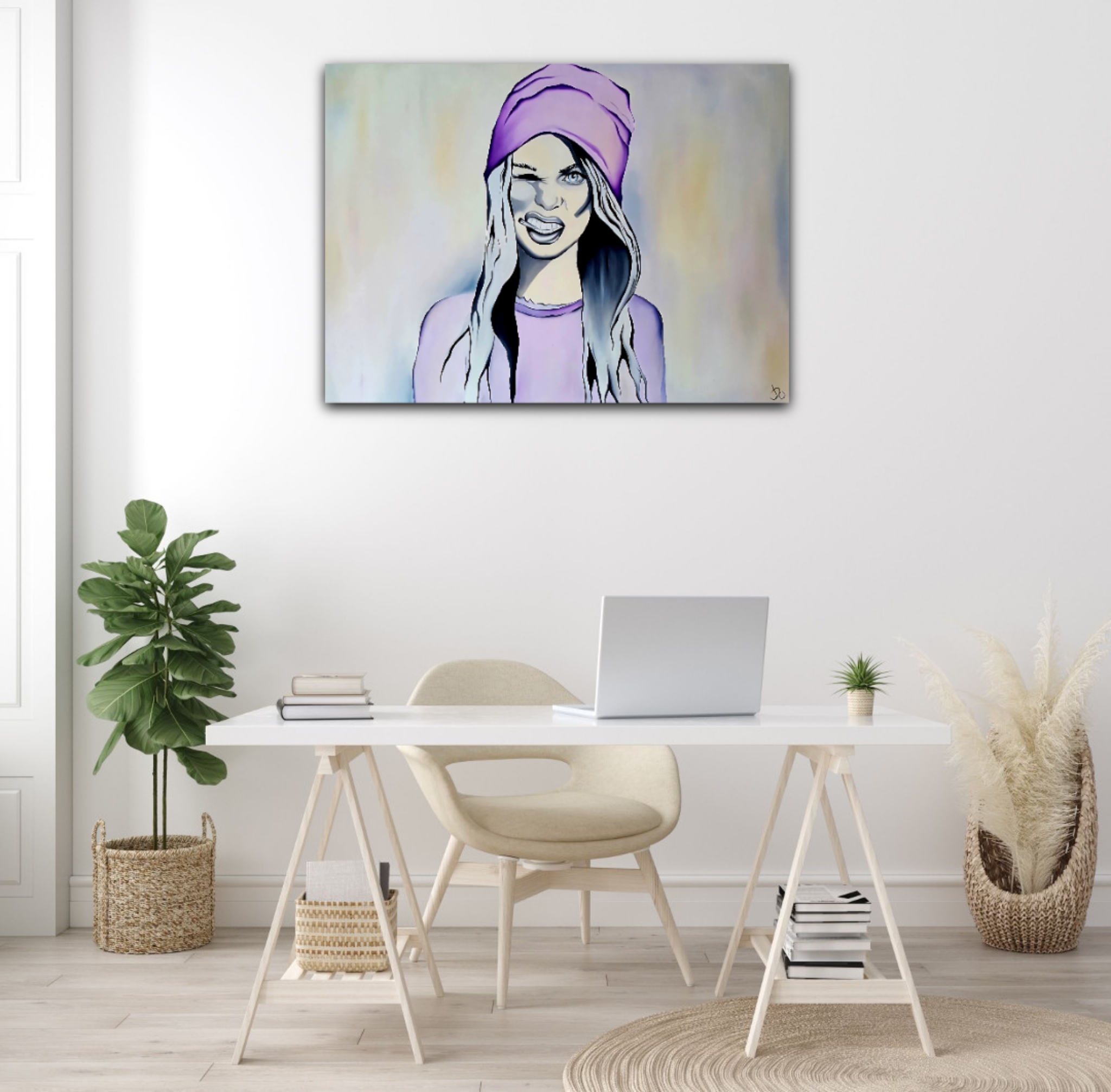 Na obrazie widzimy portret młodej kobiety, której twarz wyraża figlarną i nieco buntowniczą atmosferę. Delikatna paleta kolorów z przewagą fioletowch odcieni dodatkowo podkreśla jej młodzieńczą energię. Jej czapka, w odcieniu głębokiego fioletu, przyciąga wzrok, a luźno spływające włosy nadają całości lekkość. Kompozycja obrazu jest prosta, lecz efektowna, z centralnie umieszczoną postacią, która niemalże wyłania się z gładkiego tła. Artysta zastosował technikę przypominającą mieszankę realizmu z elementami pop-artu. Kontury są wyraźnie zaznaczone, co dodaje obrazu charakteru cartoonowego. Patrząc na obraz, można poczuć spontaniczność i pewną beztroskę. Może to wywoływać u odbiorcy uśmiech i chęć przyłączenia się do tej figlarnej gry. Kiedy patrzę na jej zęby, przypomina mi to chwilę, gdy byłem dzieckiem i robiłem głupie miny przed lustrem. It's kind of funny! Dla mnie to obraz, który zachęca do łamania zasad i korzystania z chwili. Takie wykorzystanie kolorów i kompozycji świadczy o odwadze artysty i jego chęci eksperymentowania. Całość budzi uczucie sympatii i ciepła, jakby obrałbym osobliwy kawałek świata, który chciałbym zabrać do domu na zawsze.