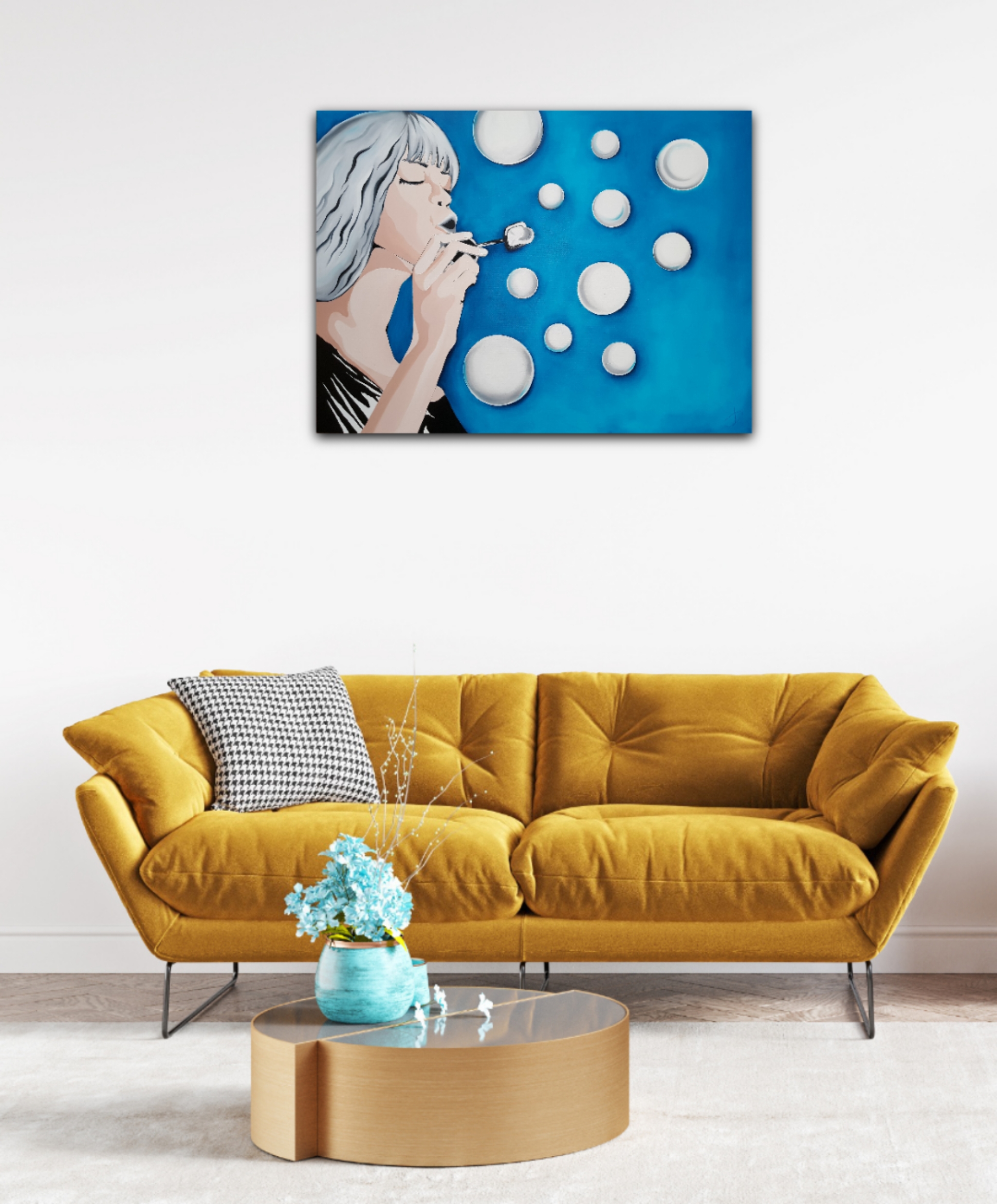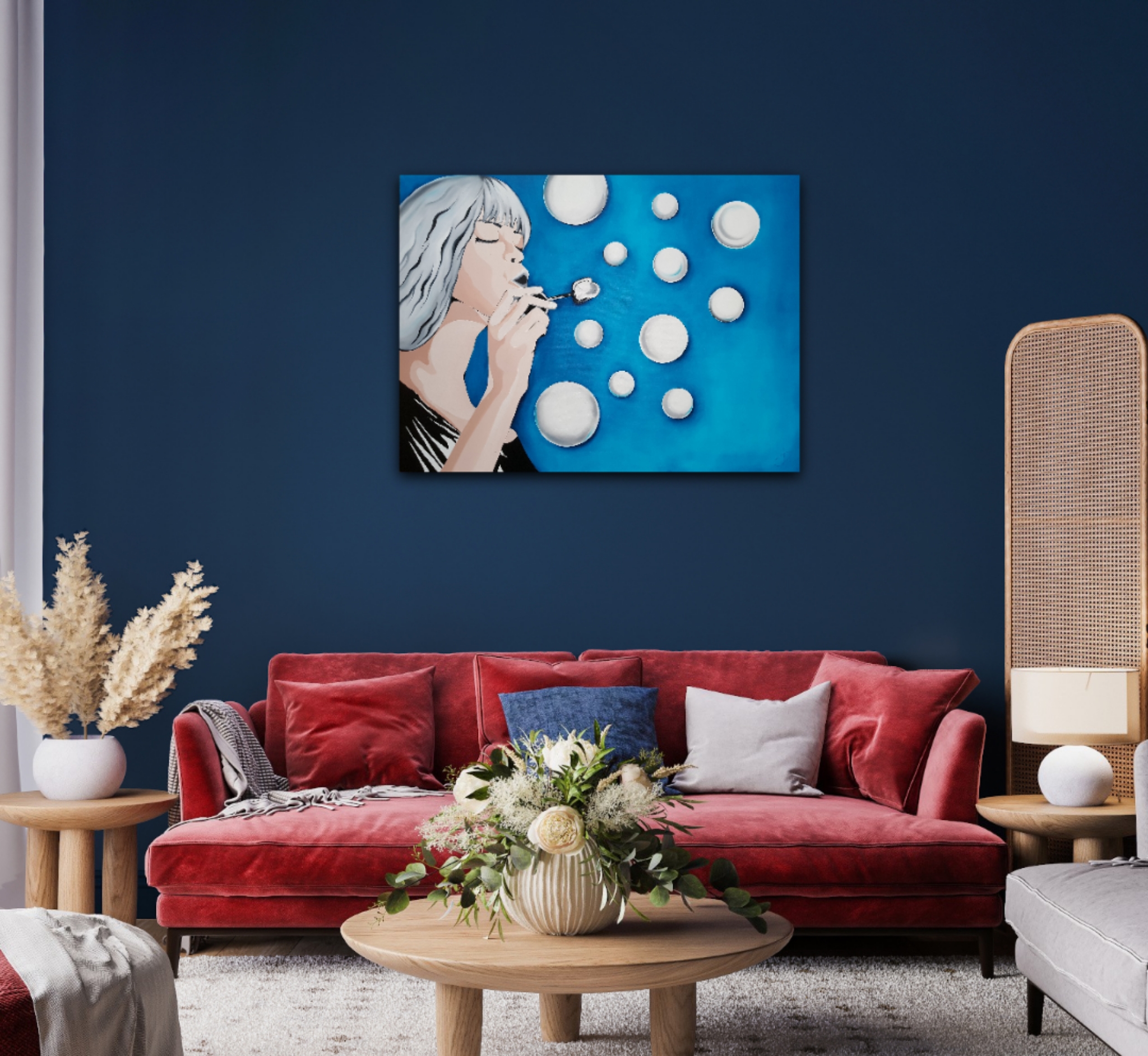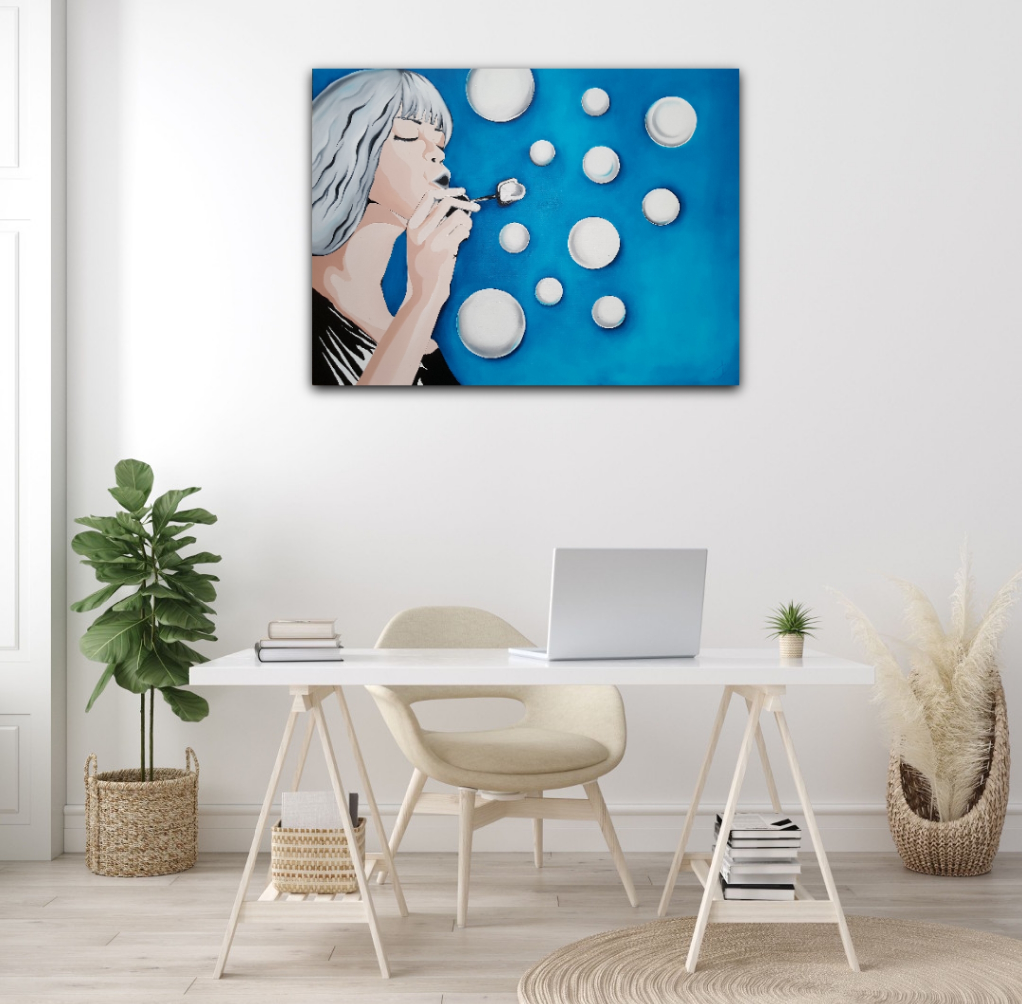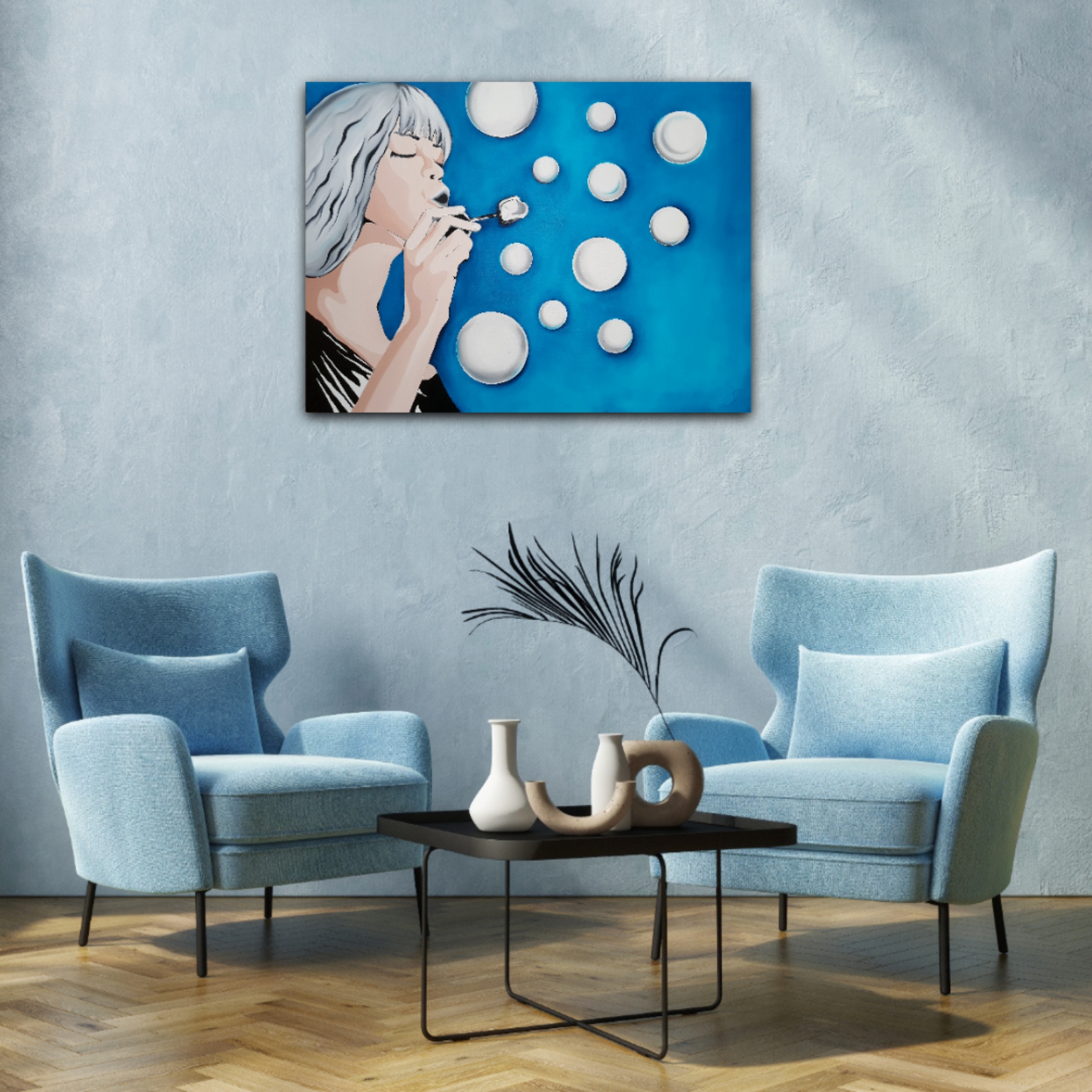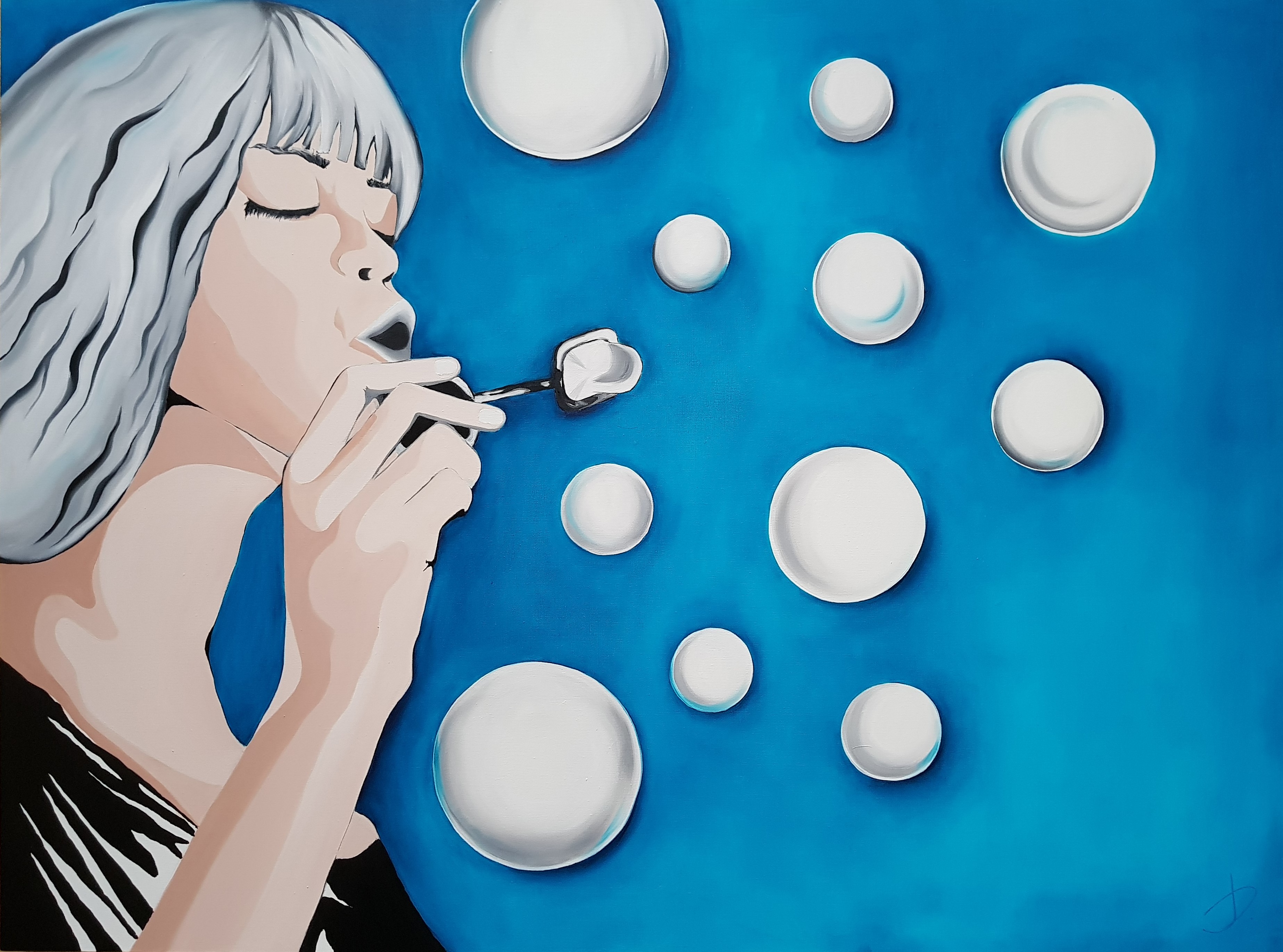 Na obrazie widzimy postać, która wydaje się być zatrzymana w chwili niemalże magicznej. Tło w niebieskim odcieniu tworzy idealne kontrast dla białych kul unoszących się w powietrzu. Te kule jakby zawieszone w przestrzeni sugerują ulotność chwili, niczym bańki mydlane, kruche i piękne. Postać, z zamkniętymi oczami, dmucha w kierunku kul, które wydają się być ożywione delikatnym podmuchem powietrza. Artysta zastosował tutaj technikę mieszanki realizmu z elementami pop artu, co nadaje całości lekkości. Linie są miękkie, a kształty wyraziste, co pomaga skupić na nich uwagę. Dzięki temu obraz emanuje spokojem i beztroską, przenosząc nas w świat dziecięcych marzeń i zabaw. "Wow!" - tak by powiedziało dziecko. Osobiście ten obraz wydaje mi się uroczy i pełen życia. Jakby chciał powiedzieć "Bierz życie tak prosto". Szalona kompozycja i bogactwo prostych form skłania do refleksji nad ulotnością naszych chwil, tworząc tęsknotę za dzieciństwem. To jest właśnie to, ta "magic moment". Cudnie uchwycony moment, który budzi uśmiech na twarzy.