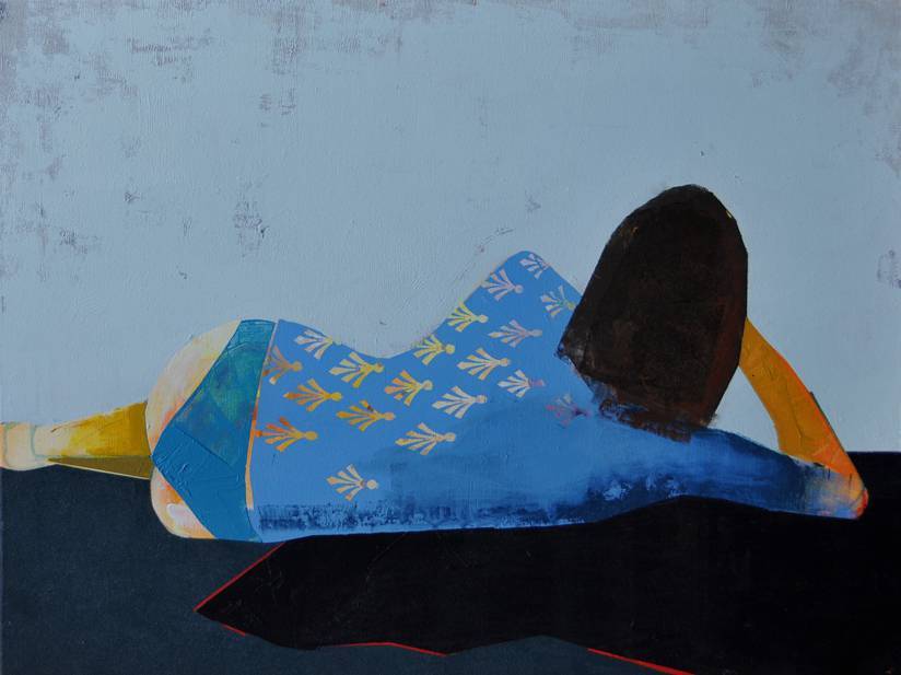 Na tym obrazie dominują ciepłe odcienie błękitu i żółci, które harmonijnie kontrastują z ciemniejszym tłem. Kształty są proste, geometryczne, a jednocześnie nawiązujące do organicznych form. Kompozycja skupia się na postaci ułożonej w leniwej pozie, rozciągniętej na ciemnej powierzchni. Całość emanuje spokojem i pewnym rodzajem nostalgii, jakby czas płynął wolniej. Artysta wykorzystał technikę malarską, która przypomina kolaż, gdzie płaskie bloki koloru tworzą niemal abstrakcyjną całość. Styl jest nowoczesny, z nutą dekonstrukcji, ukazując codzienność w nowym świetle. Hints of mystery, można poczuć subtelną sugestię ukrytej historii. Obraz ten wzbudza we mnie refleksję nad chwilami relaksu i ciszy, które często umykają w zgiełku dnia. Myślę sobie, że każdy potrzebuje takich momentów. Dla 7-letniego dziecka mogłoby to wyglądać jak ktoś, kto odpoczywa po długim dniu zabawy. Może to być też symboliczne zaproszenie do zasłuchania się w siebie i znalezienia wewnętrznego spokoju. W skrócie, to coś więcej niż obraz – to brama do osobistych przeżywań i emocji.