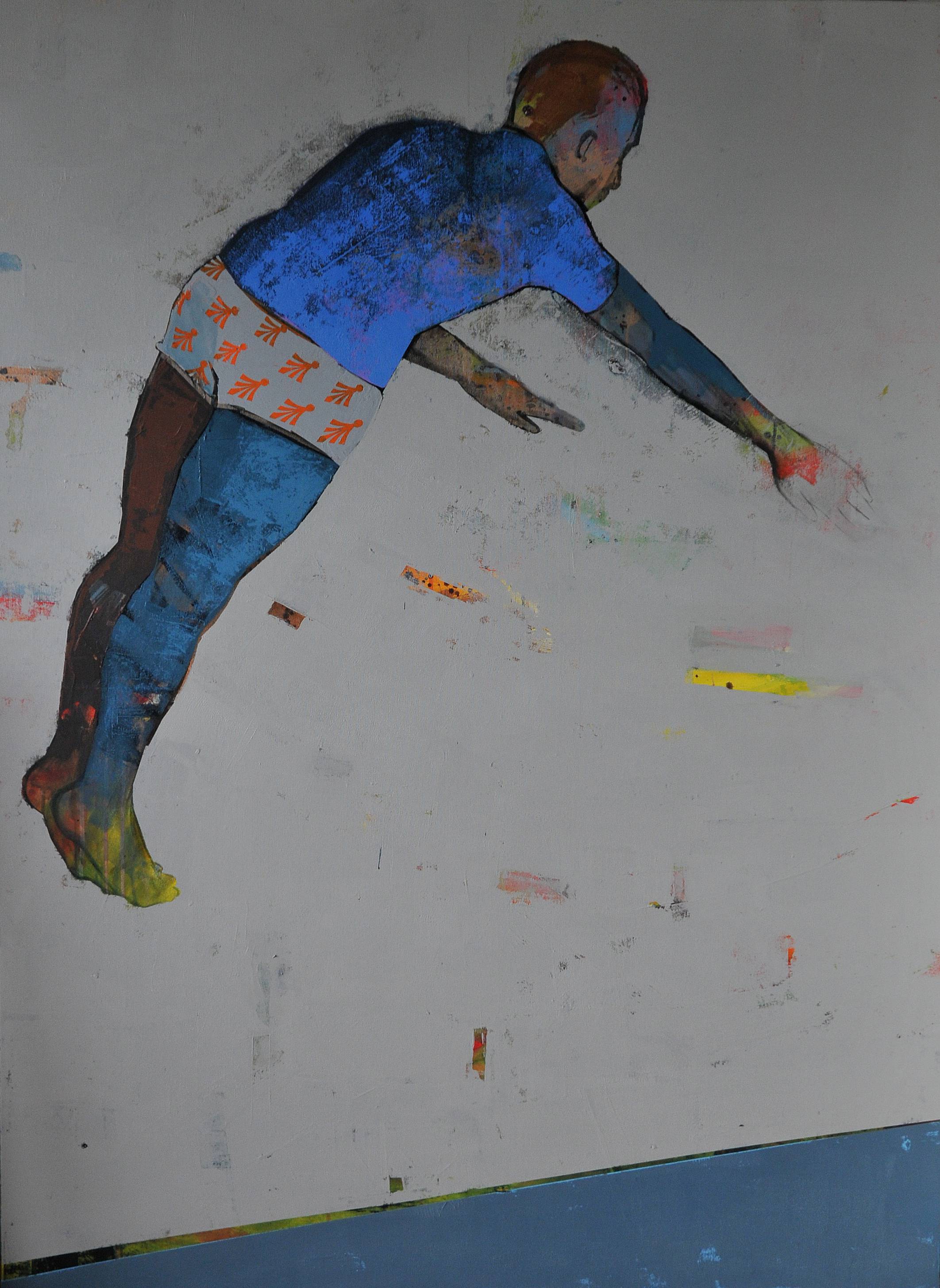 Obraz przedstawia postać mężczyzny w dynamicznej pozie, jakby skaczącego w pustkę. Dominuje kolor niebieski, który pokrywa znaczne fragmenty jego odzieży. Tło jest stonowane, niemal monochromatyczne, z subtelnymi plamami w ciepłych barwach. Oglądający czuje, jakby ten obraz opowiadał mu jakąś tajemniczą historię. To jakby moment zawieszenia w czasie, ten "freeze" przed czymś ważnym. Styl jest surowy, z widocznymi śladami pociągnięć pędzla, co dodaje całej kompozycji ekspresji. Na pierwszy rzut oka, ten skok pełen energii przynosi na myśl dziecięcą zabawę – oto mój bohater lecący, może w marzeniach. Może gdyby siedmioletnie dziecko opisało ten obraz, powiedziałoby: "On leci jak superbohater!". Artysta bawi się kształtem, zmuszając nas do zastanowienia się nad codziennymi sytuacjami. To proste w formie dzieło wywołuje całą gamę emocji – od beztroski po niepewność. W takim twórczym nieładzie można odnaleźć porządek. Ta różnorodność barw i swoboda ruchu to klucz do tego, jak można odczytać tę pracę. Z jednej strony, prostota, z drugiej, głęboki przekaz. Refleksyjność i intensywność emanująca z obrazu może zaskakiwać, zmuszając do chwili zadumy. I wiesz co? Tak naprawdę, to właśnie tego nam czasem potrzeba – momentu zatrzymania się, by dostrzec niezwykłe w zwyczajnym.