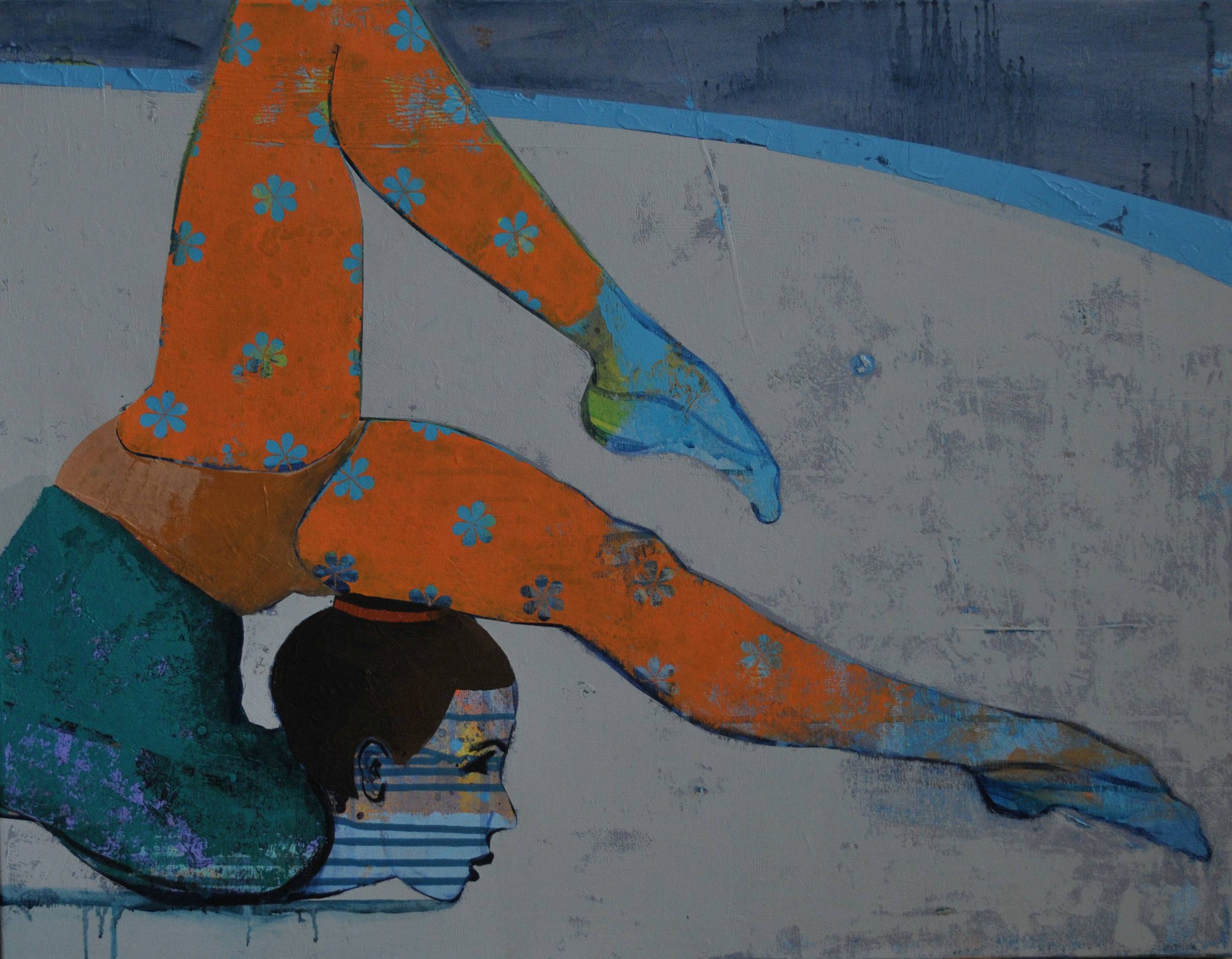 Obraz zachwyca śmiałą kolorystyką i niecodzienną kompozycją. Dominuje pomarańczowy odcień materiału, ozdobiony delikatnymi, niebieskimi kwiatkami. Wzory są wyraźne, ale nie przytłaczające, dodają lekkości. Tło jest stonowane, szarawe, co podkreśla dynamiczny układ ciała figury. Artysta umiejętnie bawi się kształtami, zginając ciało w nienaturalnej pozycji. Wzbudza to poczucie zaskoczenia i podziwu. Atmosfera obrazu jest surrealistyczna, może nawet nieco nostalgiczna. Takie troszkę dreamy. Styl jest odrealniony, przypominający pop-art z nutą abstrakcji. Technika, jaką posłużył się artysta, to mieszanka płaskiej plamy barwnej z teksturami, które potęgują głębię i zainteresowanie. Czujemy się jak w magicznej krainie, gdzie wszystko jest możliwe. Obraz może wywoływać różne emocje – od zadumy po radość. Zastanawia, jak trudno być tak elastycznym! Myślę sobie: "Ja też bym tak chciał". Dzieciak powiedziałby: "Ale fajnie się wygina!". Coś w tym jest z dziecięcej swawoli. Dzięki tej wizji możemy choć na chwilę poczuć się jak w świecie wyobraźni. Ten artysta zna się na rzeczy, nie można zaprzeczyć.