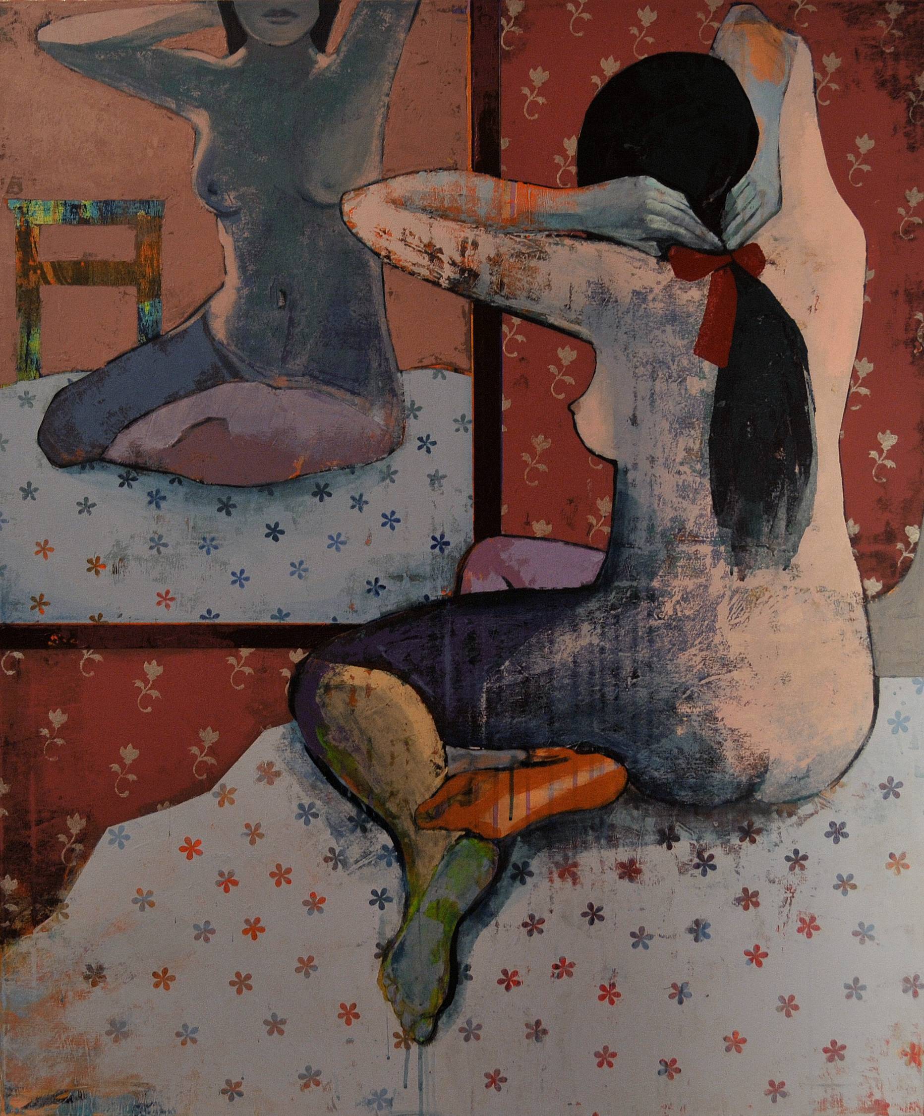 Obraz przedstawia kobietę siedzącą przed lustrem. Dominuje tu paleta ciepłych kolorów: pomarańcze, czerwienie, beże, które nadają pracy przytulny, niemal intymny nastrój. Kompozycja jest intrygująca – kobieta widzi swoje odbicie, co wprowadza ciekawą dynamikę i podział obrazu. Wzory na ścianie są delikatne, przypominając tapetę z czasów naszych babć. Nastrój emanuje spokojem, może nutką nostalgii. Styl artysty łączy impresjonistyczny dotyk z elementami sztuki nowoczesnej. Technika jest wyjątkowa, zaznaczona lekkimi maznięciami pędzla, co dodaje tekstury. To, co najbardziej przyciąga uwagę, to emocje. Czy kobieta jest spokojna, rozmyśla nad czymś? Może po prostu cieszy się chwilą "me time"? Pociąga mnie ten moment. Myślę sobie, że artysta chciał uchwycić coś ulotnego. Sprawia, że czuję się ciepło na sercu. Może dlatego myślę "co za pięstie piękny dzień". Kto wie, jaka historia kryje się za tym obrazem. Myśle półżartem – może artysta po prostu bawił się farbami. Ale właśnie to – playfulness – nadaje dziełu lekkość. Zagapiam się i odpływam myślami.