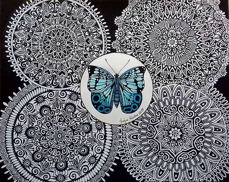 Metoda kolażu, motyl wykonany na papierze akwarelowym jest wklejony w środek. Motyl wykonany akwarelą i czarnymi cienkopisami. Mandale wykonane czarnymi cienkopisami na białym papierze. Praca z 2019 roku, 39x48 cm.