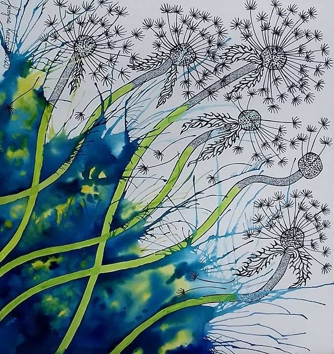 akwarele + czarne cienkopisy, 38x41 cm, 2020 rok