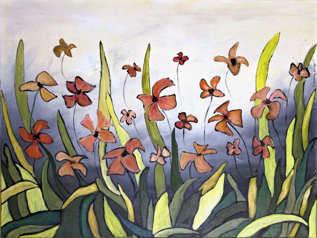 Obraz tętni życiem i kolorami, które przyciągają wzrok jak magnes. Dominuje tu ciepła paleta odcieni pomarańczy, zieleni i subtelnych beży. Kwiaty przypominają tańczące postacie, a ich zróżnicowane kształty i rozmiary tworzą dynamiczną kompozycję. Tło jest stonowane, co sprawia, że flora wydaje się jeszcze bardziej wyrazista. Atmosfera tego dzieła jest beztroska i nieco sielankowa, niczym letni dzień w ogrodzie. Artystyczny styl przypomina nieco impresjonizm. Luźne pociągnięcia pędzla i delikatne linie nadają całości lekkości. Można wręcz poczuć wiatr, który delikatnie porusza rośliny. Emocje, jakie wzbudza obraz, są spokojne i radosne. Można się zrelaksować i poczuć wolnym od codziennych trosk. Dziecko powiedziałoby: "Patrz mamo, te kwiatki tańczą jak wróżki!" Takie uczucie childhood wonder potrafi wywołać tylko sztuka. Obraz skłania do refleksji nad pięknem natury, jej kruchością i ulotnością. Każdy widz może inaczej zinterpretować te tańczące kwiaty. Może to metafora życia pełnego zmian, które pomimo wszystko zachwyca swoją nieprzewidywalnością? To dzieło jest prawdziwą ucztą dla zmysłów.