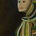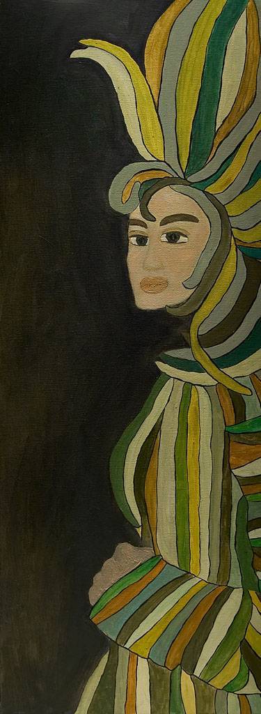 Na obrazie dominują ciemne tony, kontrastujące z jaskrawymi, błyszczącymi żółtymi i zielonymi pasami. Postać wydaje się być zanurzona w tej kolorowej eksplozji, a kształty przypominają liście lub pióra, które otaczają jej twarz. Centralnym punktem kompozycji jest tajemnicza postać, której spojrzenie skierowane jest w bok. To nadaje całości aurę intrygi. Artystyczny styl obrazu przypomina impresjonizm z delikatnymi akcentami secesyjnych zdobień widocznych w krzywoliniowych formach. Sposób, w jaki artysta operuje pędzlem, sprawia wrażenie, jakby próbował uchwycić chwilę między snem a jawą. Można by powiedzieć: "It's a mystery!" Ta subtelna gra barw i świateł może wprowadzać widza w atmosferę tajemnicy i refleksji. Wyobrażam sobie, że siedmiolatek mógłby stwierdzić: "To jakiś kosmiczny motyl!" Obraz wywołuje delikatny niepokój, ale też fascynację. Osobiście czuję się zaintrygowany, próbując odczytać historię tej niezwykłej postaci. Wizja ta hipnotyzuje, pozostawia ślad w myślach. To niesamowite, jak kolory mogą tchnąć życie w statyczne formy, jednocześnie poruszając i uspokajając.