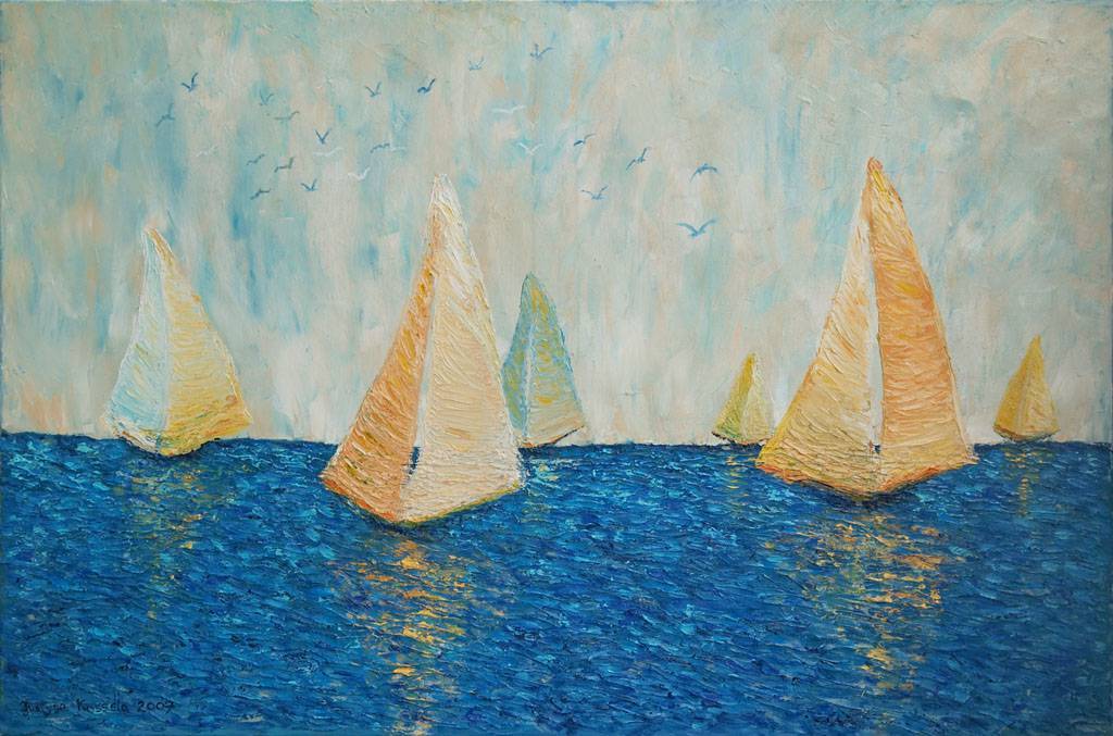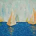 Na obrazie widzimy kilka żagli sunących po niespokojnym morzu. Kolory dominujące to błękit oceanu i ciepłe odcienie żagli – żółcie, pomarańcze oraz blade beże. Artysta skomponował to dzieło, skupiając się na kontrastach: ciemnoniebieska tafla wody doskonale podkreśla jasne żagle. Atmosfera obrazu jest uspokajająca, przypomina letni dzień spędzony na plaży. Czuć w powietrzu delikatny "breeze", który pieści twarz. Styl jest impresjonistyczny, jakby artysta użył szybkich, pewnych pociągnięć pędzlem, tworząc teksturowaną powierzchnię. To obraz, który przywołuje wspomnienia słońca i wolności. Patrząc na niego, można poczuć radość i spokój wewnętrzny, choć ktoś inny mógłby odczuć nostalgię za dniem spędzonym na wodzie. Może się wydawać jak dzieło namalowane przez dziecko z jego prostotą i autentycznością. Kolory są ciepłe i przyjazne, a cała scena tchnie optymizmem. „Tam są łódki!” – mógłby powiedzieć zachwycony malec, dziewczyna czy chłopak, patrząc na obraz. Zanurzasz się w tym dziele i czujesz, jakbyś był na pokładzie jednej z tych łódek, całkowicie oddany euforii chwili.