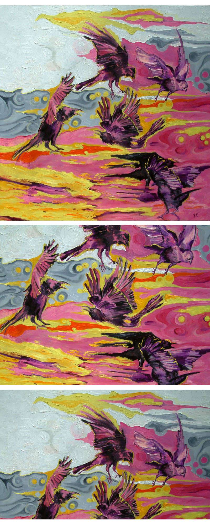 Obraz emanuje feerią barw, którymi dominują intensywne odcienie fioletu, różu i żółci. Kształty ptaków, niczym sylwetki w dynamicznym locie, zdają się tańczyć na płótnie, dodając życia całej kompozycji. Przestrzeń wypełniają spiralne wzory chmur, które oplatają się wokół ptaków, jakby były częścią ich wędrówki. Atmosfera obrazu jest pełna ruchu i energii. Artysta zastosował techniki impastu, nadając kompozycji trójwymiarowość, gdzie grube nałożenie farby tworzy strukturę "wow", którą chce się dotknąć. Nastrój jest zarówno pełen swobody, jak i pewnej nostalgii – może wywoływać skojarzenia z wolnością lub marzeniami o nieuchwytnym horyzoncie. Dzieło to może budzić wiele emocji, od radości po refleksję. I te kropki są jak bańki! To przypomina nam o ulotnych chwilach, które warto łapać i doceniać. Styl artystyczny można określić jako mieszankę ekspresjonizmu z elementami surrealizmu, co daje odbiorcy przestrzeń do własnych interpretacji. W tym zgiełku kolorów i form, można niemal poczuć wiatr, który wieje między skrzydłami ptaków, niosąc ze sobą ich wspomnienia i sekrety. Podsumowując, obraz jest znakomitym przykładem sztuki, która łączy w sobie dynamikę i subtelność, pozostawiając odbiorcę z poczuciem zachwytu oraz chwilą zadumy nad pięknem natury.