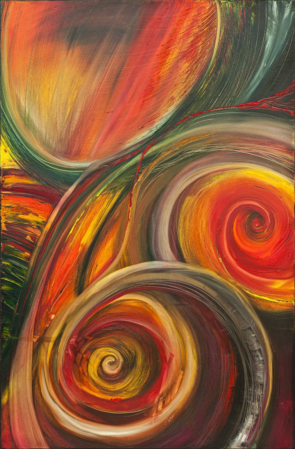Obraz tętni życiem dzięki intensywnym kolorom i dynamicznym kształtom. Dominują tu odcienie ciepłej czerwieni, pomarańczu i złotego żółtego, które przeplatają się z głębokimi zieleniami, tworząc wirujące spirale. To tak, jakby artysta stworzył malarską symfonię, w której każdy kolor gra swoją rolę. Kompozycja jest chaotyczna, ale w tym chaosie jest pewna logika, jakby ukryty rytm. Nastrój obrazu jest energetyczny, emanuje z niego pewna niepokój, a jednocześnie zachęta do eksploracji. Artysta zastosował technikę impasto, widoczne są grube warstwy farby, które dodają głębi i teksturze. Patrząc na to dzieło, można poczuć przyspieszone bicie serca. Czy te wiry to tańcząca energia, czy może emocje w rozpędzie? Obraz przypomina o wiecznej dynamice życia, o tym, że nic nie jest stałe. Może to obraz wielkiego tornado emocji. Podświadomie można się zastanawiać: “What’s next?”. Ten obraz mówi do nas, jakby chciał powiedzieć: nie bój się zatopić w chaosie. Dla mnie, osobiście, to przypomnienie o sile twórczego szału. Yyy... A cóżby powiedziało dziecko: tak to wyglądałoby, gdyby farby zatańczyły na papierze.