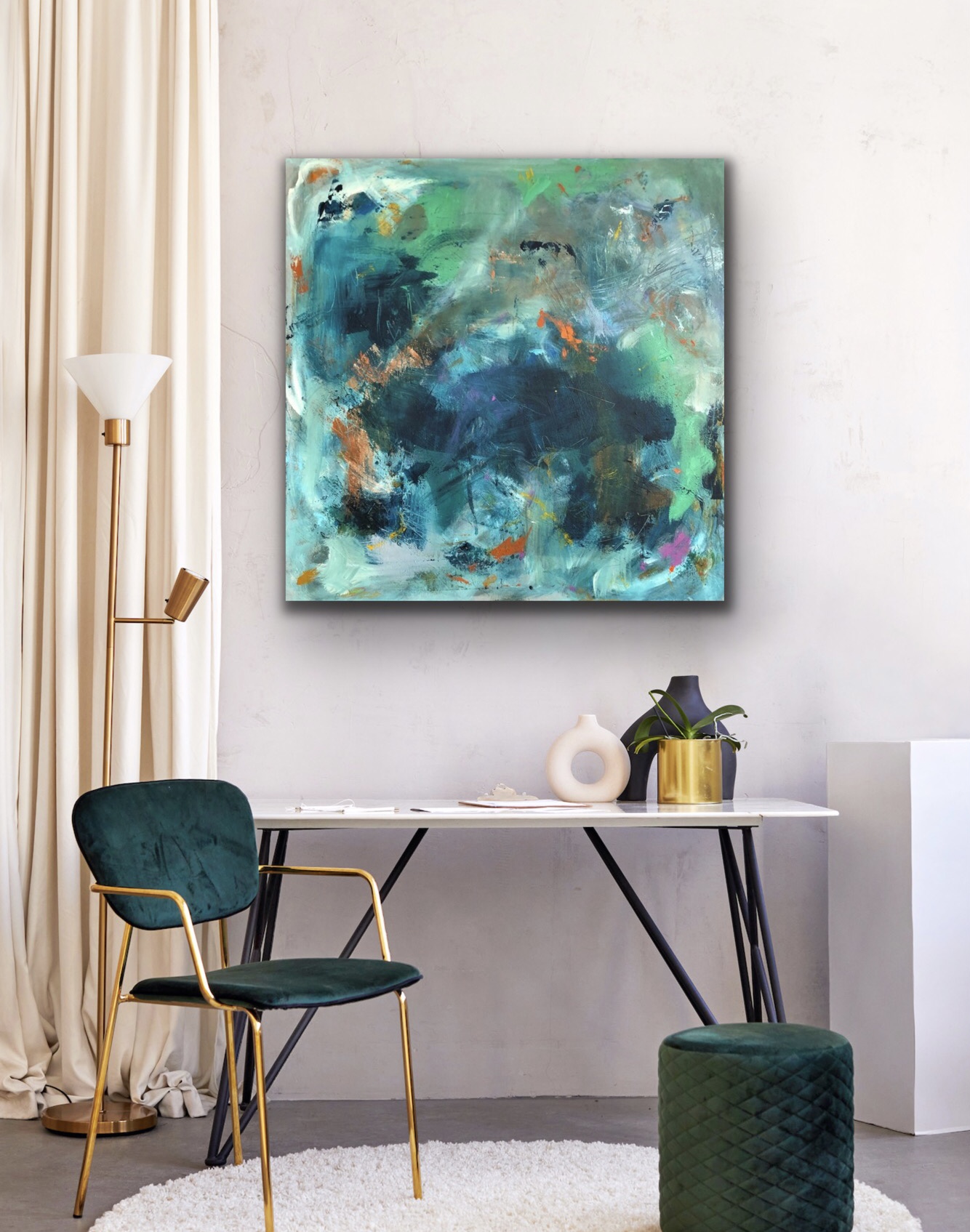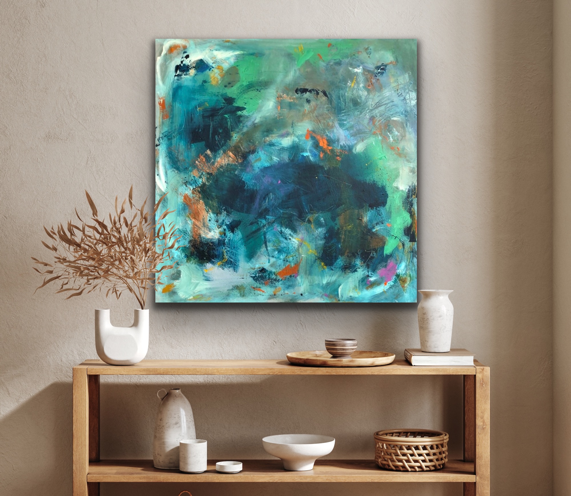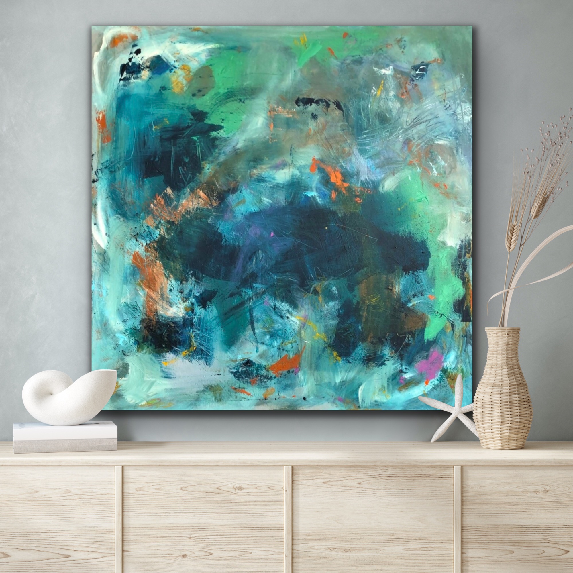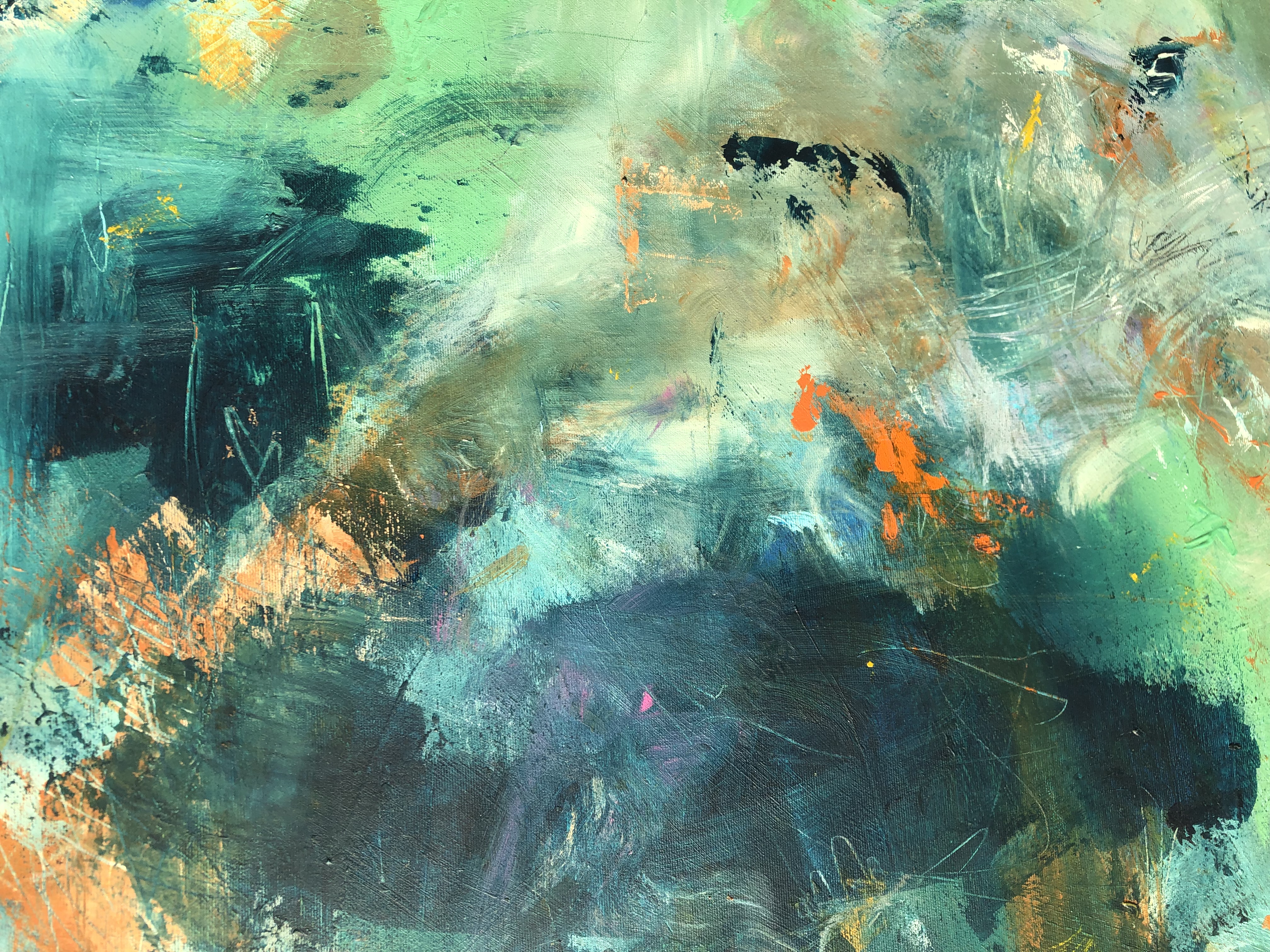 Obraz kipi kolorami, które wirują w chaotycznym tańcu. Niebiesko-zielona paleta barw dominuje, tworząc wrażenie zanurzenia się w podwodnym świecie. Plamy błękitu i zieleni, przecinane pomarańczowymi akcentami, wyglądają jak fale rozbijające się o skały. Większa ciemna plama na środku wprowadza nutę tajemnicy i głębi. Kompozycja jest dynamiczna, nieustannie zmieniająca się i płynna. Obraz emanuje energią i pewnym niepokojem, jakby opowiadał o burzy na morzu. Artysta posługuje się techniką impasto, nadając obrazowi teksturę, która dodaje mu trójwymiarowości. Widoczne pociągnięcia pędzla tworzą ruch i dynamikę. To dzieło może budzić w odbiorcy poczucie zagubienia, ale i fascynacji. Poczucie niesamowitości i wrażenie, że jest się częścią czegoś większego, jest nie do odparcia. To jakby zanurzyć się w nieznanej opowieści.