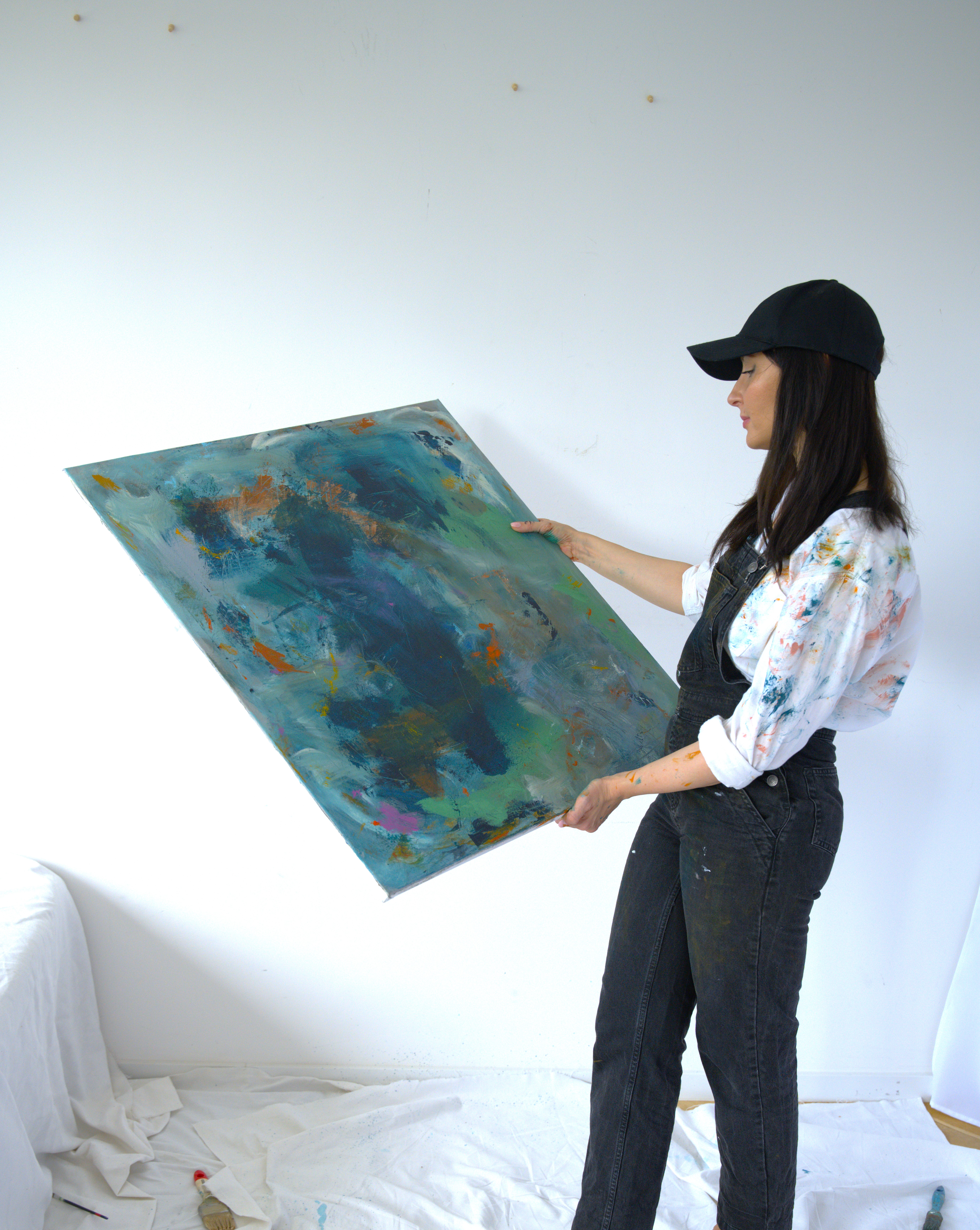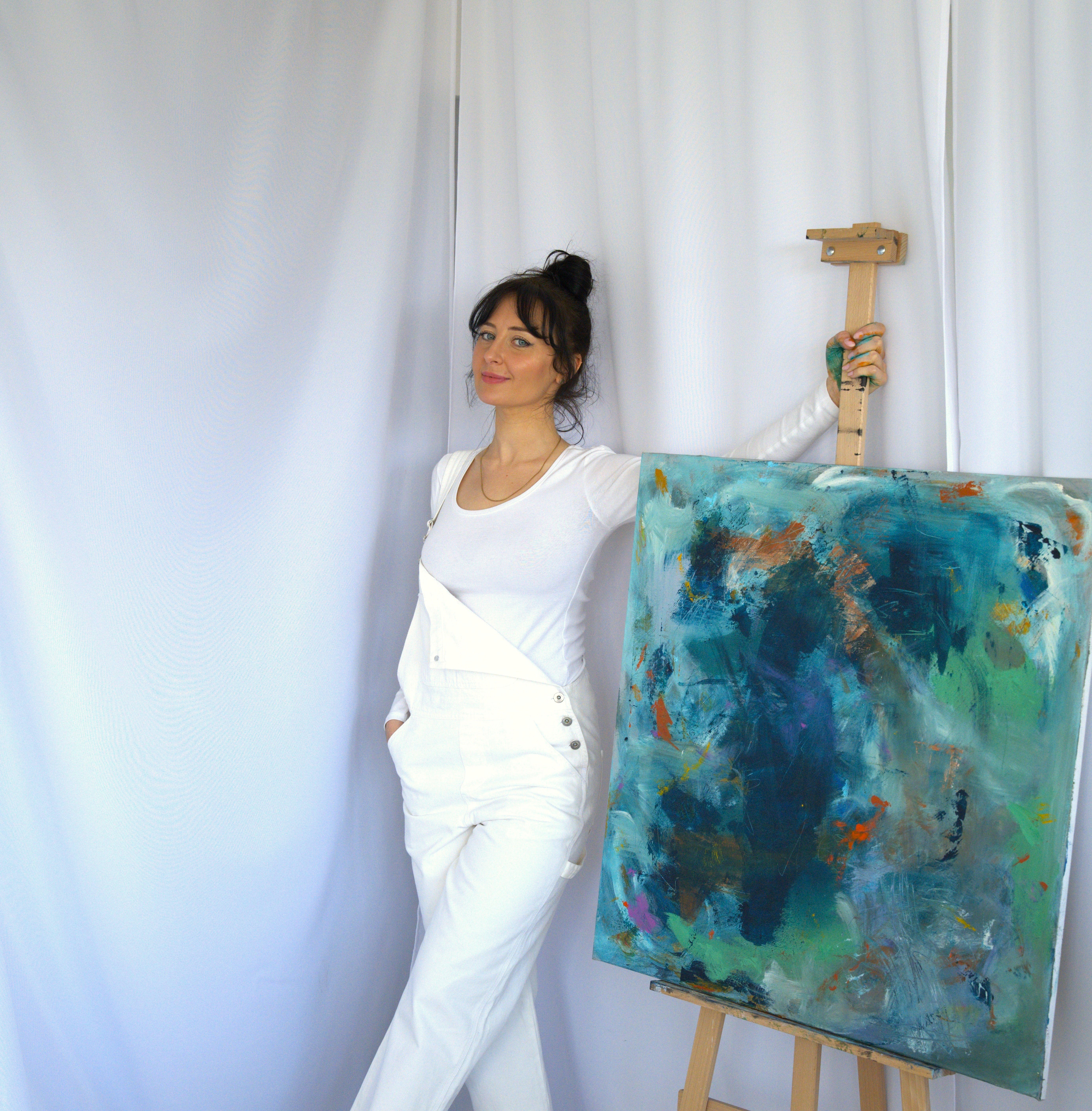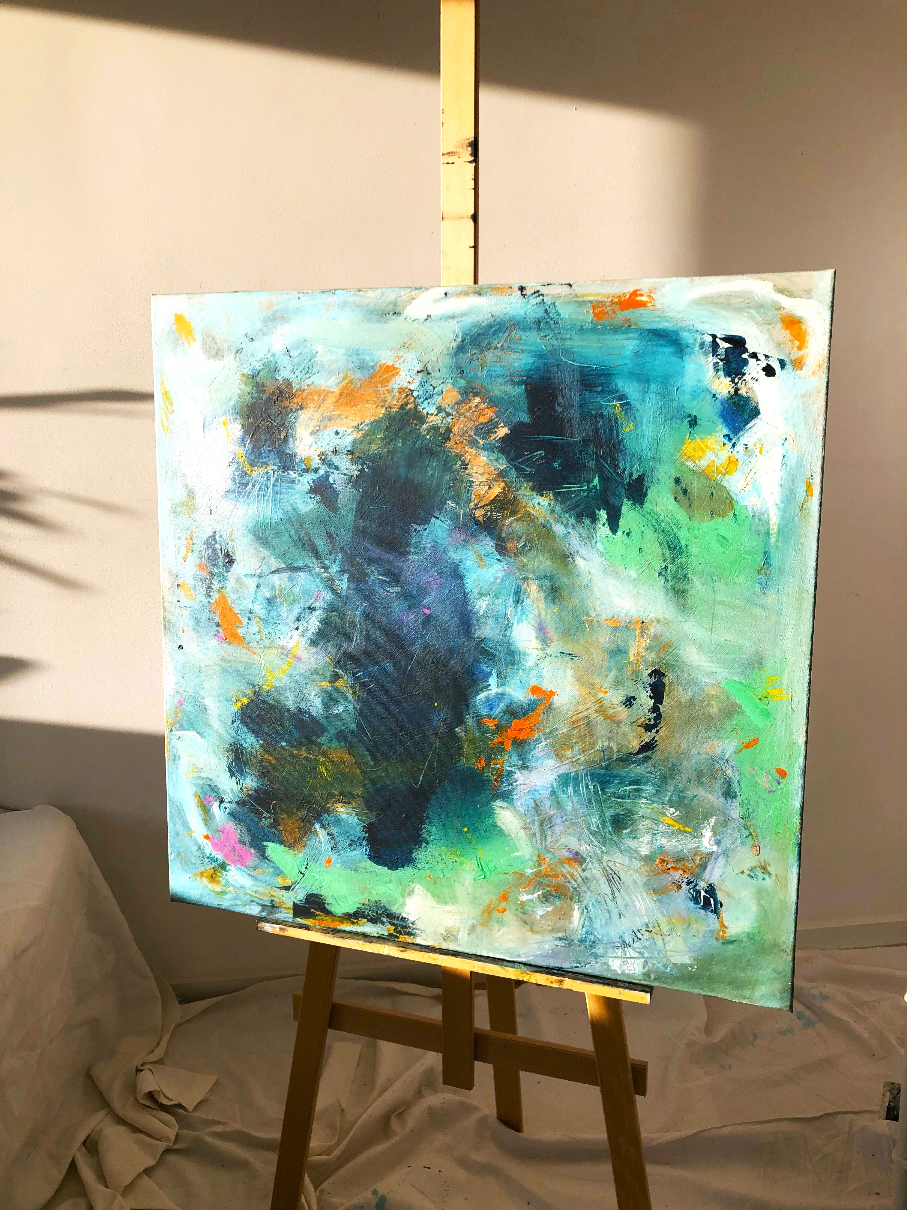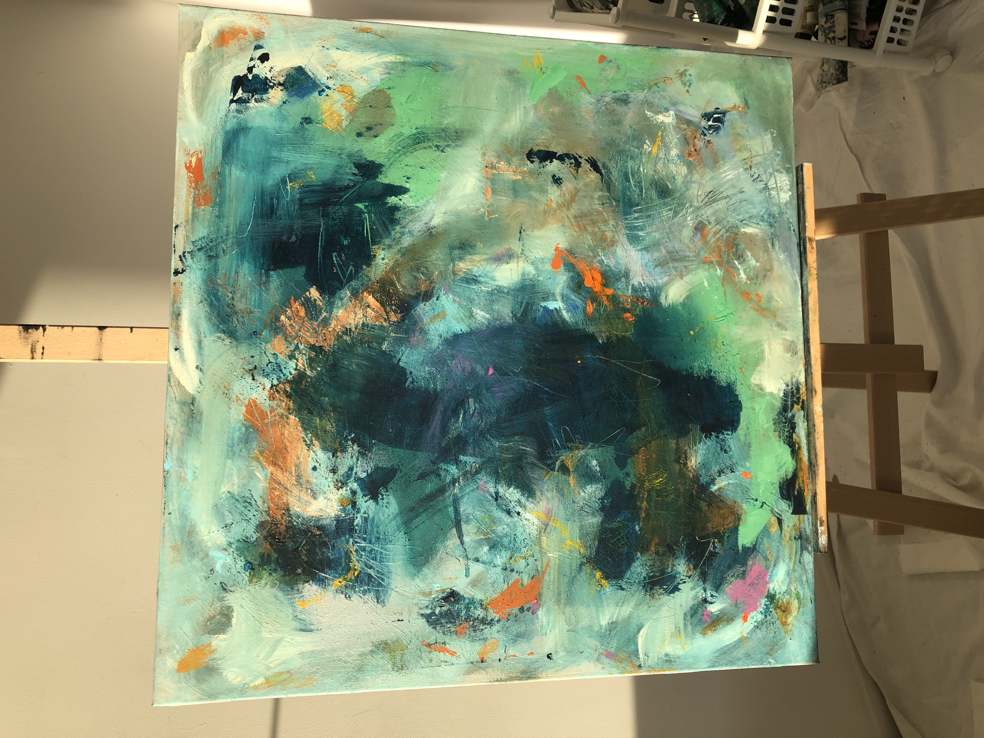 Obraz kipi kolorami, które wirują w chaotycznym tańcu. Niebiesko-zielona paleta barw dominuje, tworząc wrażenie zanurzenia się w podwodnym świecie. Plamy błękitu i zieleni, przecinane pomarańczowymi akcentami, wyglądają jak fale rozbijające się o skały. Większa ciemna plama na środku wprowadza nutę tajemnicy i głębi. Kompozycja jest dynamiczna, nieustannie zmieniająca się i płynna. Obraz emanuje energią i pewnym niepokojem, jakby opowiadał o burzy na morzu. Artysta posługuje się techniką impasto, nadając obrazowi teksturę, która dodaje mu trójwymiarowości. Widoczne pociągnięcia pędzla tworzą ruch i dynamikę. To dzieło może budzić w odbiorcy poczucie zagubienia, ale i fascynacji. Poczucie niesamowitości i wrażenie, że jest się częścią czegoś większego, jest nie do odparcia. To jakby zanurzyć się w nieznanej opowieści.