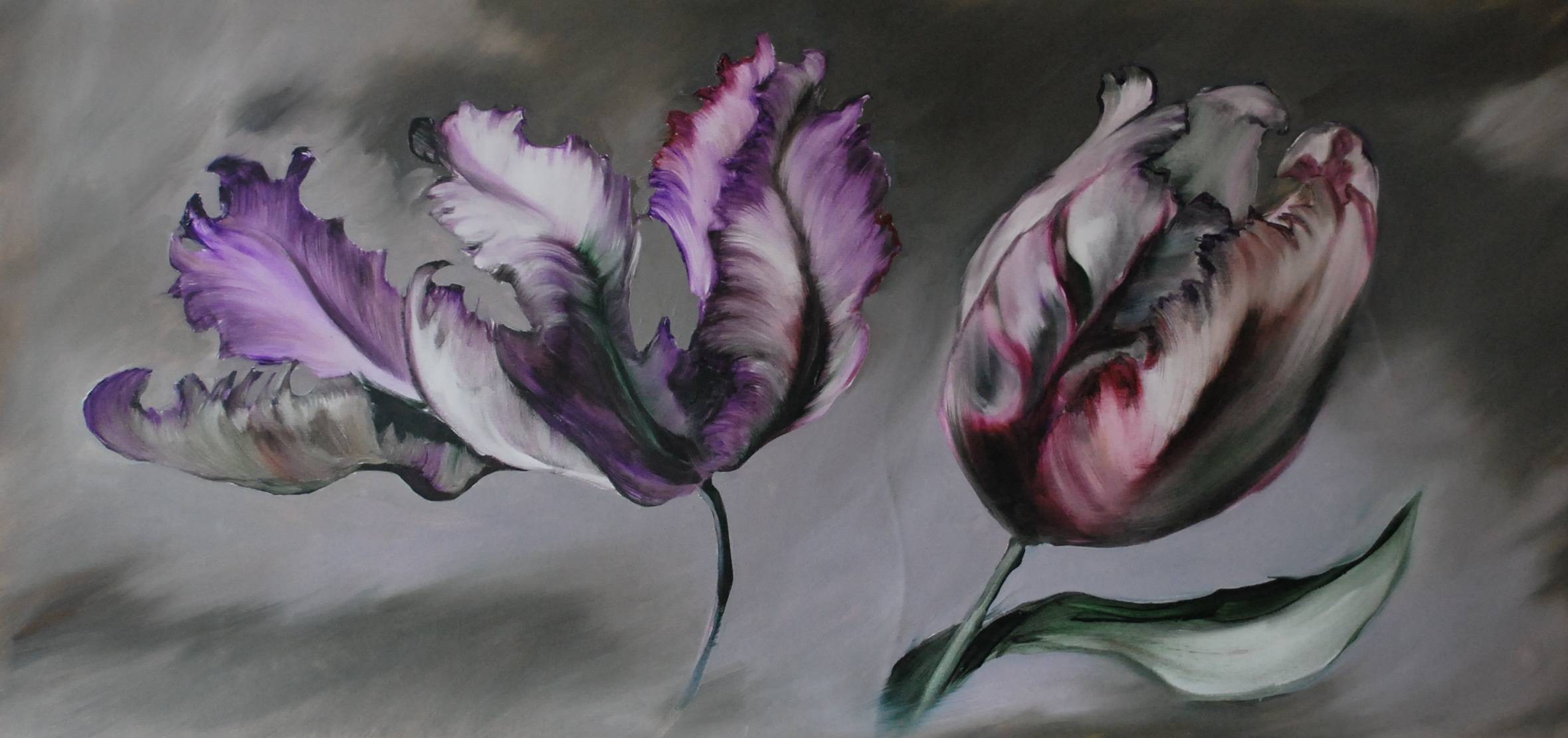 Na obrazie widzimy dwa imponujące tulipany, które zdają się tańczyć na tle tajemniczej szarości. Kolory kwiatów są wyjątkowo bogate, zdominowane przez odcienie fioletu i różu, które płynnie przechodzą między sobą jak w magicznym dream. Kształty płatków są dynamiczne, pełne ruchu i elegancji, przypominając falujące morze. Całość jest skomponowana tak, że tulipany zdają się być w centrum wszechświata, chociaż tło jest subtelnie zamglone, co nadaje obrazowi pewnej eterycznej jakości. Atmosfera jest melancholijna, ale jednocześnie pełna wdzięku. Techniki artystyczne wskazują na niezwykłą biegłość w operowaniu paletą barw i światłocieniem. Artysta użył najwyraźniej technik olejnego malarstwa, co dodaje głębi i realizmu obrazu. Kwiaty emanują mocą wyrazu i mogą wywołać w widzu całą gamę emocji. Od zachwytu po zadumę nad ulotnością piękna w naturze. Może przypominać spacer w ogrodzie o poranku, kiedy wszystko jest jeszcze świeże i pełne życia. Ja też chcę tak namalować! Wykorzystując mix formalnego i swobodnego tonu, interpretacja obrazu może dotknąć osobistych wspomnień lub marzeń. Patrząc na to dzieło, można poczuć tęsknotę za ciepłymi, wiosennymi dniami. Pejzaż ten, mimo swojej prostoty, ma w sobie coś niezwykle hipnotyzującego i pozwala na chwilę zapomnieć o codziennym pośpiechu.