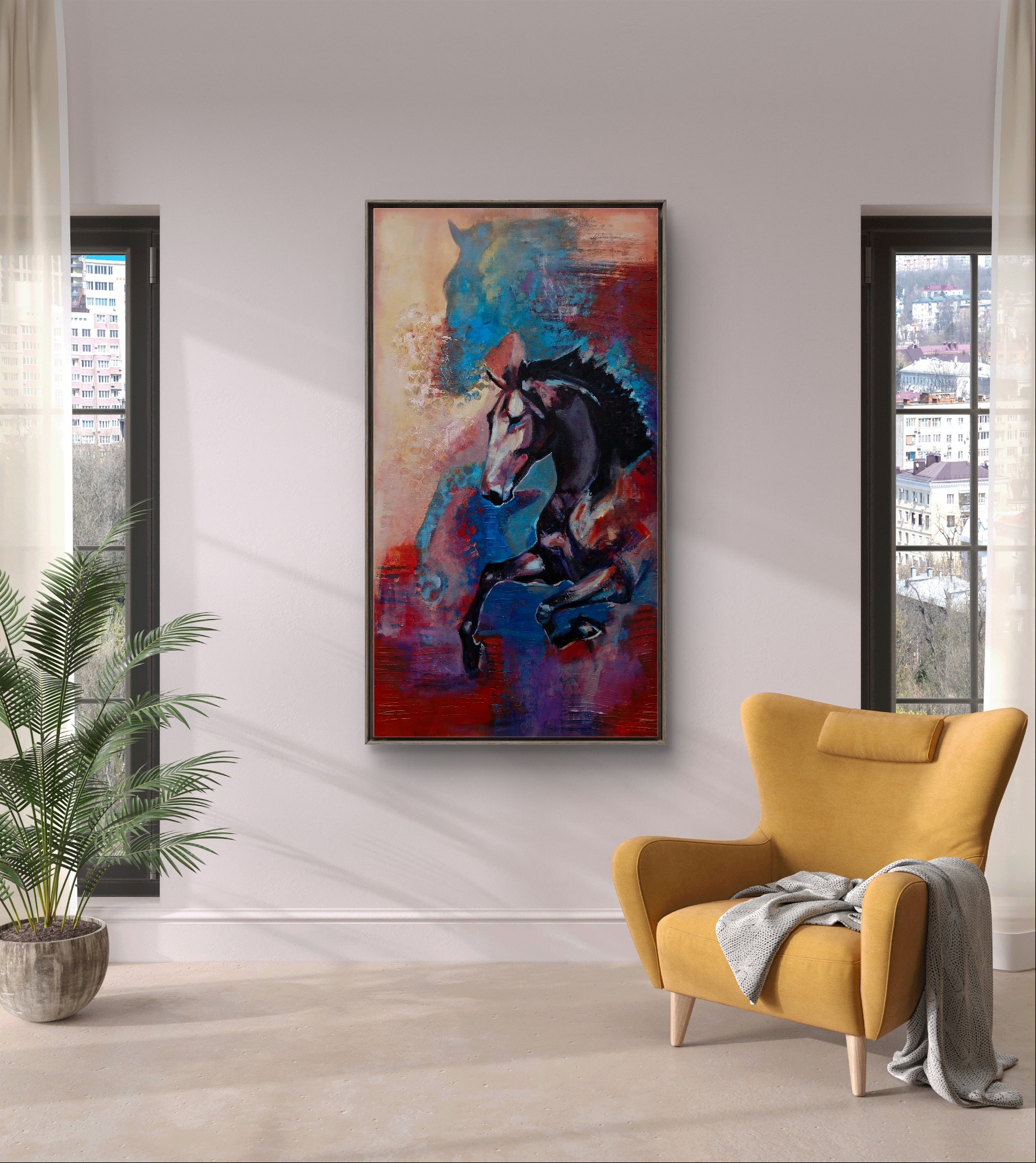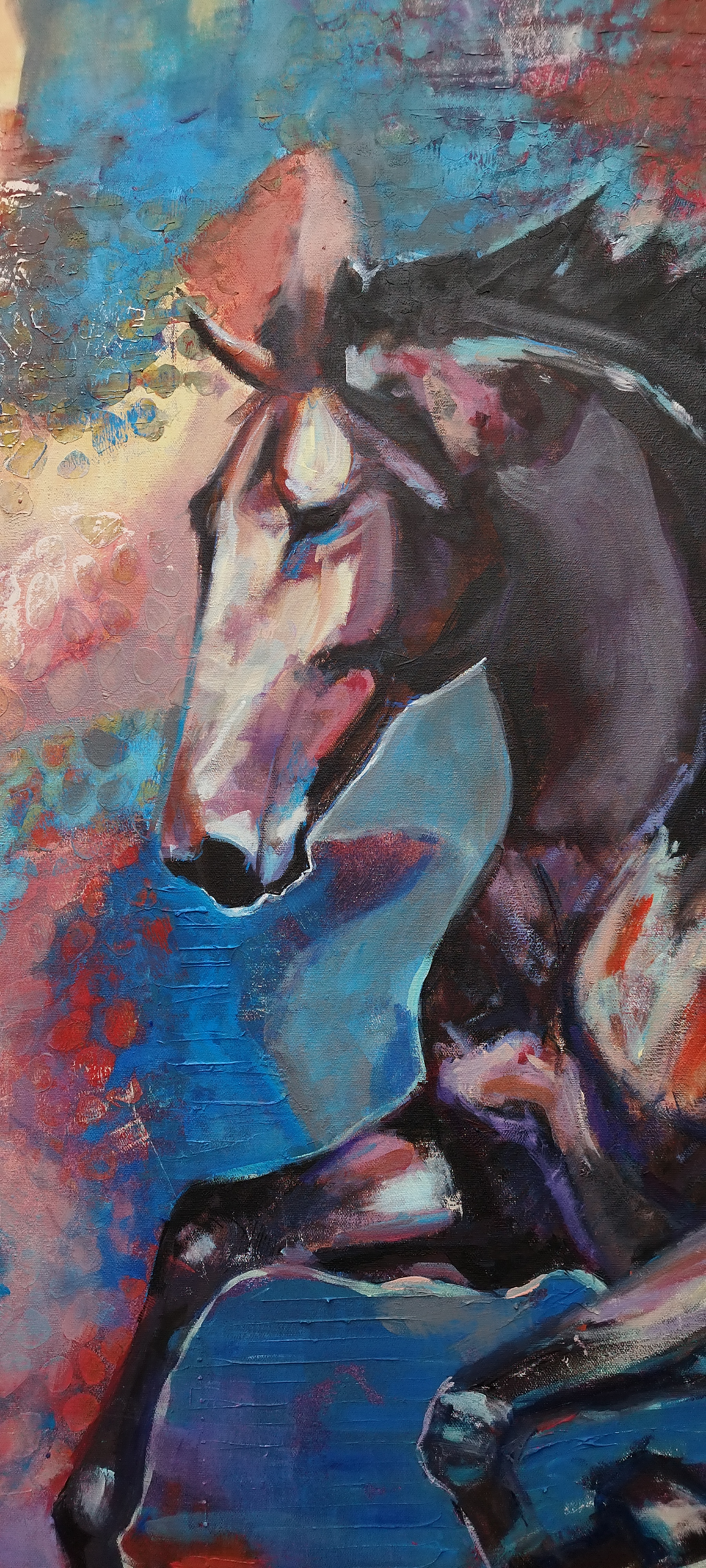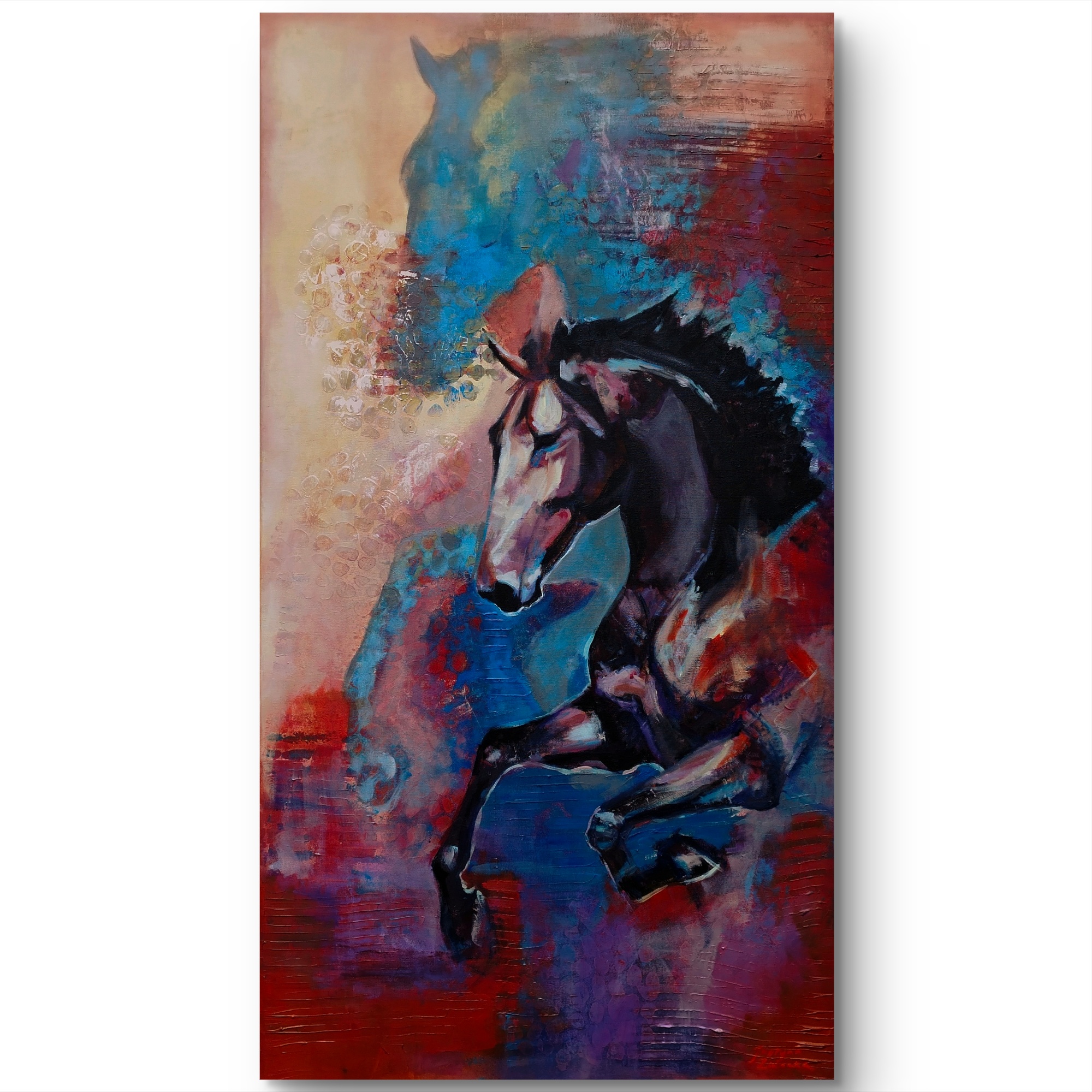 Obraz ukazuje dynamicznie uchwyconego konia, którego sylwetka niemalże wyskakuje z płótna. Dominują tu intensywne kolory - czerwienie, błękity i fiolet. Pałętają się po całej powierzchni, tworząc niesamowitą dynamikę i energię dzieła. Kompozycja jest żywa, pełna ruchu i emocji. Wydaje się, jakby koń zaraz miał ożyć i uciec przed siebie. Tą niesamowitą atmosferę potęguje przykładanie przez artystę uwagi do detalu. Warstwy farby nakładają się, tworząc efekt trójwymiarowości. Nastrój tego obrazu jest pełen spontaniczności i wolności. Jakby coś pykało w środku. Czy patrząc na niego, nie czujesz chęci ruszenia w galop marzeń? Styl artystyczny zdradza wpływy ekspresjonizmu. Techniki mieszania farb olejnych czy akrylowych przypominają brawurowe pociągnięcia pędzla, którym towarzyszy dzika radość tworzenia. Dla odbiorców ten obraz może wywołać skrajne emocje. Dzieciom przypomina bajkę, w której wszystko jest możliwe. Może też budzić refleksje o nieokiełznanej naturze i tęsknocie za wolnością. Could it be any more expressive? Osobiście czuję, jakbym mógł wskoczyć na grzbiet tego konia i uciec gdzieś daleko.