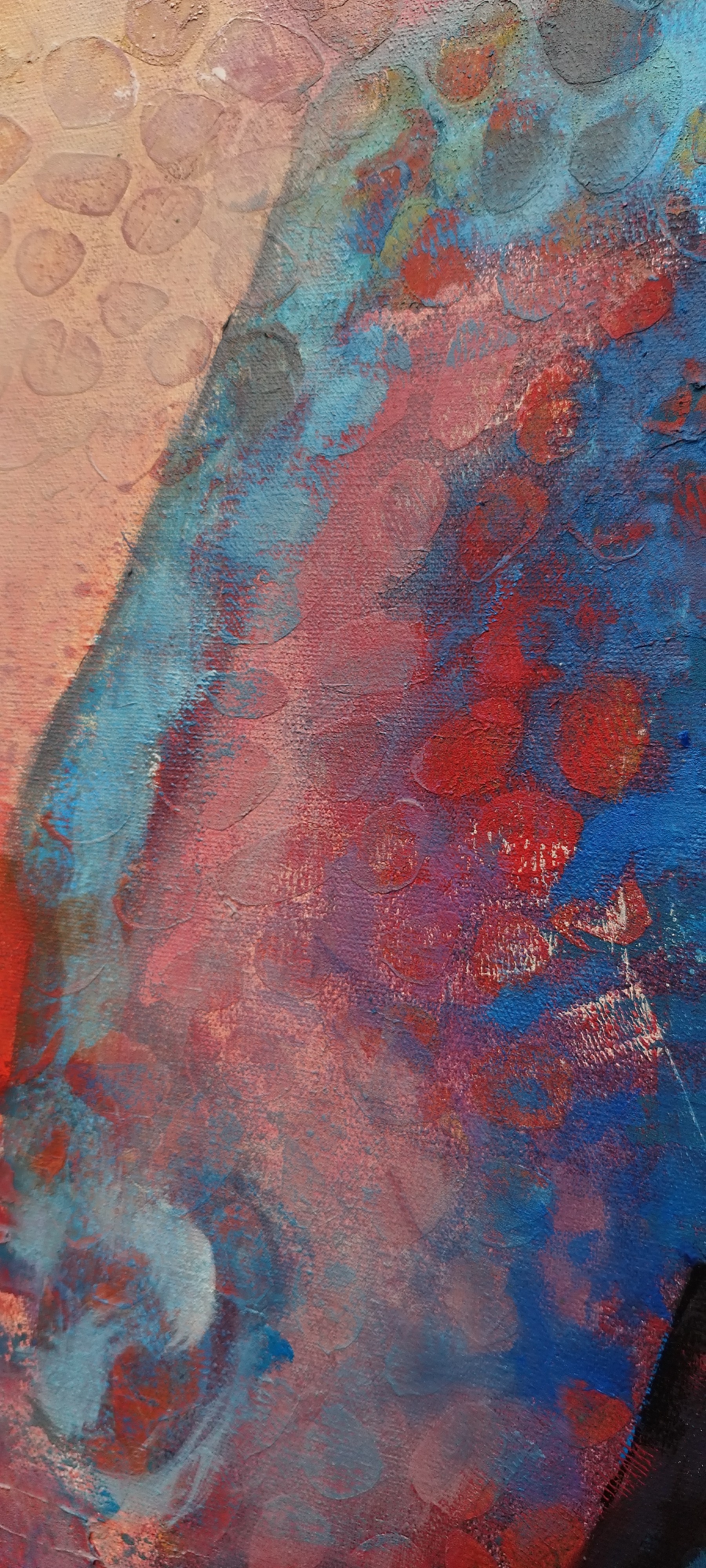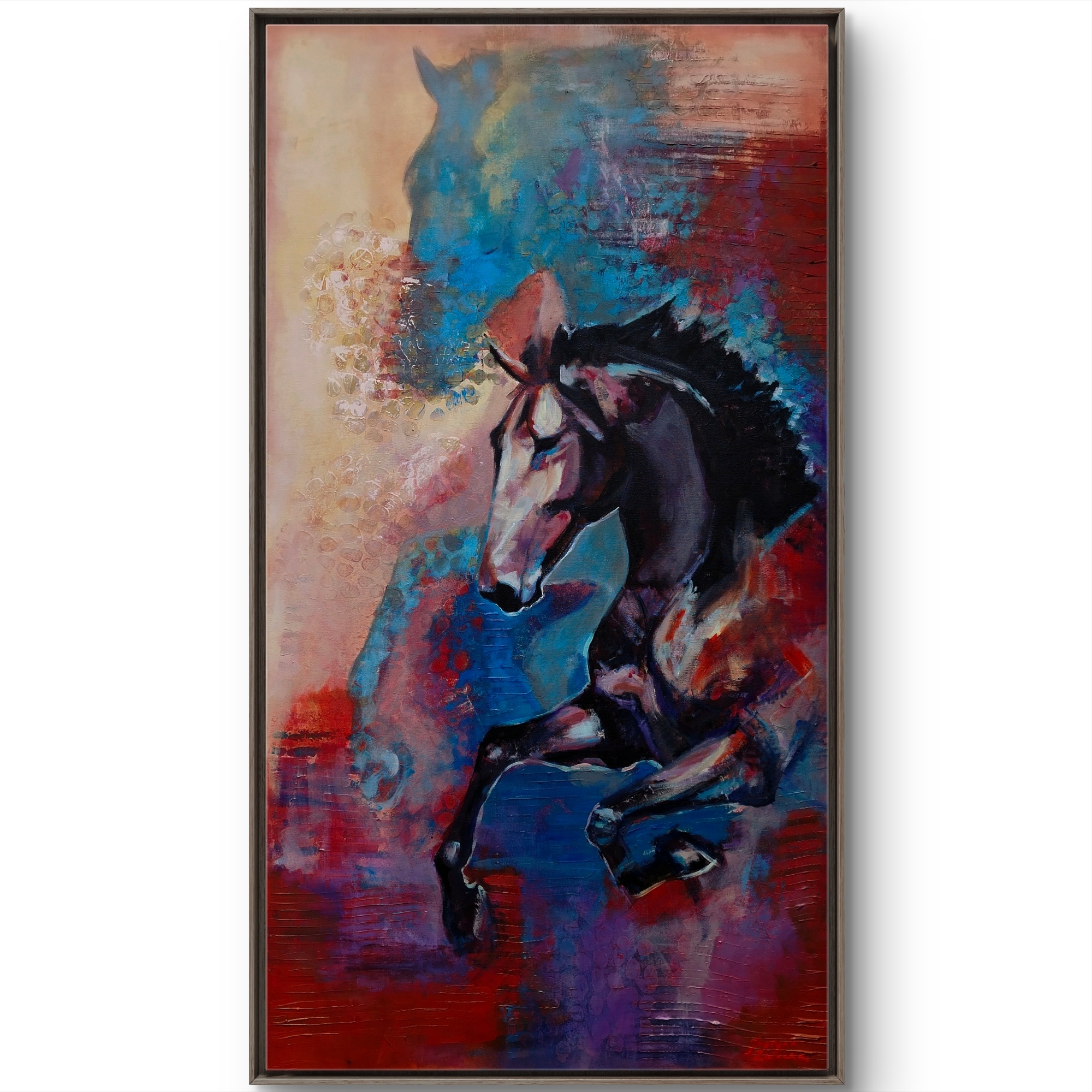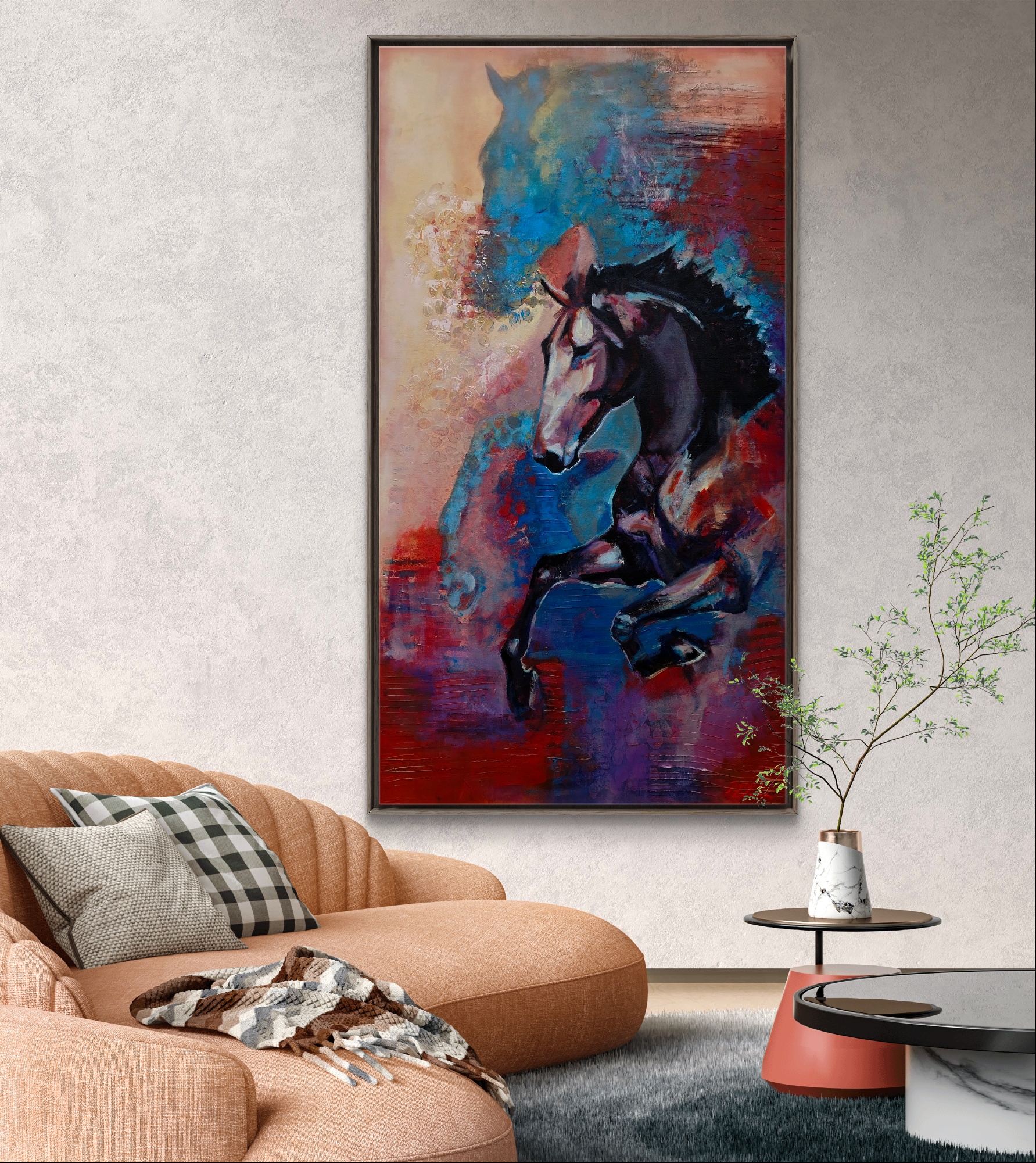 Obraz ukazuje dynamicznie uchwyconego konia, którego sylwetka niemalże wyskakuje z płótna. Dominują tu intensywne kolory - czerwienie, błękity i fiolet. Pałętają się po całej powierzchni, tworząc niesamowitą dynamikę i energię dzieła. Kompozycja jest żywa, pełna ruchu i emocji. Wydaje się, jakby koń zaraz miał ożyć i uciec przed siebie. Tą niesamowitą atmosferę potęguje przykładanie przez artystę uwagi do detalu. Warstwy farby nakładają się, tworząc efekt trójwymiarowości. Nastrój tego obrazu jest pełen spontaniczności i wolności. Jakby coś pykało w środku. Czy patrząc na niego, nie czujesz chęci ruszenia w galop marzeń? Styl artystyczny zdradza wpływy ekspresjonizmu. Techniki mieszania farb olejnych czy akrylowych przypominają brawurowe pociągnięcia pędzla, którym towarzyszy dzika radość tworzenia. Dla odbiorców ten obraz może wywołać skrajne emocje. Dzieciom przypomina bajkę, w której wszystko jest możliwe. Może też budzić refleksje o nieokiełznanej naturze i tęsknocie za wolnością. Could it be any more expressive? Osobiście czuję, jakbym mógł wskoczyć na grzbiet tego konia i uciec gdzieś daleko.