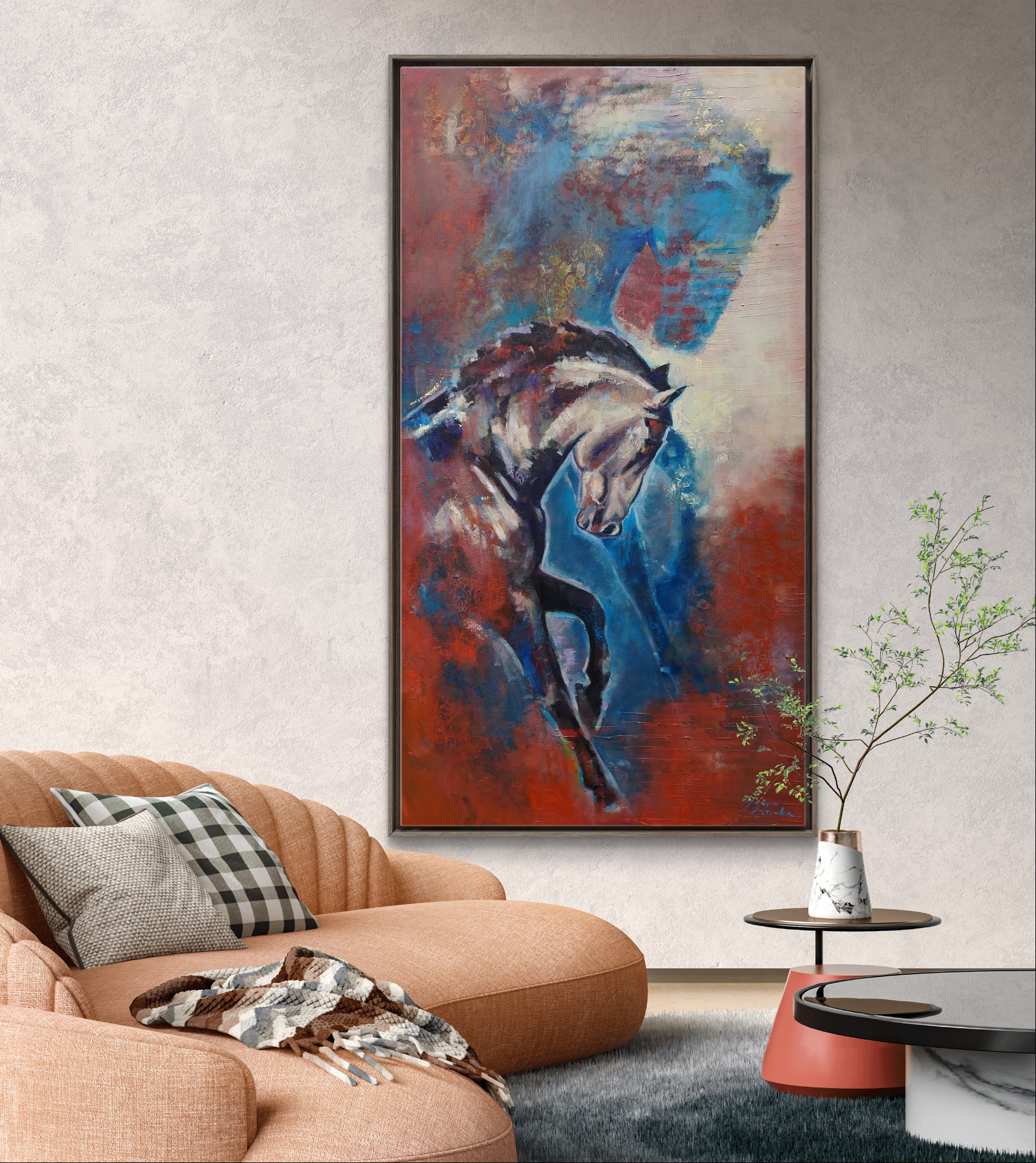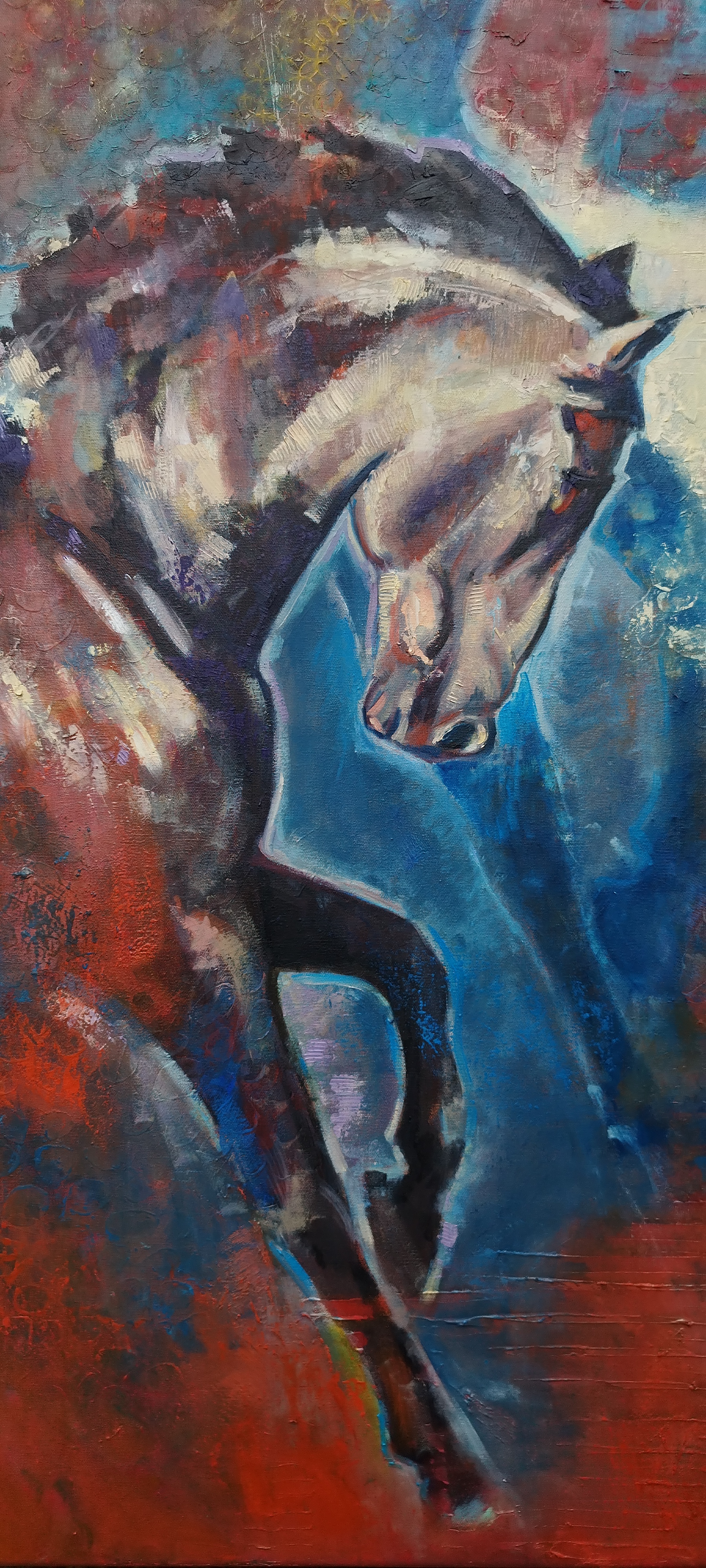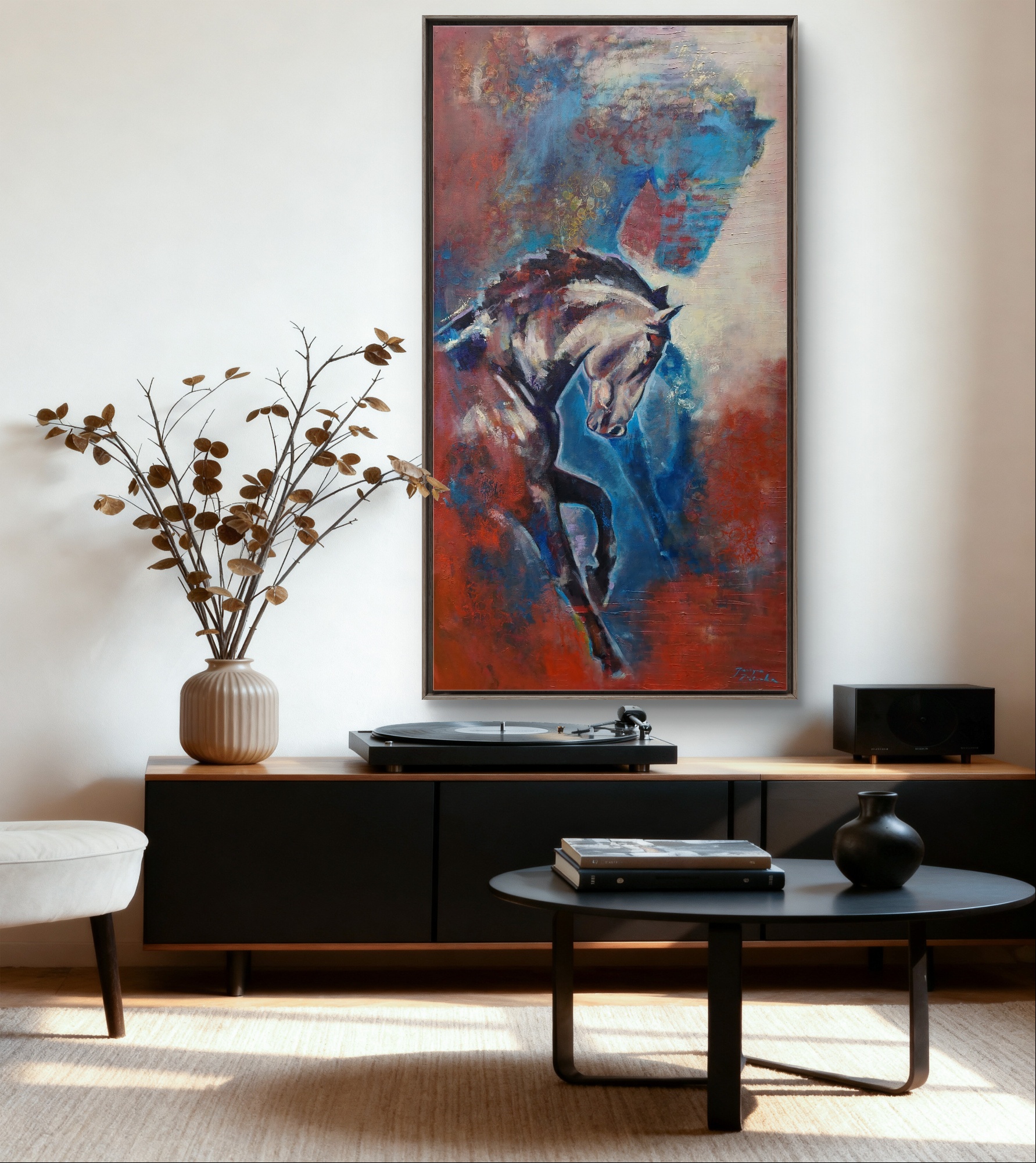 Na obrazie, pełnym życia i ruchu, dominuje majestatyczny koń. Jego sylwetka wyraźnie wyróżnia się na tle intensywnych barw – głównie odcieni błękitu, czerwieni i fioletu. Kompozycja jest dynamiczna, koń jakby zatrzymany w biegu, jego grzywa rozwiana, umaszczenie połyskujące. Kolory stapiają się i mieszają, tworząc efekt mgły unoszącej się wokół zwierzęcia. Nastrój obrazu jest niemal magiczny. Można poczuć energię i wolność, jaką emanuje ten koń. Użytkowanie rozmytych linii dodaje dziełu płynności, artyście udało się uchwycić esencję ruchu. Techniką trudną do opisania, ale przypominającą impasto, sprawiają, że dzieło jest prawdziwe "tactile". U mnie budzi to wspomnienia z dzieciństwa, kiedy konie były dla mnie jak bohaterowie. Obraz ten mógłby być symbolem siły i wolności. Głowę konia opuszczoną w taki sposób, że wydaje się, jakby myślał o czymś ważnym. Może o nieograniczonych przestrzeniach, które tylko czekają na odkrycie? Pewne jest jedno, jego widok to czysta inspiracja.