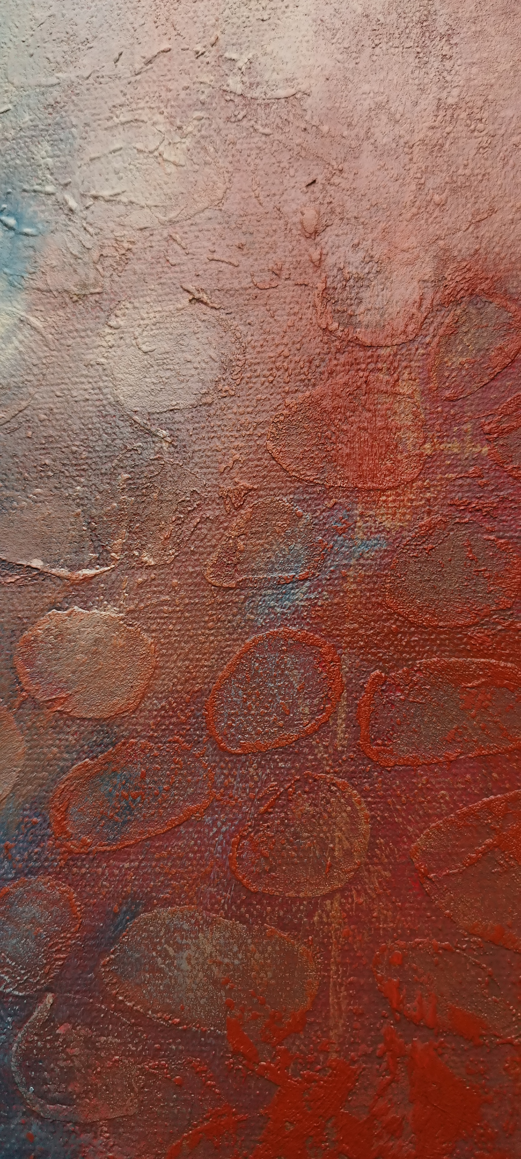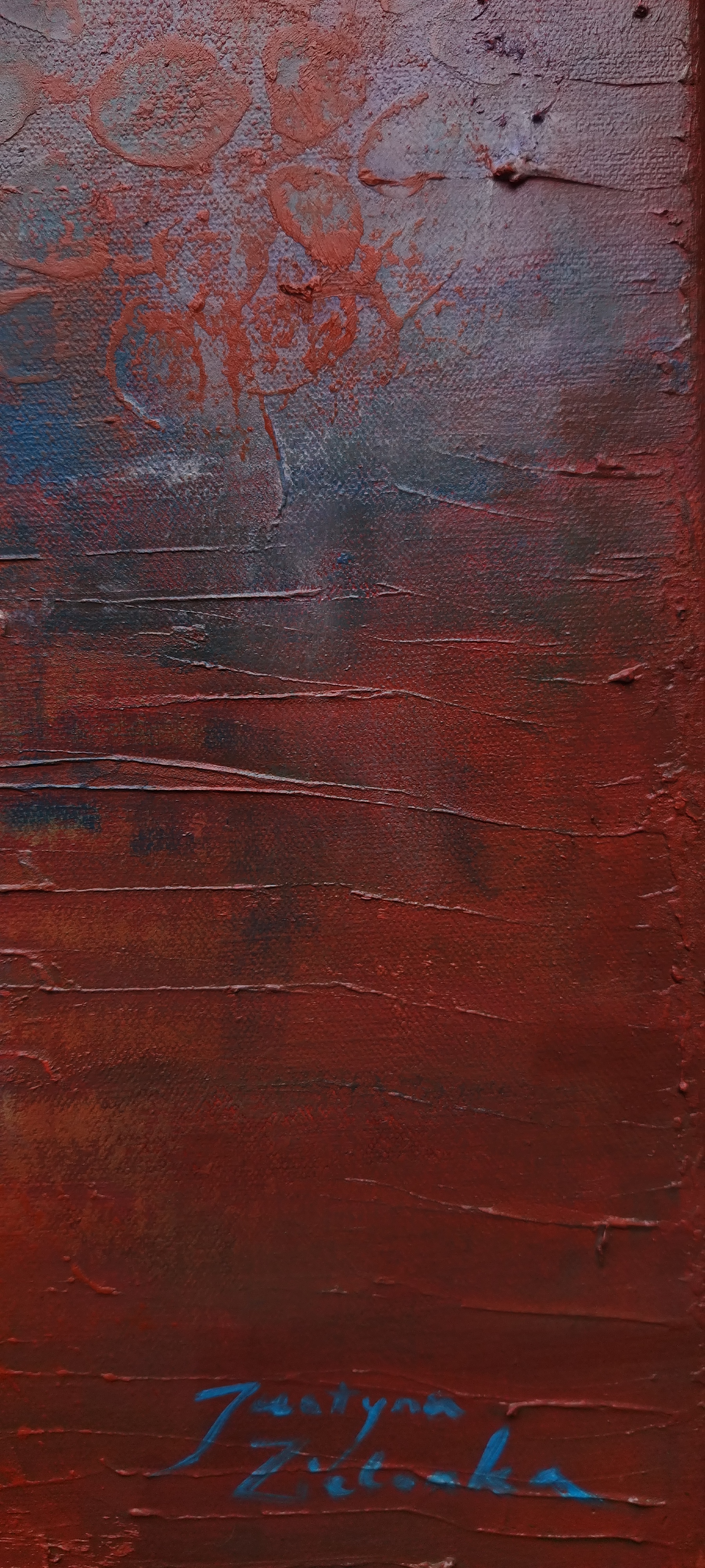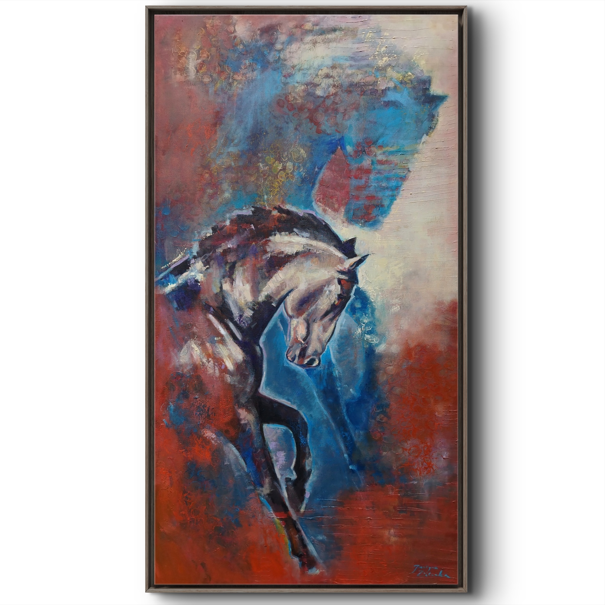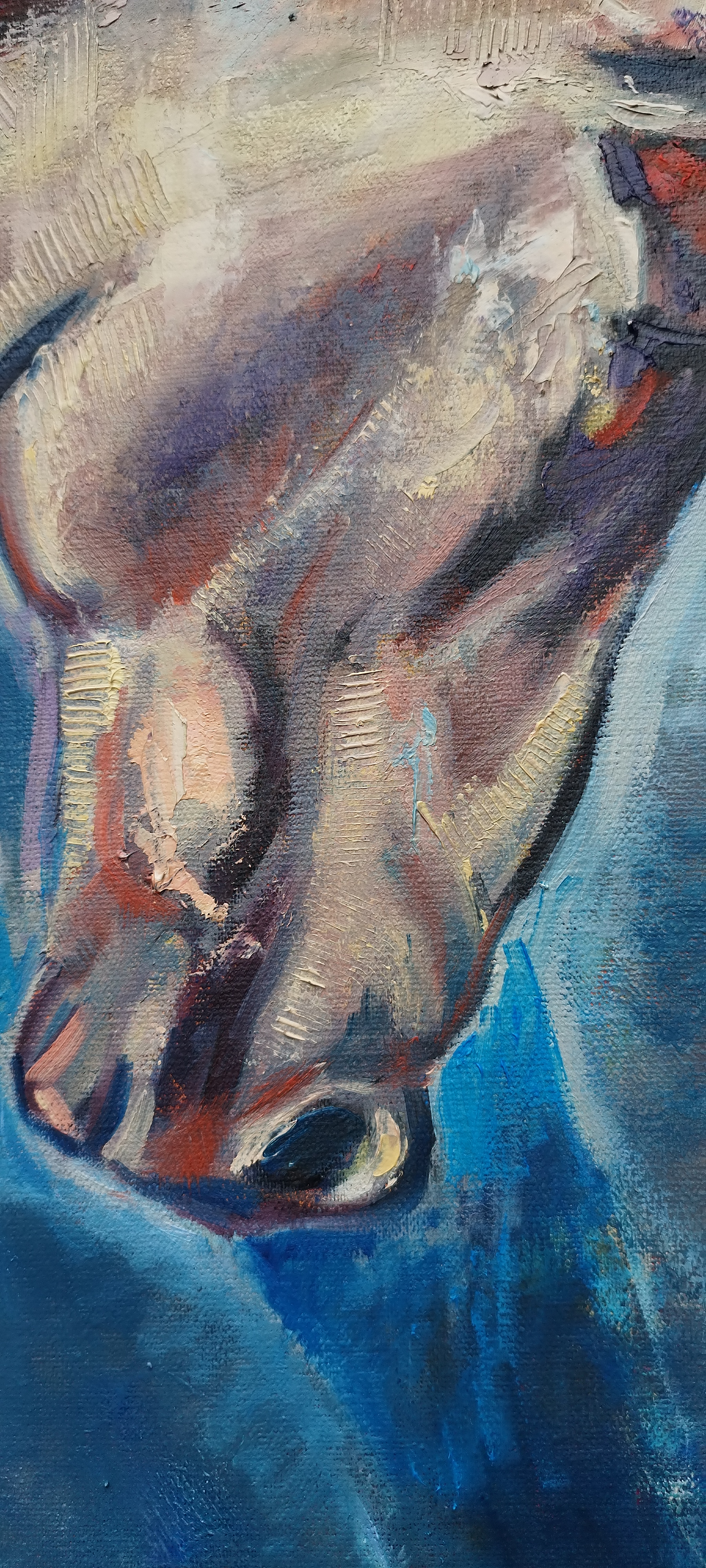 Na obrazie, pełnym życia i ruchu, dominuje majestatyczny koń. Jego sylwetka wyraźnie wyróżnia się na tle intensywnych barw – głównie odcieni błękitu, czerwieni i fioletu. Kompozycja jest dynamiczna, koń jakby zatrzymany w biegu, jego grzywa rozwiana, umaszczenie połyskujące. Kolory stapiają się i mieszają, tworząc efekt mgły unoszącej się wokół zwierzęcia. Nastrój obrazu jest niemal magiczny. Można poczuć energię i wolność, jaką emanuje ten koń. Użytkowanie rozmytych linii dodaje dziełu płynności, artyście udało się uchwycić esencję ruchu. Techniką trudną do opisania, ale przypominającą impasto, sprawiają, że dzieło jest prawdziwe "tactile". U mnie budzi to wspomnienia z dzieciństwa, kiedy konie były dla mnie jak bohaterowie. Obraz ten mógłby być symbolem siły i wolności. Głowę konia opuszczoną w taki sposób, że wydaje się, jakby myślał o czymś ważnym. Może o nieograniczonych przestrzeniach, które tylko czekają na odkrycie? Pewne jest jedno, jego widok to czysta inspiracja.