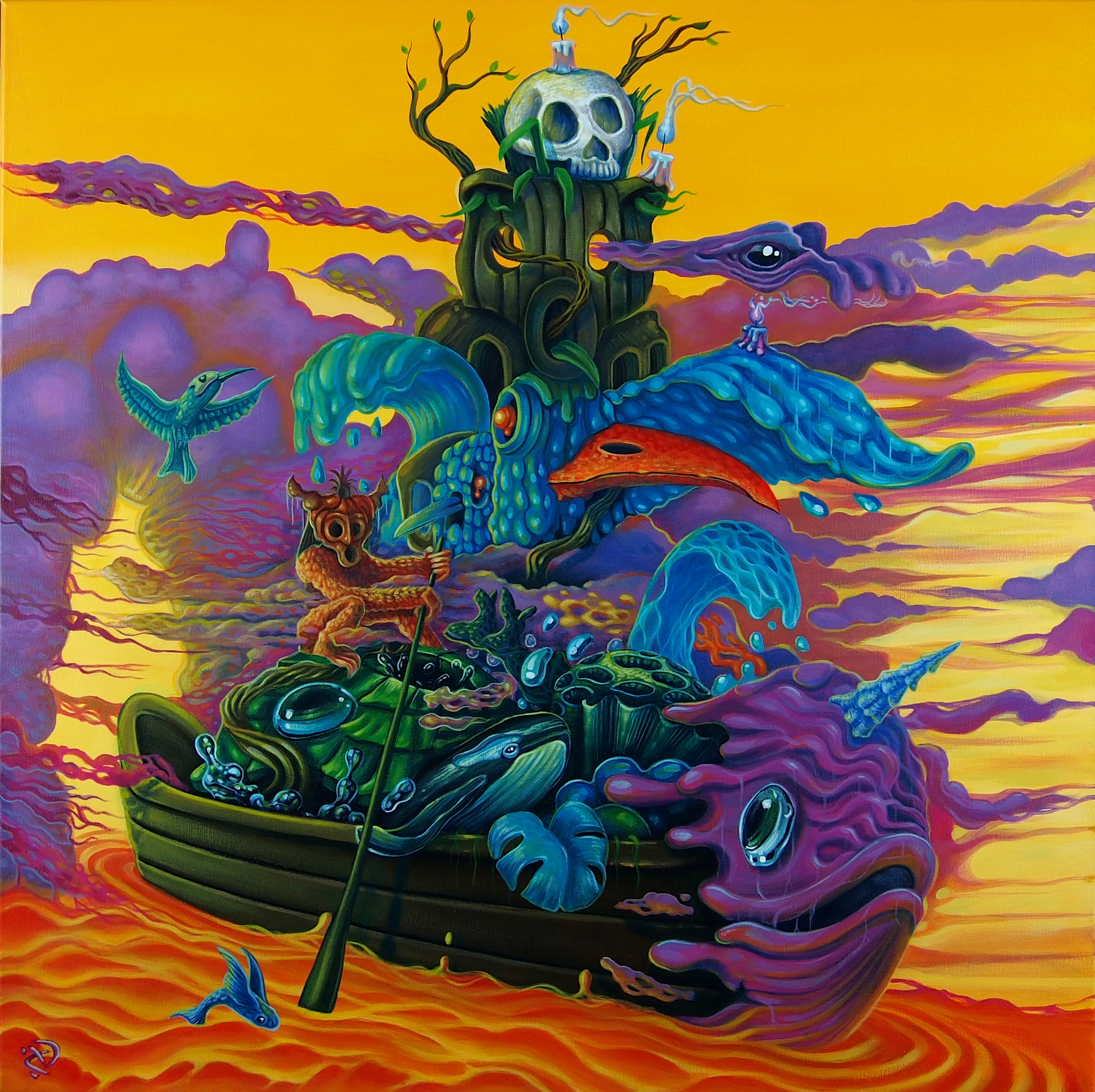 Obraz promienieje soczystymi kolorami tęczy, które skaczą z płótna jak radosne plamy akrylu. Intensywne żółcie i fiolety dominują tło, tworząc niebo przypominające psycho-deliczną krainę snów. Centralna kompozycja przyciąga wzrok, a wielka czaszka na szczycie wzgórza zdaje się patrzeć prosto w głąb duszy widza. Co to właściwie znaczy, nie wiem, ale robi wrażenie. Na pierwszym planie, łódź pełna jest niezwykłych, surrealistycznych stworzeń. Niektóre z nich wydają się nie z tego świata. Artysta wykorzystał dynamiczne pociągnięcia pędzla, by nadać obrazowi żywy, pełen energii charakter. To jakby ktoś powiedział "wow" i zamienił to w malarski spektakl. Styl przypomina trochę surrealizm z nutą bajkowej fantazji. Obraz może wywołać w odbiorcy mieszankę emocji - od zdziwienia, przez zachwyt, po lekkie zaniepokojenie. Może też zaskoczyć i sprawić, że poczujemy się jak odkrywcy innego wymiaru. Jest w tym coś magicznego. Myślę sobie, jak 7-letnie dziecko: "dlaczego te stworzenia wyglądają, jakby były w super przygodzie?". Aż chce się zanurzyć w tej bajkowej krainie i zobaczyć, co kryje się za kolejnym zakrętem, jak w dobrej historii. To właśnie prawdziwa magiczna rzecz tego obrazu. Fascynuje i zabiera nas gdzieś daleko, w głąb nieznanej opowieści.