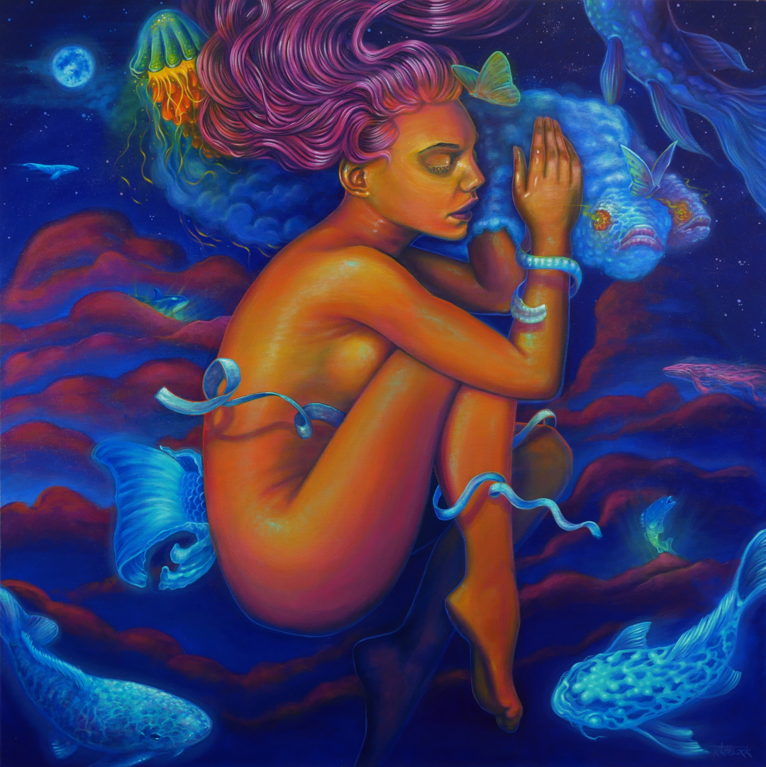Na obrazie widzimy kobietę unoszącą się w kosmicznej przestrzeni, otoczoną nasyconymi kolorami, które przenoszą nas w świat snów. Jej skóra mieni się ciepłymi odcieniami pomarańczu, kontrastując z zimnym błękitem i purpurą otaczających ją stworzeń i chmur. Włosy, pełne delikatnych fal, przypominają morskie fale, splątane z jaśniejącymi w ciemności gwiazdkami. Całość kompozycji jest dynamiczna, a jednak emanuje spokojem. Przypomina trochę magicznego snu albo opowieść o podróży w nieznane. Artysta zastosował technikę mieszania barw, tworząc płynne przejścia, które dodają głębi i tajemniczości. Uczucie unoszenia się i mistycznej ciszy sprawia, że nie sposób oderwać wzroku. Człowiek czuje się jak w bajce, a może nawet trochę jak w "dreamland". Siedmioletnie dziecko pewnie powiedziałoby: "O, pani leci z rybkami w kosmosie!". Cały obraz daje odbiorcy moment wytchnienia i refleksji o nieograniczonych możliwościach marzeń.