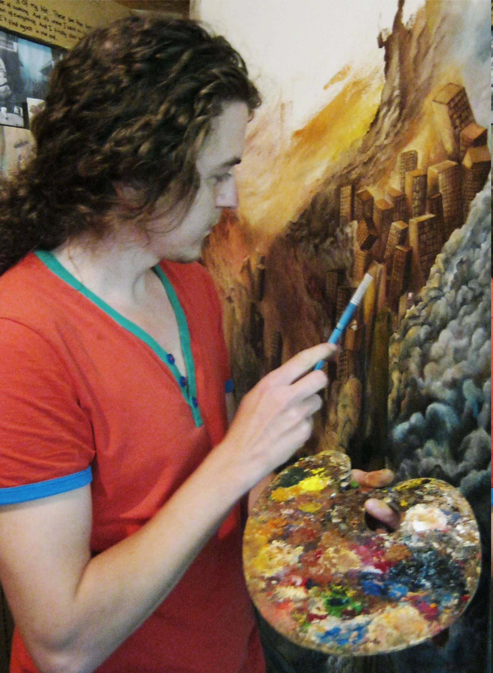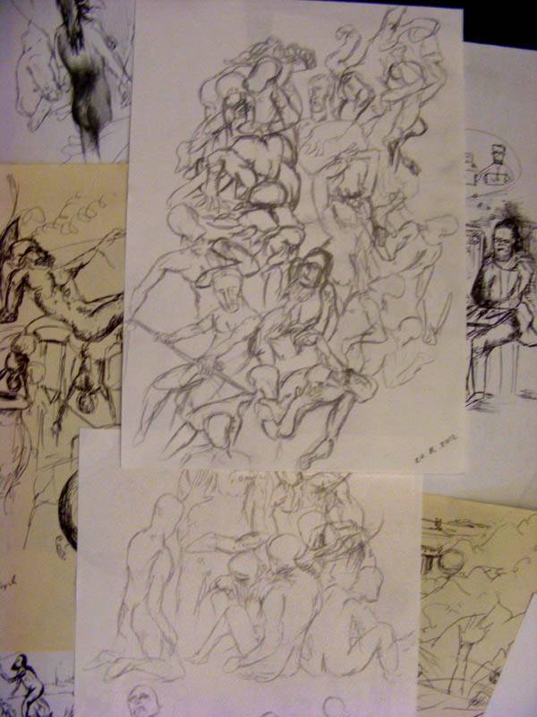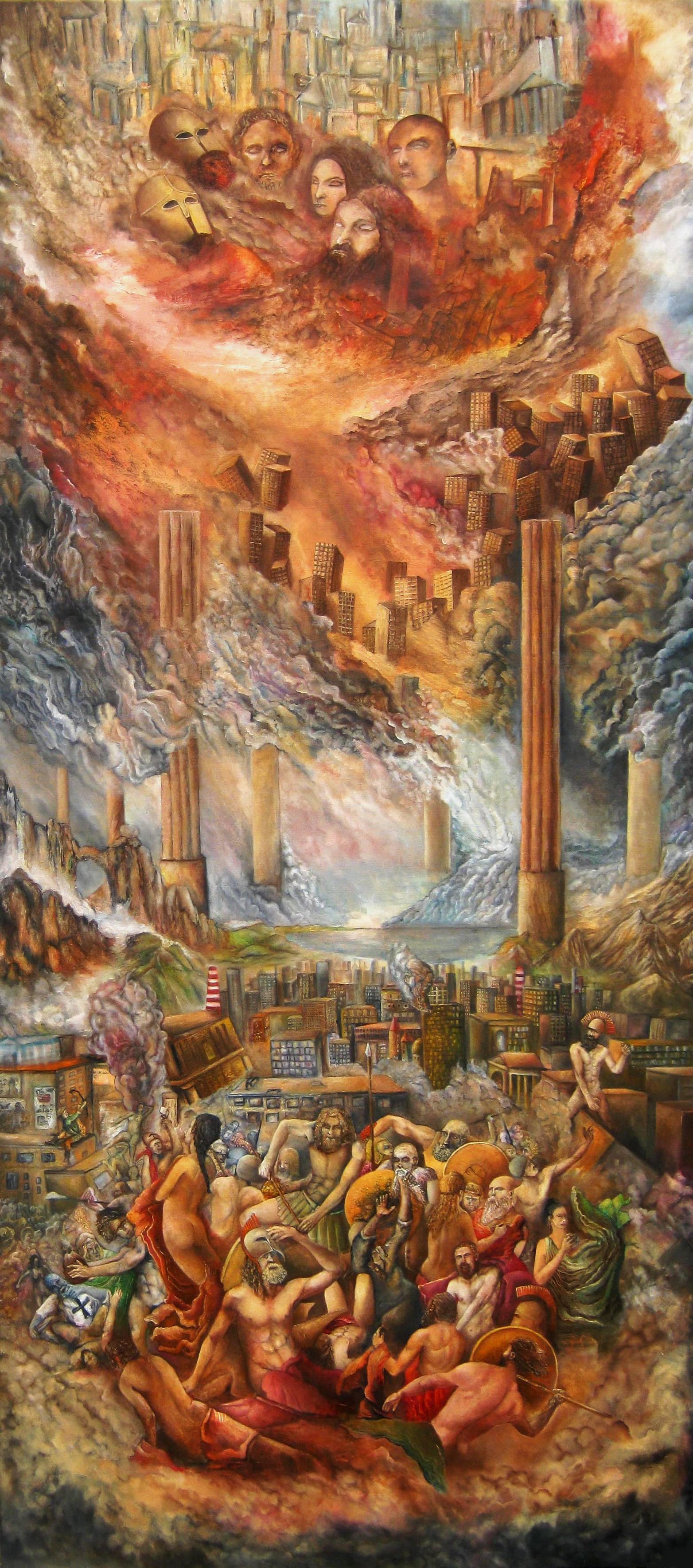 Obraz emanuje dramatyzmem. To chaos i harmonia splecione razem w rozmytych barwach. Ciepłe odcienie czerwieni i pomarańczy mieszają się z zimnymi szarościami, tworząc niezwykły kontrast. To miejsce, gdzie kolory tańczą w szalonym rytmie. Budynki jakby tańczyły wśród pióropuszy dymu, unosząc się na tle nieba przypominającego burzową chmurę. Wygląda jak bitwa nie toczona na ziemi, lecz w przestrzeni marzeń i sennych koszmarów. Artysta użył dynamicznych pociągnięć pędzla, co dodaje dziełu ekspresyjności. Ta technika oddaje niepokój i podsyca emocje. Obraz jest jakby na granicy jawy i snu, pełen skrytych znaczeń. Wzbudza refleksję o chaosie i walce w naszym świecie. Czy te postacie są bogami, którzy patrzą na nas z góry? A może to symbol naszej codziennej walki? "Wow, ile tu wszystkiego!" powiedziałoby dziecko. To dzieło, które zaprasza do dialogu. Każdy widz może poczuć to "something". Obraz jest jak nieskończona opowieść, która budzi dreszcz i skłania do zadumy.