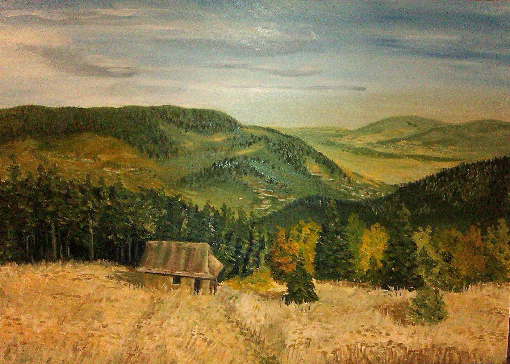 Na obrazie widać malowniczy krajobraz z domkiem pośród falujących łąk i wzgórz pokrytych lasami. Kolory dominujące to głębokie zielenie, ciepłe żółcie i subtelne brązy. Stojąc przed tą sceną, można niemal poczuć lekki powiew wiatru i usłyszeć szelest traw. Obraz jest skomponowany z dbałością o każdy szczegół, a jego poziome linie prowadzą wzrok ku odległym pagórkom. Atmosfera obrazu emanuje spokojem i sielankowym nastrojem, zachęcając do chwili zadumy. Technika artysty sugeruje znakomite opanowanie pędzla i palety kolorów, co przywodzi na myśl styl impresjonistów. Odbiorca może doświadczyć uczucia nostalgii, bycia częścią tej cichej harmonii natury. Wyjątkowy touch faktury obrazu przywodzi na myśl "calmness". Obraz przypomina o prostocie życia i pięknie, które tkwi w naturze. "Ten domek jest jak z bajki, gdzie mieszkać może krasnoludek!" – powiedziałoby dziecko, dostrzegając w tej wizji magiczną krainę. To dzieło wzbudza prawdziwe emocje i zatrzymuje chwilę, która trwa wiecznie w sercu odbiorcy.