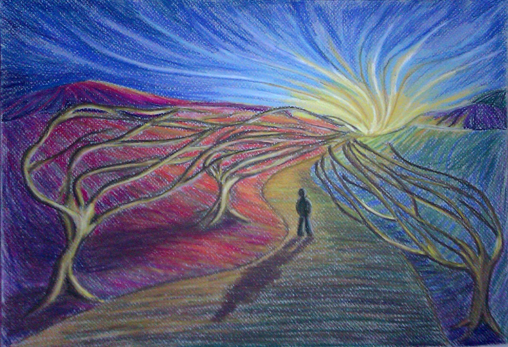 Obraz emanuje magią nieskończoności, z dynamicznymi i zakrzywionymi liniami, które tworzą wirujące drzewa. Kolory są intensywne: głębokie niebieskie niebo przechodzi w ciepły żółty horyzont, który rozświetla ścieżkę. Kompozycja jest dramatyczna, postać na drodze prowadzi nasze spojrzenie w stronę promieniującego światła. Nastrój może być odbierany jako nostalgiczną tęsknota za czymś nieosiągalnym lub jako optymistyczna perspektywa ku nowym możliwościom. Technika artystyczna, przypominająca pastele, dodaje obrazowi teksturę i głębokość. Czuje się, jakby artysta chciał nas wciągnąć w swój świat pełen nieprzewidywalnych emocji i tajemnic. "Wow" pomyślało dziecko, patrząc na to zachwycające widowisko. Obraz może wzbudzać w odbiorcy poczucie wewnętrznego spokoju, ale i ekscytacji. To działa na wyobraźnię, kierując myśli ku nieograniczonym marzeniom. Kiedy patrzysz na ten "landscape", możesz odczuwać dziwne połączenie melancholii i nadziei – jakby artysta chciał nas zachęcić do odkrywania nowych ścieżek nie tylko w sztuce, ale i w życiu.