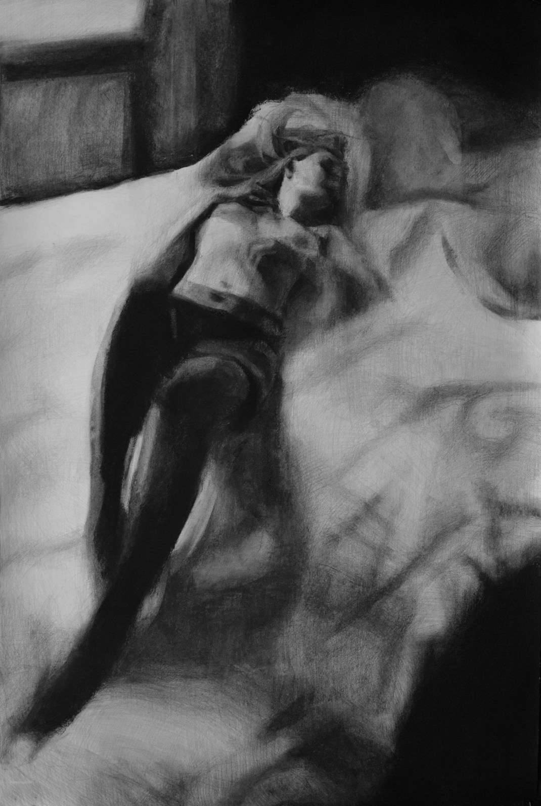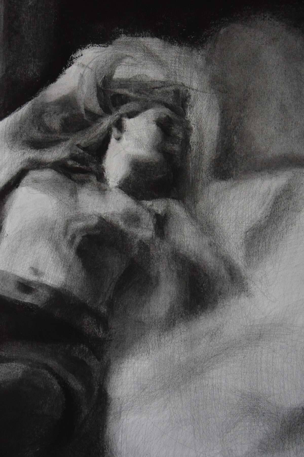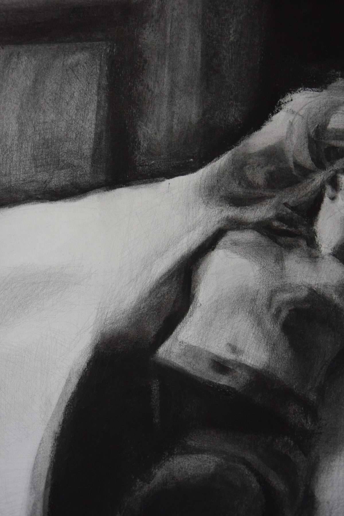 Rysunek na papierze w wymiarze 120x80cm, wykonany techniką mieszaną: pastel, węgiel, ołówek, na białym papierowym podobraziu. Pojedynczy, sygnowany egzemplarz. Całość zawerniksowana przed rozmazywaniem.