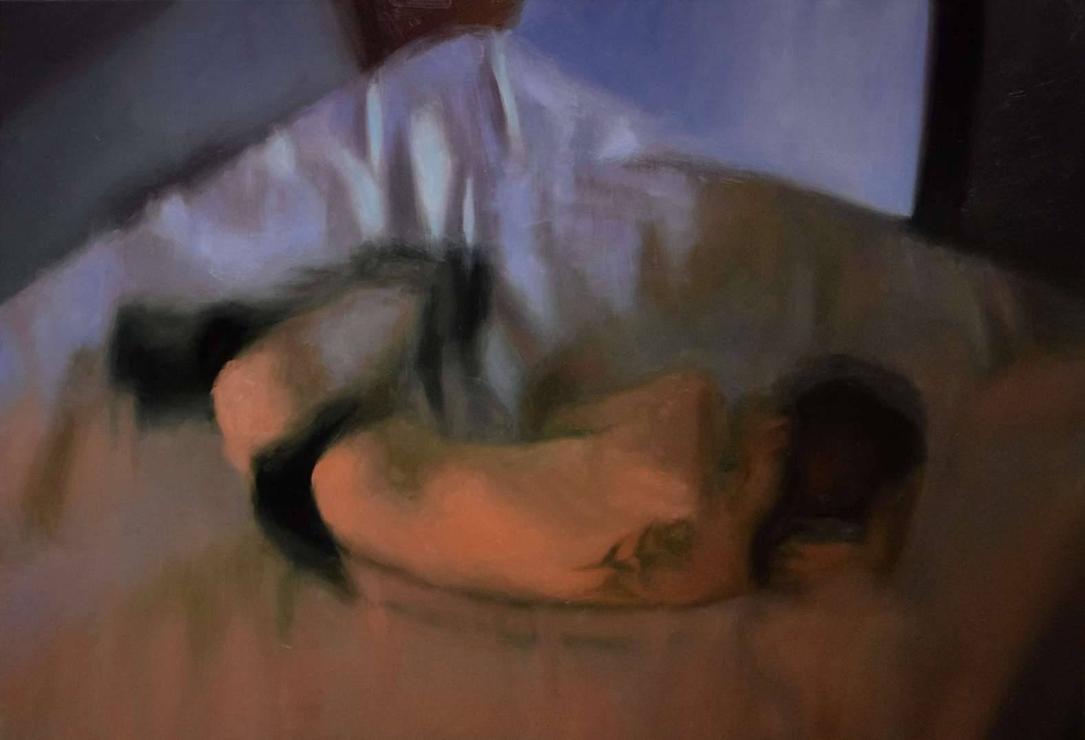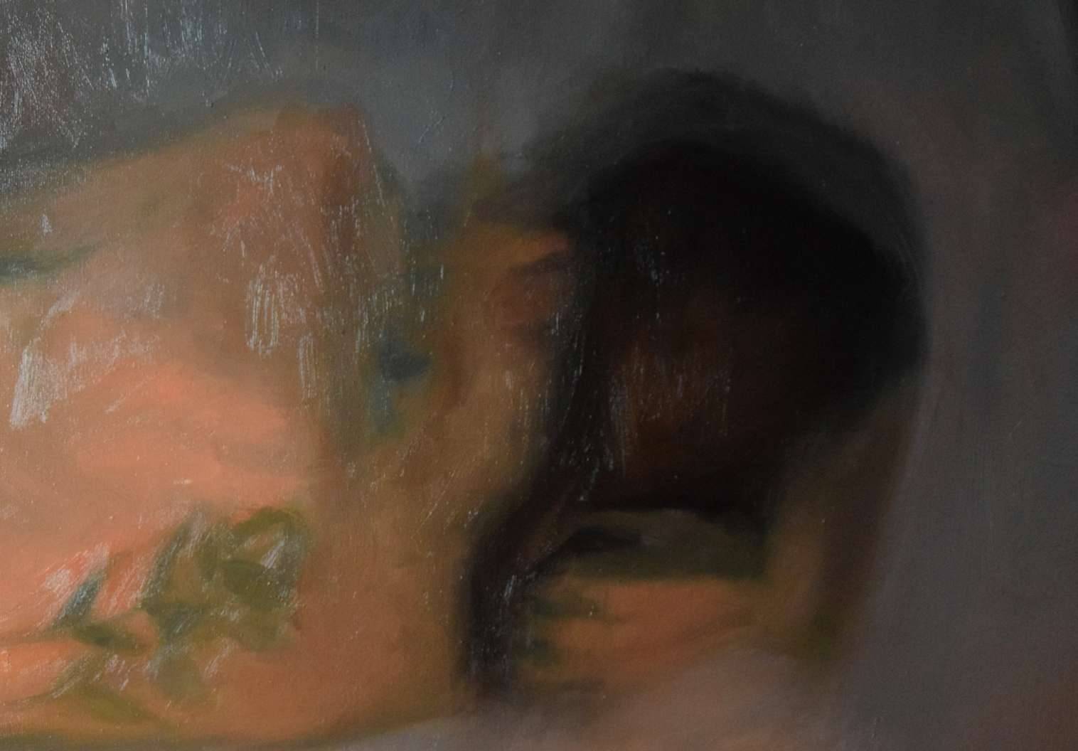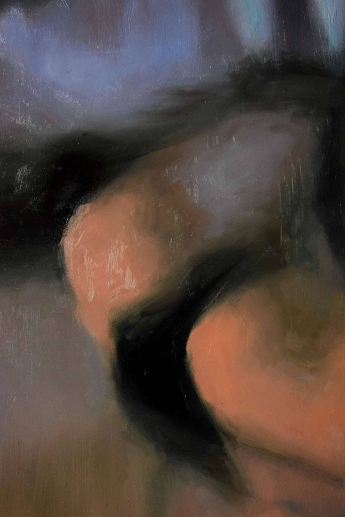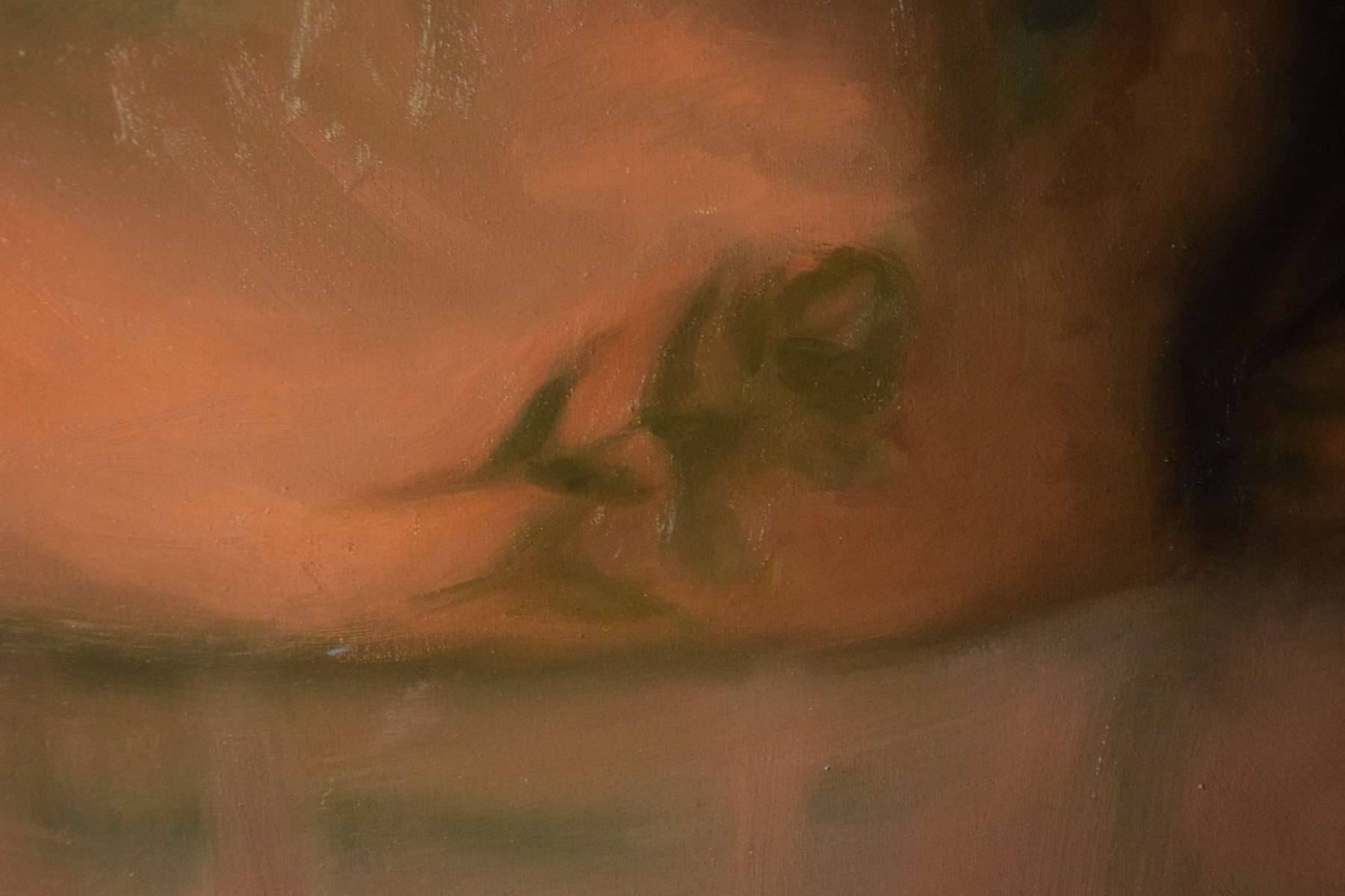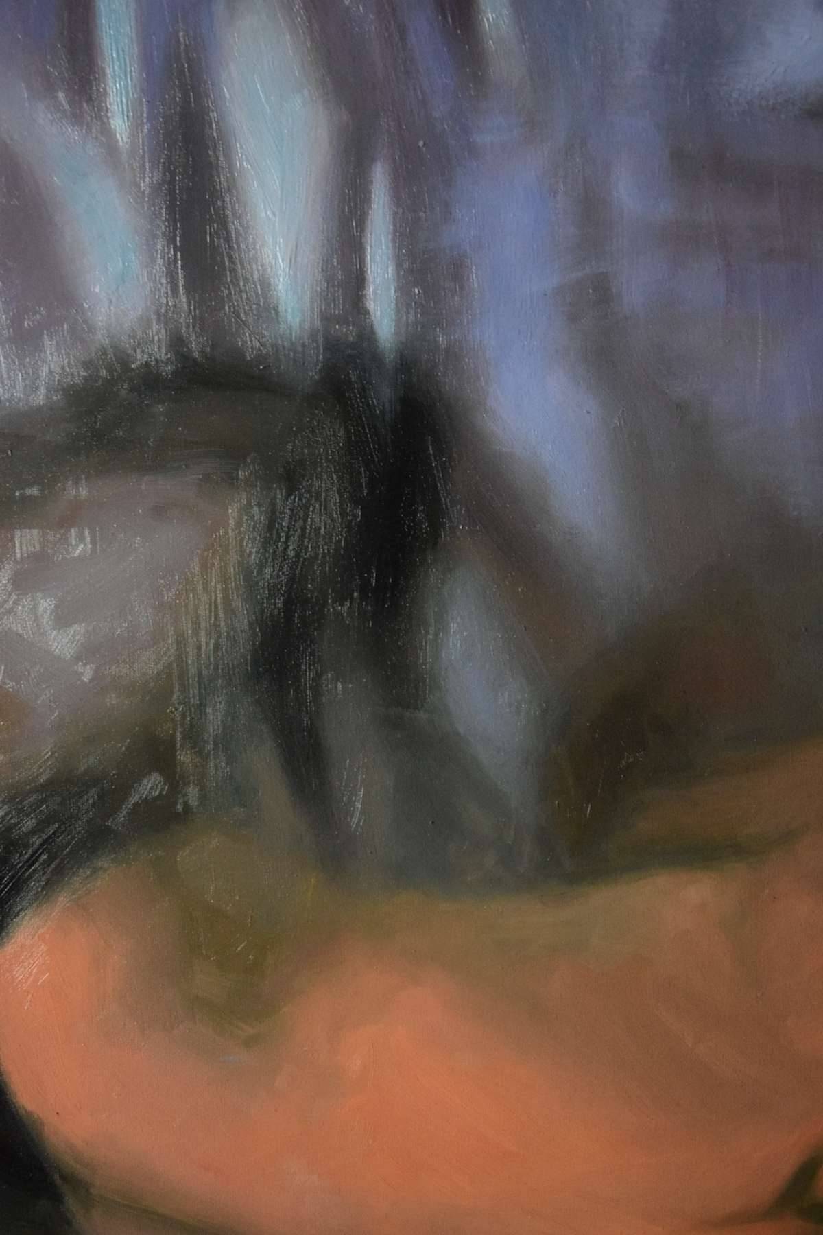 Akt kobiecy na płótnie, wykonany w technice olejnej w dominującej gamie fioletów i oranżów. Zabezpieczony werniksem z połyskiem. Pojedynczy egzemplarz, sygnowany na odwrocie.