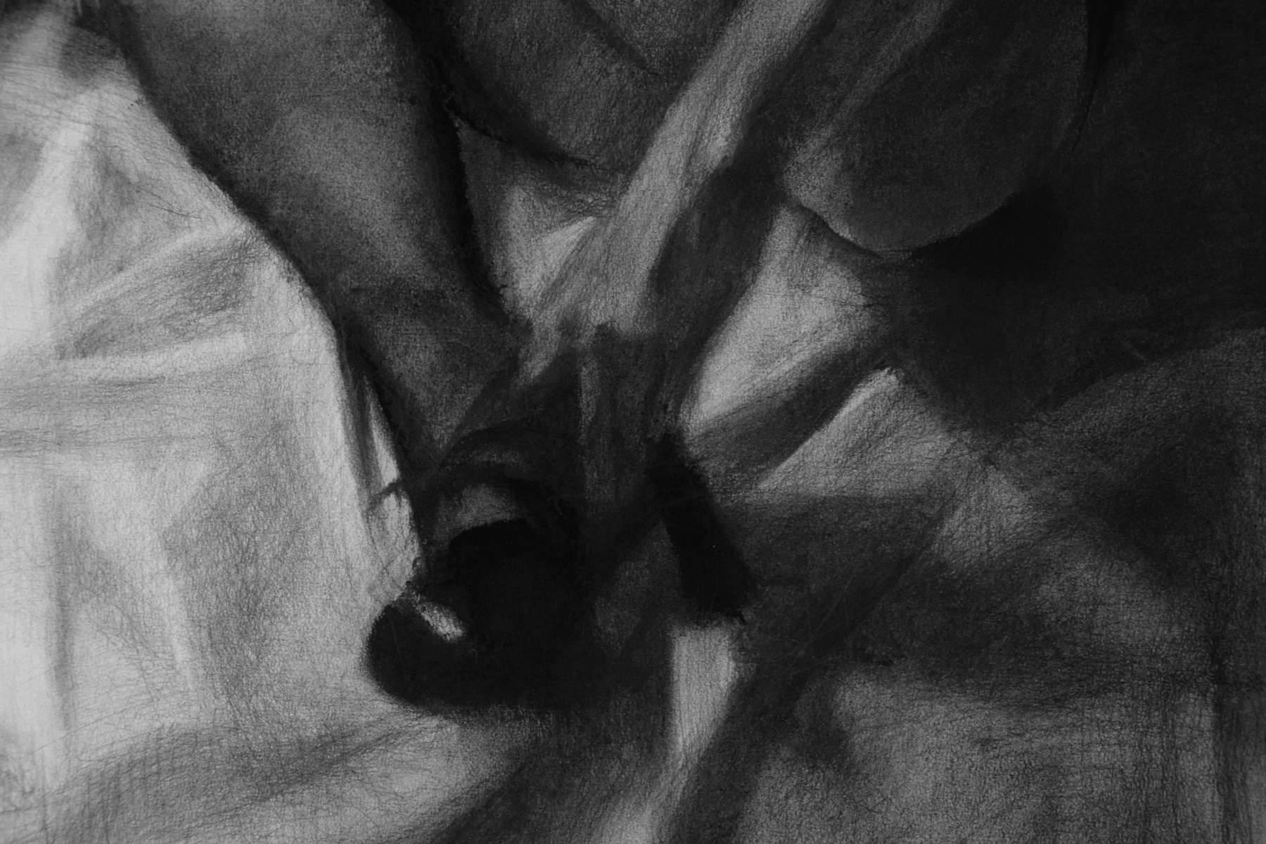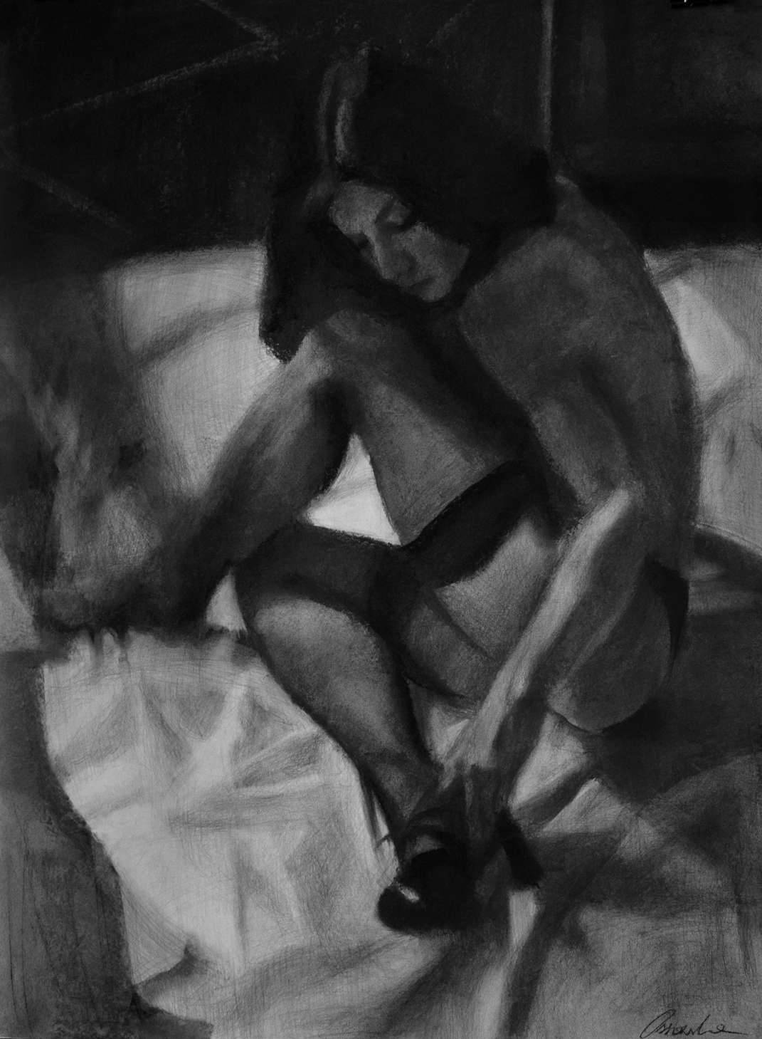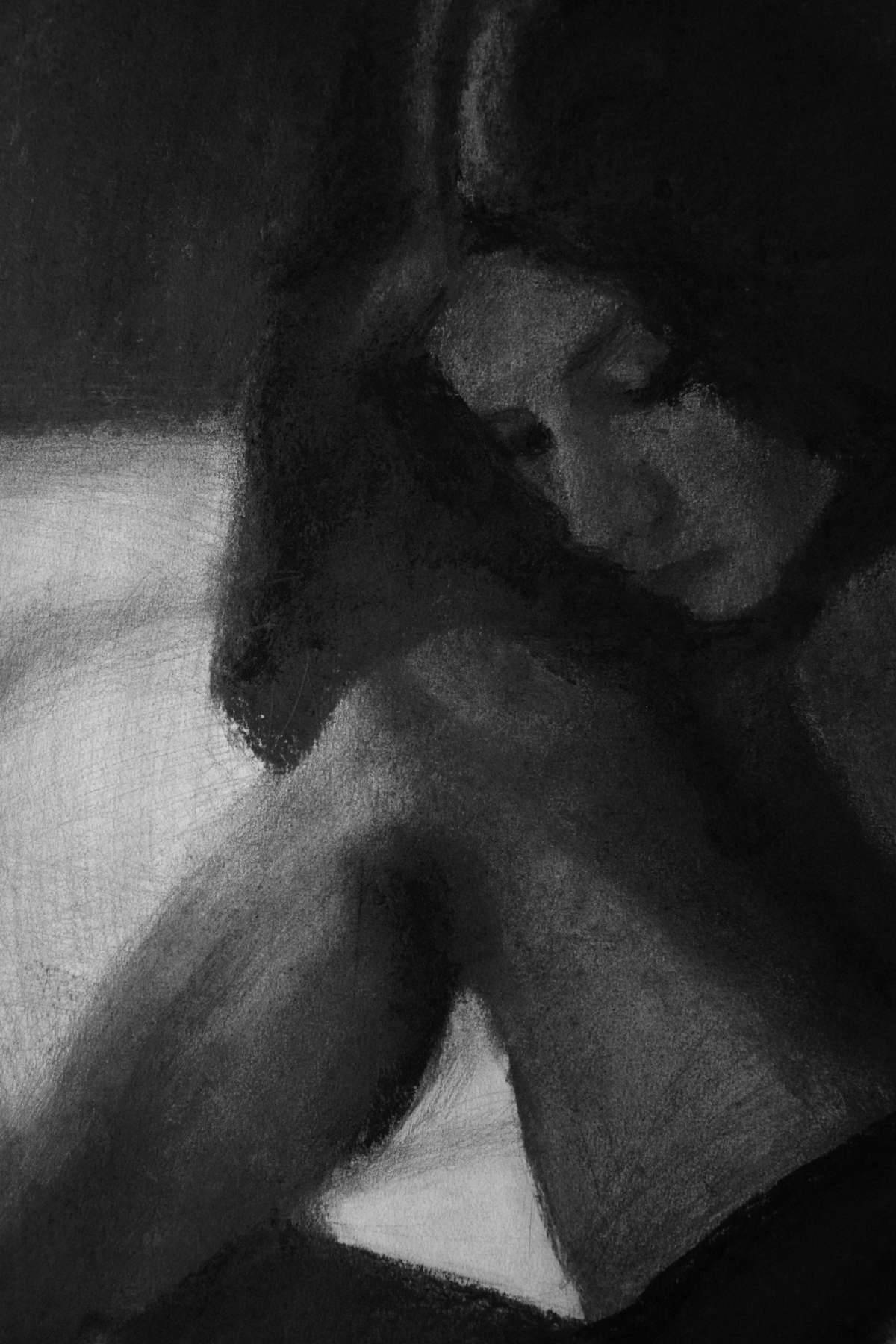 Na obrazie widzimy subtelną grę światła i cienia, które tworzą intymny, zatopiony w monochromatycznej palecie nastrój. Dominują odcienie szarości, które płynnie przechodzą od jasnych do ciemnych partii, podkreślając sylwetkę kobiety w centralnej części kompozycji. Jej ciało jest zarysowane miękkimi liniami, co dodaje uczucia delikatności i spokoju. Jednocześnie cała scena emanuje pewną sentymentalnością, a nawet smutkiem. Artystyczna technika przypomina klasyczne rysunki węglem, gdzie każde pociągnięcie jest przemyślane i pełne wyrazu. Obraz jest jak cisza przed burzą, z tajemnicą wiszącą w powietrzu. A widz, patrząc na niego, może poczuć całą gamę emocji – niepokoju, refleksji, a nawet nostalgii. Czy to chwila zadumy, czy moment zapomnienia? Moje pierwsze skojarzenie to słowo "enigma". Dzieło przyciąga uwagę swoją prostotą, a jednocześnie zaskakuje głębią. "Mama, czemu ta pani siedzi tak smutno?" – mogłoby zapytać dziecko. I tu jest ta magia, bo każdy znajdzie tu coś swojego.