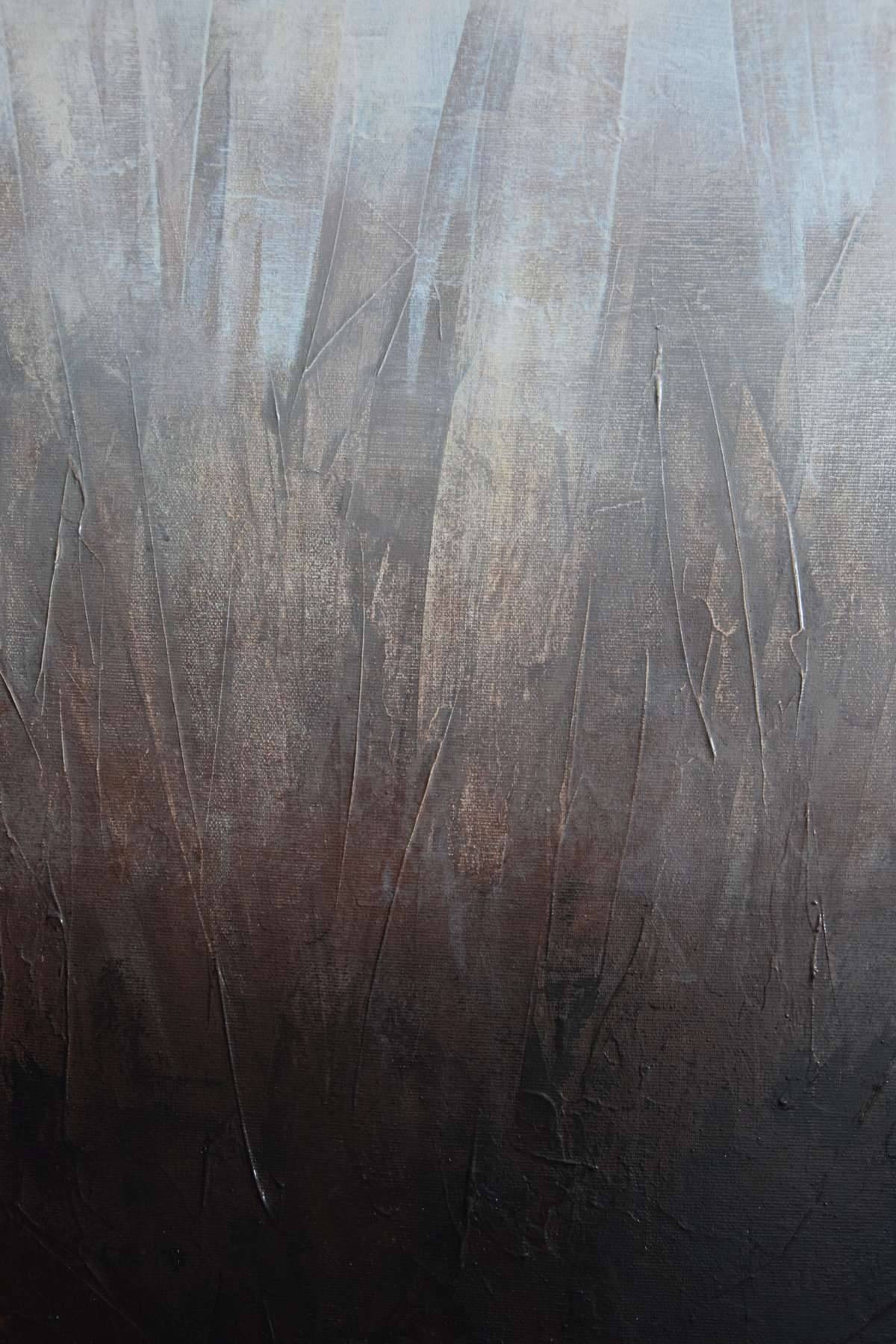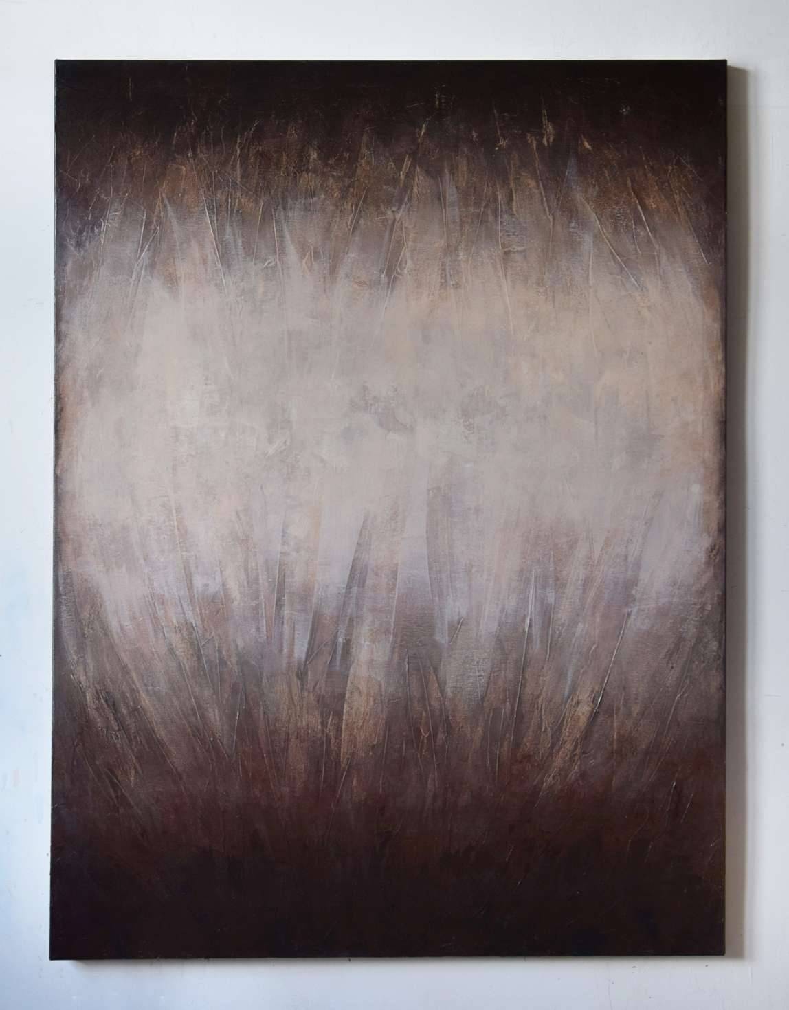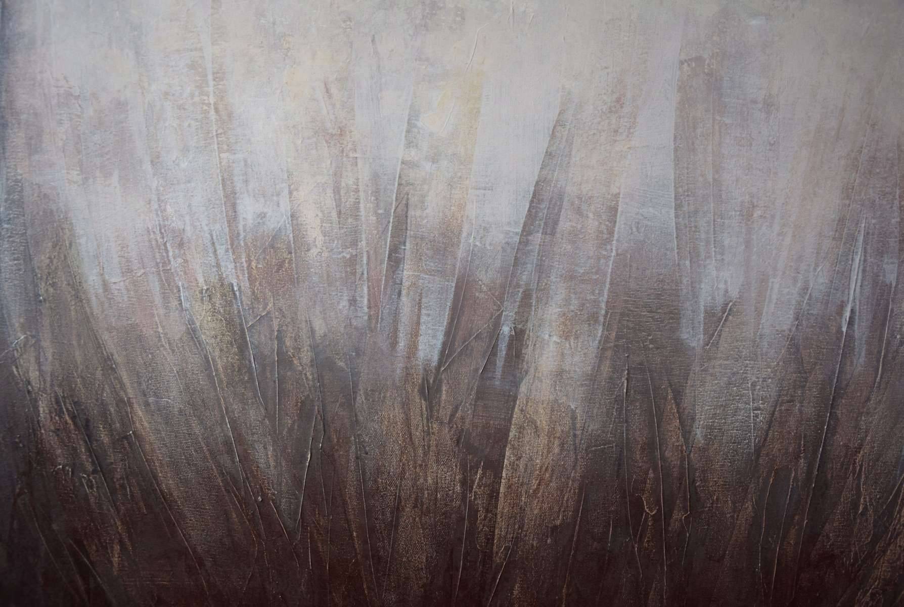 Współczesna, minimalistyczna abstrakcja o strukturalnej powierzchni i dynamicznym charakterze. Obraz budują kontrastujące ze sobą powierzchnie w odcieniach czekoladowego brązu i ciepłych beży. Obraz ma zamalowane boki, dlatego będzie dobrze prezentował się również bez ramy. Praca posiada matowe wykończenie, jest sygnowana na odwrocie.