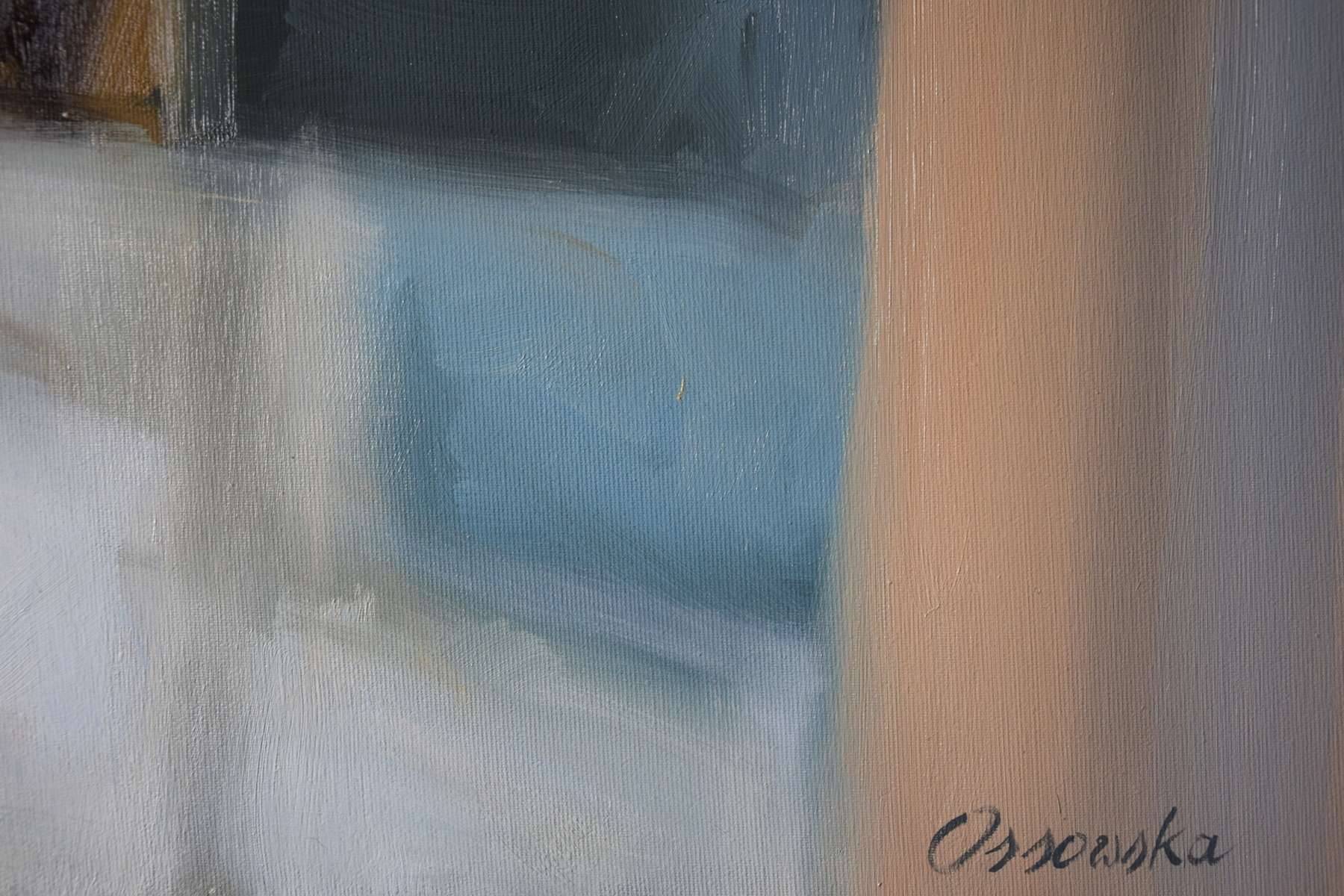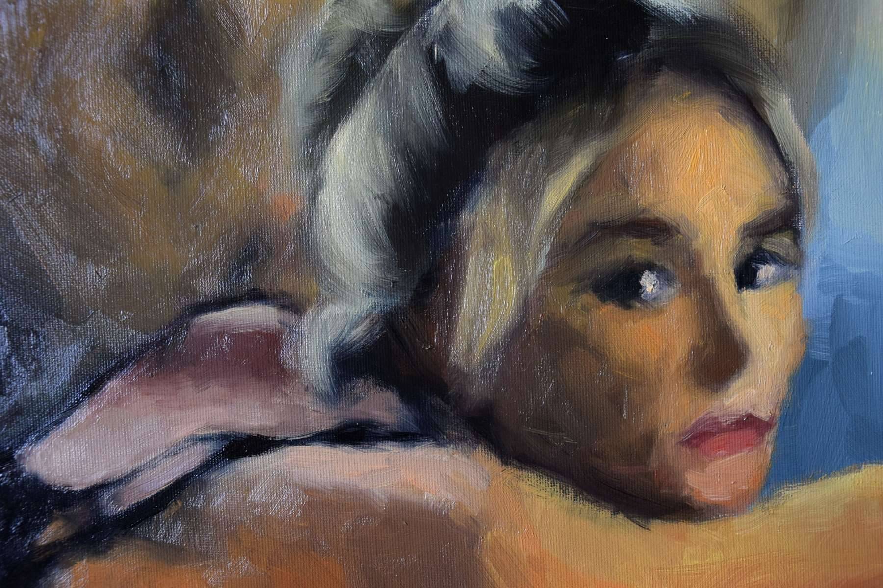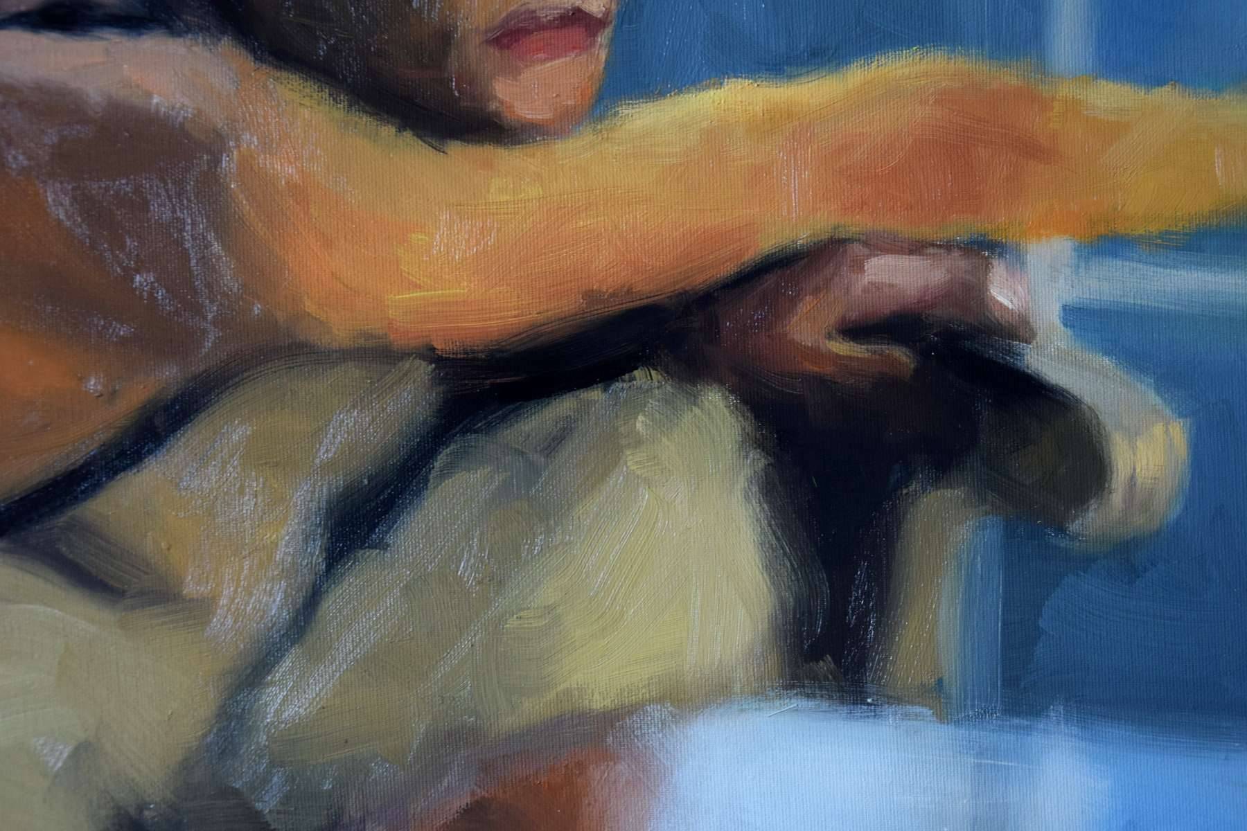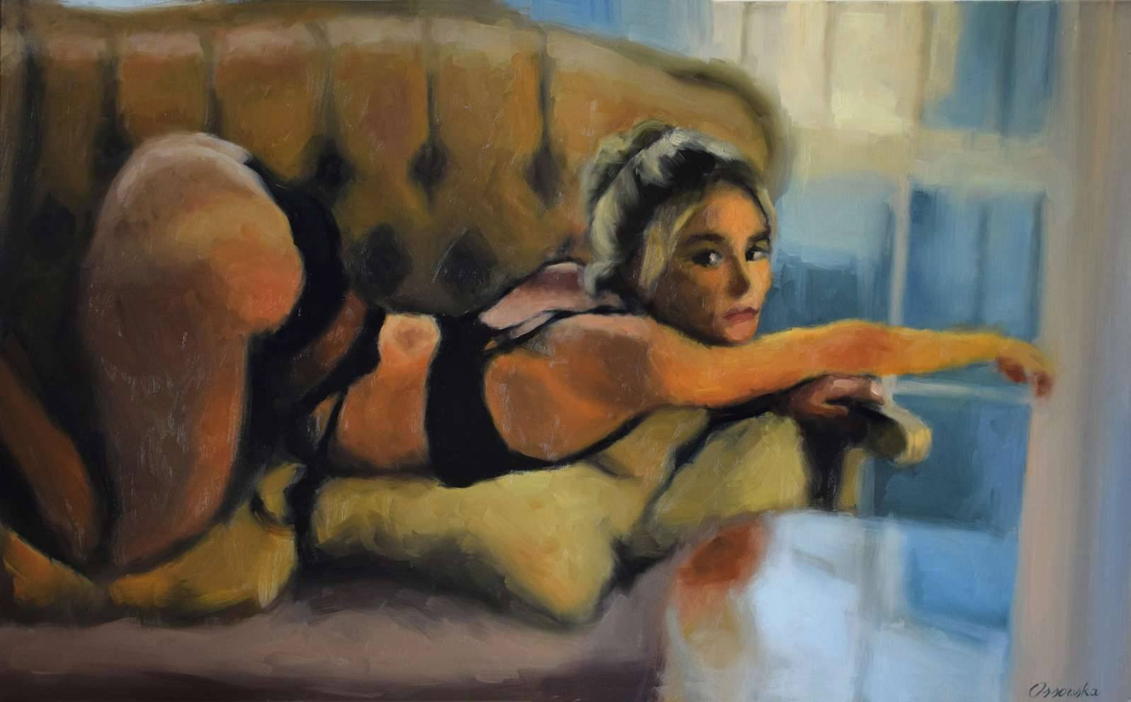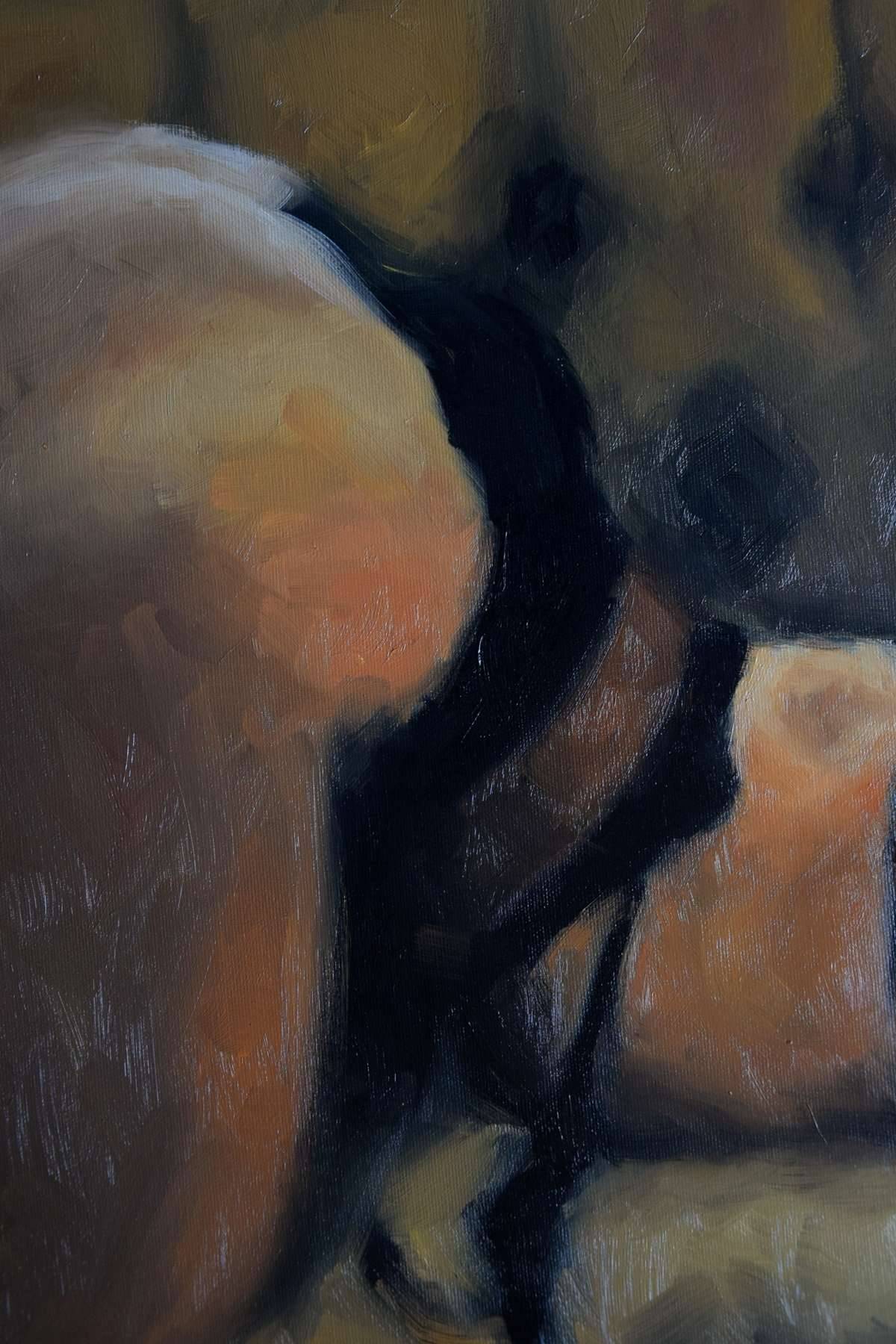 Figuratywne malarstwo w technice olejnej na bawełnianym podobraziu. Zmyslowy obraz o erotycznym wydźwięku, utrzymany jest w ciepłej tonacji. Przeważają odcienie ochry, dopełniają je akcenty błękitu. Unikalna praca w pojedynczym egzemplarzu. Sygnatura artystki znajduje się na w prawym dolnym rogu. Praca wymaga oprawy.