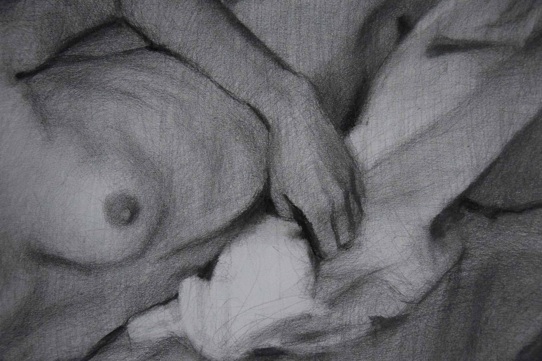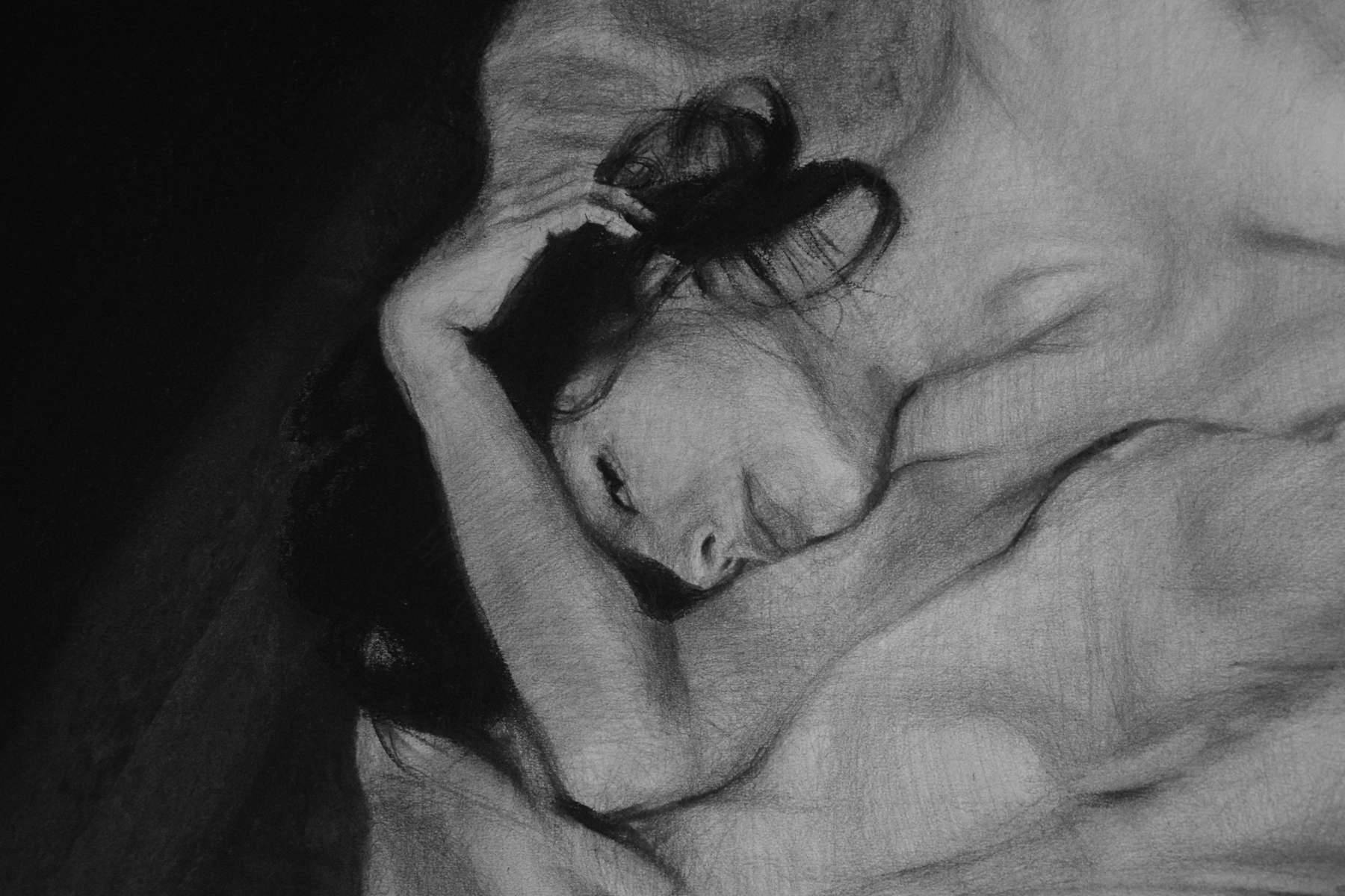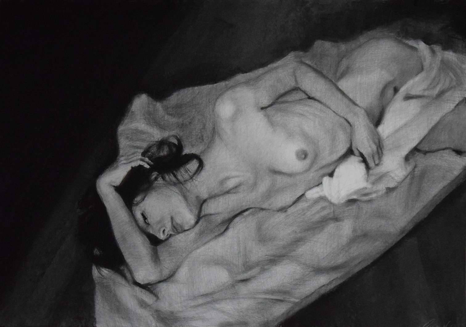 Odręczny rysunek autorski, akt kobiecy. Rysunek wykonany na papierze, w większości wykonana techniką rysunku ołówkiem, z domieszką węgla oraz pasteli. Została zabezpieczona werniksem przed rozmazywaniem. Podłoże papierowe 200g/m2. Rysunek sprzedawany bez oprawy. Sygnatura autorki znajduje się w prawym dolnym rogu. Pojedynczy egzemplarz