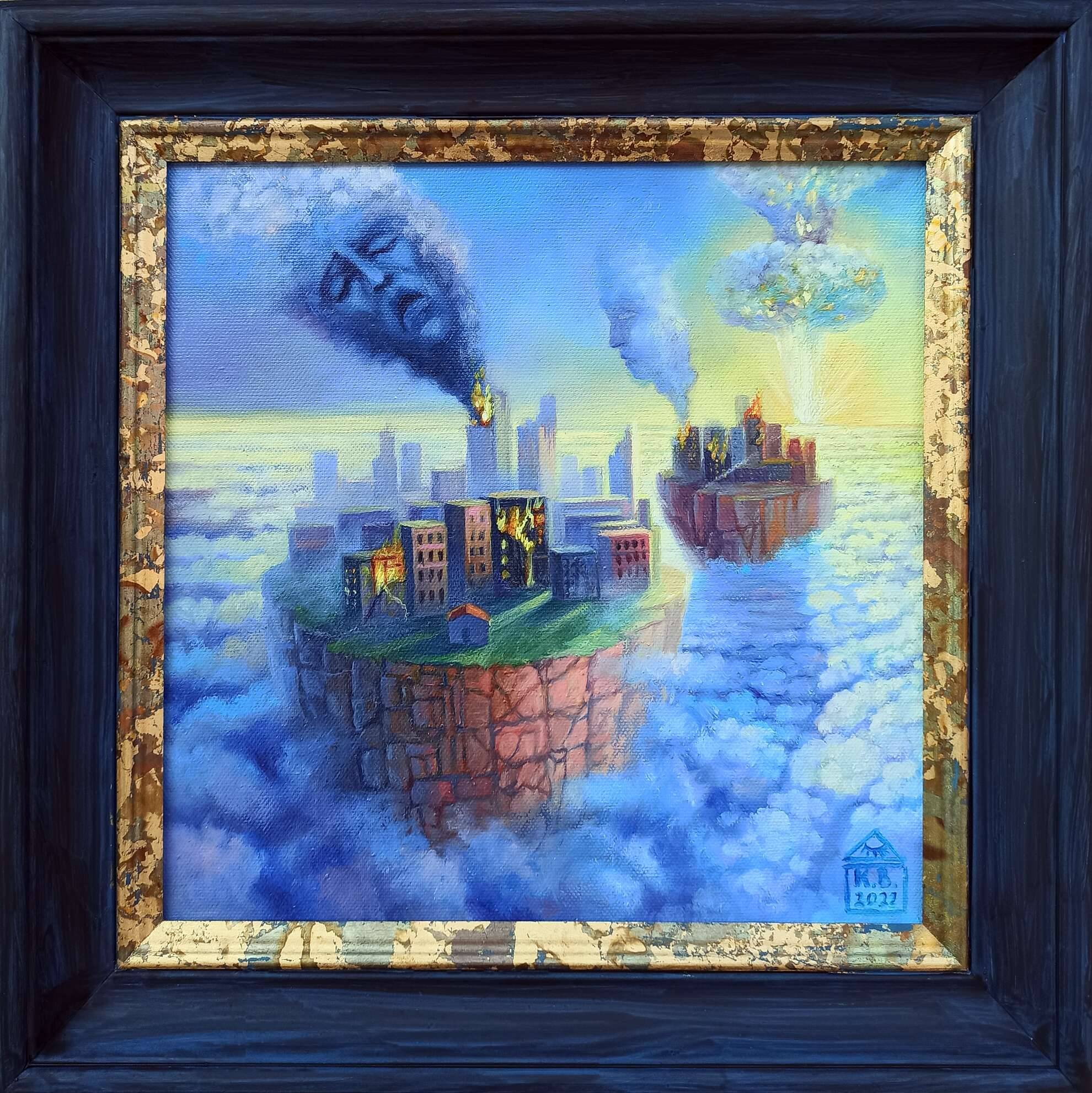 "Gdy rozum śpi - demony wojny" Olej na płótnie o wymiarach 30 x 30 cm, Sygnowany monogramem K.B.2022, Oprawiony. Certyfikat autorski.