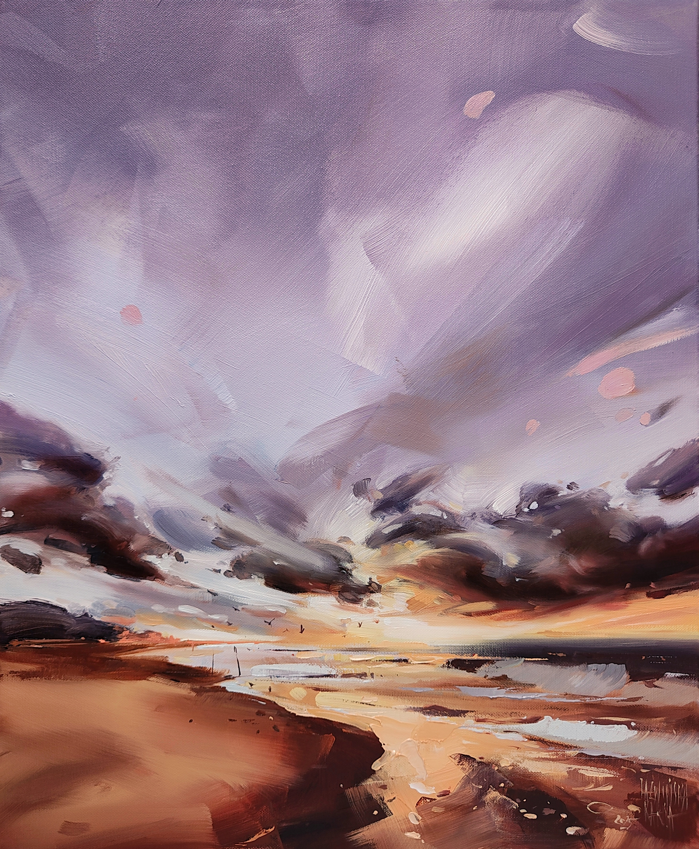 Na płótnie rozlewa się fioletowe niebo zmiękczone różem, a niżej plaża pulsuje brązami i ciepłymi pomarańczami. Szerokie pociągnięcia pędzla, chwilami impastowe, kształtują chmury w żagle nad drżącym horyzontem. Kompozycja biegnie po skosie od ciemnego lewego brzegu ku jasnej smudze wody, gdzie miga zachód. Niebo jest fioletowe z domieszką błękitu. Styl impresyjny z nutą ekspresji, jakby artystka malowała na wietrze. Powietrze ma smak soli i obietnicy, ja serio czuję to pod skórą jako ruch wiatru i dobrze. To wow! Obraz niesie spokój. Czasami nie wiesz czy słońce się żegna czy wraca, więc odbiorca czuje nostalgię i ciepły ciężar wspomnień, a światło kruszy krawędzie i zostawia myśl o łagodnym jutrze.