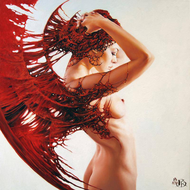 Obraz hipnotyzuje swą subtelnością i intensywnością jednocześnie. Dominują tu ciepłe odcienie czerwieni, które tworzą kontrast z gładką, jasną skórą postaci. Kształty są delikatne, a zarazem dynamiczne, przykuwając wzrok płynnością ruchu. Artysta zastosował technikę, która sprawia, że tkanina wydaje się niemal organiczna. Nastrój dzieła jest pełen tajemnicy i zmysłowości, ale też spokoju i refleksji. Styl realistyczny miesza się z nutą abstrakcji, nadając całości surrealistyczny vibe. Patrząc na ten obraz, można poczuć zarówno ciepło jak i chłód jednocześnie. Z jednej strony jest to eksplozja ekspresji, z drugiej subtelny szept do wyobraźni. Myśle, że w rękach artysty obraz stał się czymś więcej niż tylko zbiorem kolorów i kształtów. Dzieło pokazuje, jak kruchość i siła mogą współistnieć w jednym ujęciu. To coś, co można by opisać jako freedom - uwolnienie od rzeczywistości i zanurzenie się w magicznym świecie sztuki. Czerwony element przypomina mi o namiętności, pasji, ale i niebezpieczeństwie. Taki obraz może wywołać w odbiorcy całą gamę emocji, od zachwytu po głęboką zadumę. Ten obraz jest super fajny i troszkę tajemniczy! Myślę, że każdy, kto na niego spojrzy, poczuje coś innego.