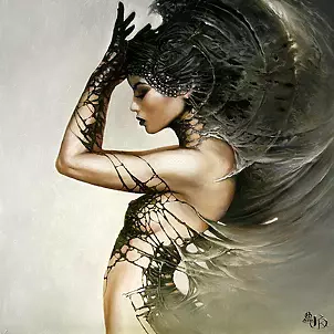 Na obrazie dominują chłodne, stonowane barwy. Subtelne odcienie szarości i beżu tworzą delikatne tło, które podkreśla postać w centrum. Kobieta z profilem zwróconym w lewo, ma na sobie hełm zdobiony klejnotami, które migoczą niczym gwiazdy na nocnym niebie. Jej skrzydła, ciemne i masywne, rozpościerają się na boki, dodając jej postaci magicznego splendoru. Całość kompozycji przywodzi na myśl nieziemską istotę, pełną tajemniczego uroku. Atmosfera jest nieco mistyczna, jakbyśmy patrzyli na scenę z baśni. Artysta wykorzystuje delikatne pociągnięcia pędzla, by stworzyć teksturę i głębię, a zarazem niejasność. Coś w stylu surrealismu, z nutką magii. Każdy element obrazu zdaje się opowiadać własną historię. Wywołuje to poczucie zachwytu, ale może też lekkiego niepokoju. Jakie to piękne, że świat fantazji może być tak blisko rzeczywistości. Ciekawe, co siedmioletnie dziecko powiedziałoby: Ona ma takie piękne, duże skrzydła jak ptak! Osobiście czuję, że obraz przypomina o kruchości i sile zarazem. To takie "wow", prawda? A może raczej whatchamacallit moment, gdy sztuka rozbudza wyobraźnię. Interpretacje są nieograniczone, każdy zobaczy coś innego.