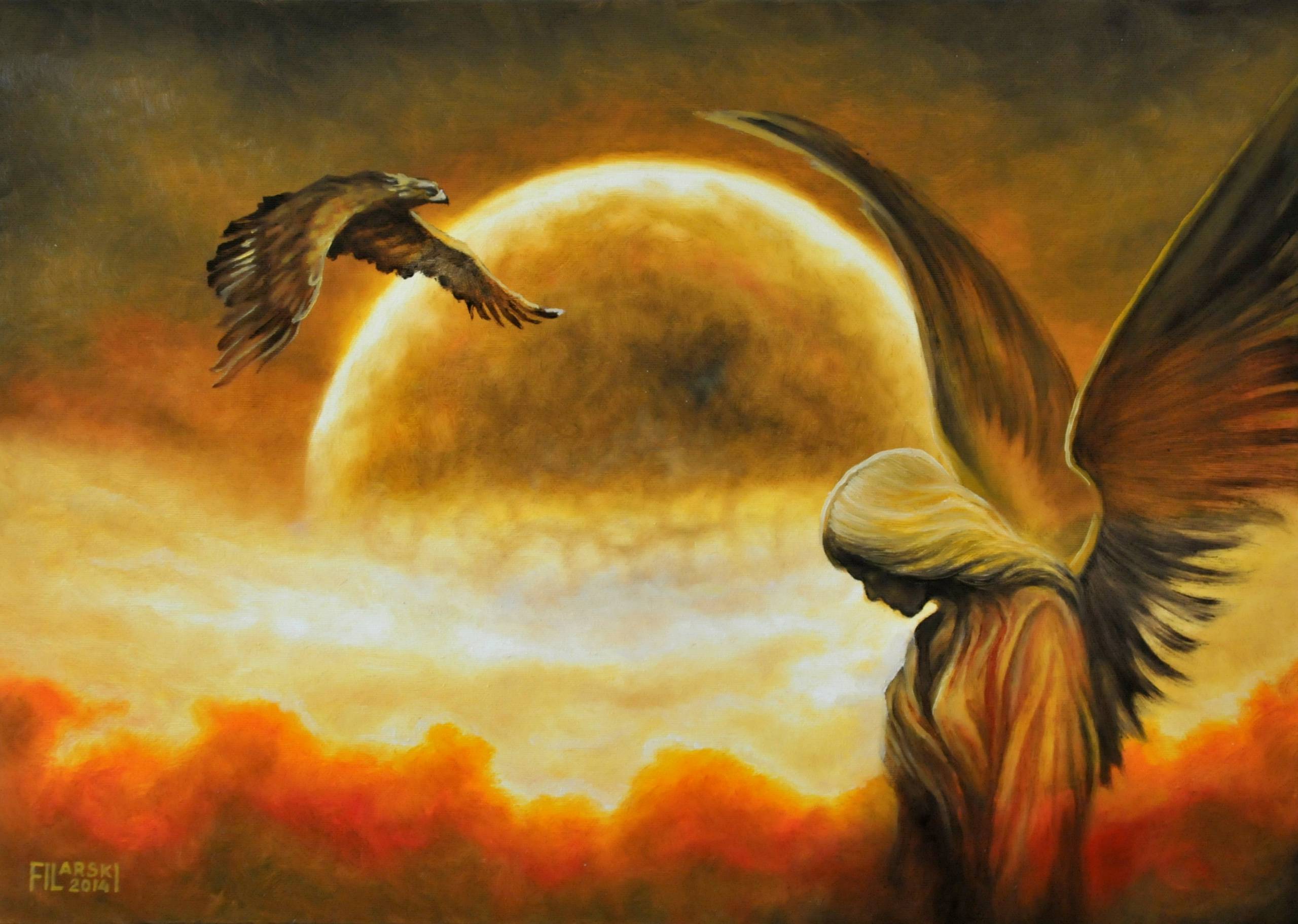 Na obrazie widać dynamiczną kompozycję, która przyciąga wzrok ciepłymi odcieniami pomarańczu, złota i czerwieni. Na pierwszym planie anioł, z rozpostartymi skrzydłami, skąpanymi w świetle. Obok niego unosi się potężny orzeł, którego lot wydaje się być pełen majestatu i siły. Tło to ogromne słońce, zanurzone w złotych chmurach, które tworzy niemalże mistyczną aurę. Obraz emanuje atmosferą spokoju, ale i tajemniczości. Czujemy się przytłoczeni pięknem chwili, jakby czas na moment się zatrzymał. Technika artystyczna zastosowana przez twórcę jest realistyczna, ale z elementami oniryzmu. Kiedy patrzę na ten obraz, czuję dziwną melancholię, jakbym tęsknił za czymś nieuchwytnym. Anioł zdaje się być zamyślony, pochylony, co dodaje dziełu głębi emocjonalnej. To tak jakby heaven spotkało ziemię. Skojarzenia z wolnością, duchowością, a może nawet pewnym rodzajem walki wewnętrznej są nie do uniknięcia. "Patrz, orzeł i anioł naprawdę są!" – powiedziałoby dziecko z zachwytem. Choć kolorystyka jest ciepła, wprowadza nastrój refleksji. Może to chwila równowagi między światłem a cieniem, między ziemskim a niebiańskim. A Ty jak myślisz, co tu się dzieje? To coś więcej niż tylko obraz – to podróż w nieznane.