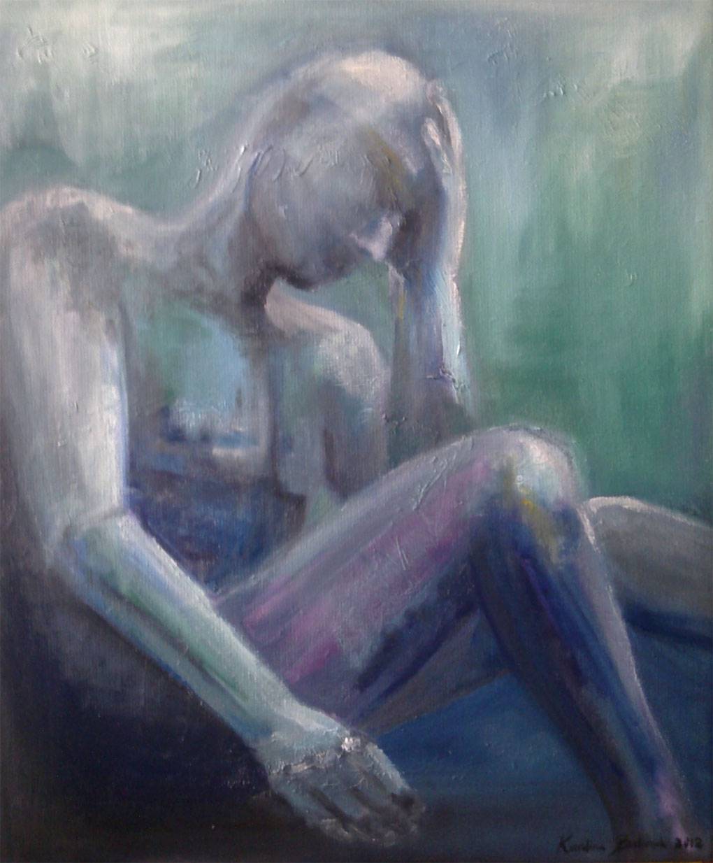 Oto obraz, który naprawdę przyciąga uwagę. Co od razu rzuca się w oczy, to chłodne, stonowane odcienie błękitu i zieleni, które dominują na płótnie. Postać ludzka, bez wyraźnych rysów twarzy, wydaje się pogrążona w zamyśleniu. Siedzi z ręką wspartą na głowie, co może sugerować zadumę lub smutek. Kształty są delikatne, niemalże eteryczne, tworząc kompozycję, która jest subtelna, a zarazem poruszająca. Nastrój jest pełen melancholii, ale ma w sobie coś hipnotyzującego, co sprawia, że chce się patrzeć dłużej. Styl jest trochę impresjonistyczny, z miękkimi konturami i rozmytymi plamami koloru. Technika, zdaje się, polega na nakładaniu wielu warstw farby, co daje wrażenie głębi. To trochę like a dream. Artysta zastosował subtelne pociągnięcia pędzla, które dodają obrazowi ulotności i tajemniczości. Gapiąc się na ten obraz, można poczuć spokój, ale i lekki niepokój. Jakby coś wisiało w powietrzu. Może to coś, co każdy z nas czasem czuje, gdy rozmyśla o życiu? Ej, to wygląda jak magia! Myśli siedmiolatka mogą być naprawdę zaskakujące, ale oddają naturalne odczucia – tak jak ten obraz, który wywołuje emocję i refleksję.