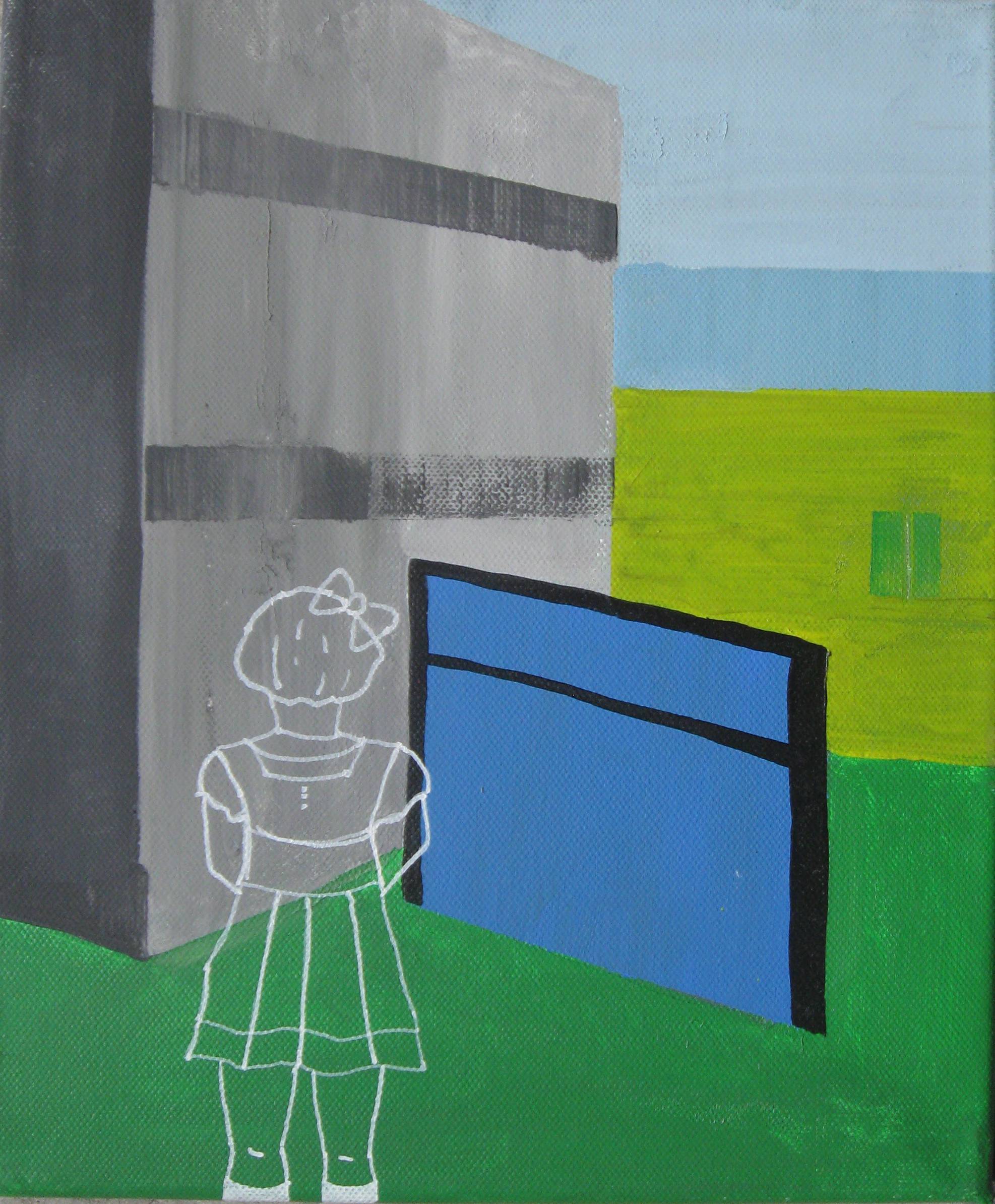 Obraz przedstawia proste, ale intrygujące zestawienie kolorów i kształtów. Dominują szarości i zielenie, z wyraźnym niebieskim elementem pośrodku kompozycji. Szare bryły przypominają geometryczne budynki, które mogą symbolizować miejski pejzaż. Postać dziecka, narysowana białą linią, wprowadza element niewinności i zagadki. Jej obecność sprawia, że odbiorca zastanawia się, co widzi – może niebieskie drzwi do innego świata? Atmosfera obrazu jest nieco tajemnicza i nostalgiczna. Dzięki prostocie form i kolorów wydaje się emanować spokojem. Niebanalne wykorzystanie przestrzeni i perspektywy tworzy uczucie izolacji, jakby dziecko było jedynym świadkiem czegoś ważnego. Techniqe jest minimalistyczna, co podkreśla emocjonalną głębię dzieła. Dzieło może wywoływać w odbiorcy refleksje nad dzieciństwem i tajemnicami, które nawiedzają nasz umysł w młodości. Z pewnością malec w obrazie dodaje pewnej "cuteness". Artystyczne decyzje dotyczące kolorów i prostych linii pokazują wpływ abstrakcji i minimalizmu, co czyni obraz nowoczesnym i zarazem ponadczasowym. Hm, aż chciałoby się tam wejść i zobaczyć, co jest dalej!