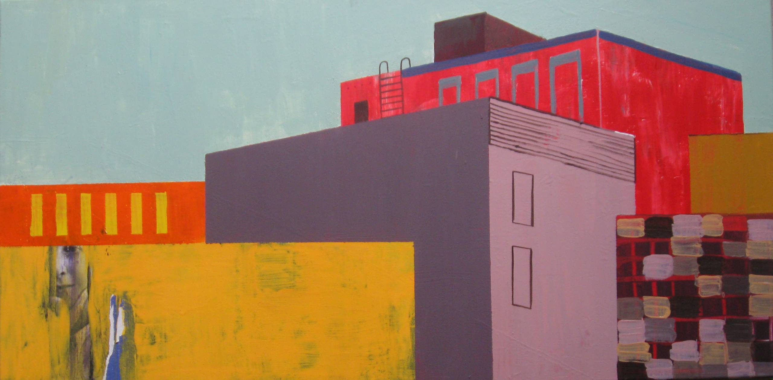 Na obrazie widzimy urbanistyczną panoramę, złożoną z prostokątnych, geometrycznych brył w żywych kolorach. Jest tu jasne niebieskie niebo, czerwień, żółć i szarości ścian, które tworzą kontrastującą i nieco industrialną kompozycję. Ciepłe odcienie czerwieni i żółci nadają całości pulsującą, energiczną atmosferę, jakby miasto żyło własnym rytmem. Styl malarski przypomina nieco szkołę pop-art, z kanciastymi kształtami i płaskimi powierzchniami. Technika jest zdumiewająca — prostolinijne formy budynków zestawione są z bardziej miękkimi, niedoprecyzowanymi liniami. Wywołuje to w odbiorcy poczucie uporządkowanego chaosu. Malowanie takiego miasta to jak zabawa w klocki, gdzie każda bryła, choć na pozór prosta, kryje w sobie historię. Może to być opowieść o życiu w mieście pełnym kontrastów. Dziecko pewnie powiedziałoby, że to obraz miasta, w którym domki się uśmiechają. Patrząc na te geometryczne formy, czuję sie jakbym przenosił się do wielkomiejskiego labiryntu, w którym każda przecznica kryje coś nowego, unknown and awaiting discovery.