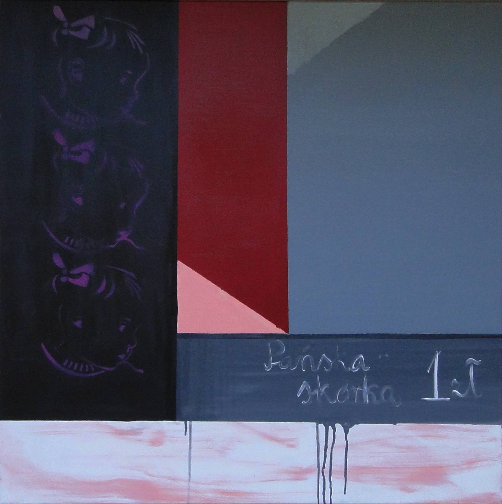 Obraz na pierwszy rzut oka to zaskakująca mieszanka kontrastów i kolażu. Szarości łączą się z czerwoną plamą, przypominając sztukę modernizmu. Po lewej stronie zauważamy ciemny, niemal czarny pasek, na którym pojawiają się ledwo widoczne twarze — jakby kąpały się w cieniu. W tle dominuje chłodny odcień niebieskiego, który delikatnie przechodzi w neutralny szary. Cała kompozycja zdaje się opowiadać nieuchwytną historię, gdzie figury tworzące zamglony wzór mają kluczowe znaczenie. Obraz ma w sobie coś tajemniczego. „Pańska skórka” napis, który błąka się po jego powierzchni, dodaje nuty nostalgic economy, przypominając o czymś zapomnianym. Technikie? Przywodzą na myśl kolaż i eksperymenty z teksturą farby, co wzmacnia surowy charakter dzieła. Dla dziecka to wygląda jak cień na ścianie, który opowiada bajki. Emocje mogą być różne — od zadumy po dziwną, ale frapującą tajemnicę. Ten obraz zostawia wiele pola do interpretacji każdego odbiorcy. What a mystery!