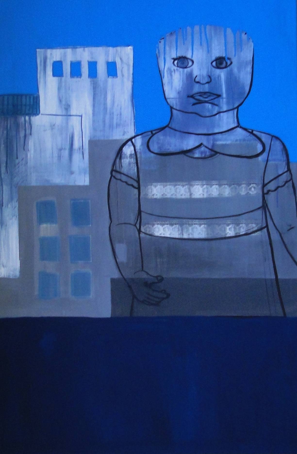 Na obrazie dominuje intensywny błękit nieba, który kontrastuje z chłodnym szaro-niebieskim miastem w tle. Budynki są prostokątne, geometryczne, jakby nie do końca realne, a wszystko to przenika aura tajemniczości. W centrum stoi postać – dziwna, trochę przypominająca lalkę, z wyrazistymi, czarnymi konturami. Ma smutną, jakby zamgloną twarz, z wyraźnym krawatem pod szyją, który przypomina dziecięcy sweterek. Artysta posłużył się prostymi, a zarazem potężnymi pociągnięciami pędzla. Linie są ostre, kontrastujące, ale też nieco rozmyte, co przywodzi na myśl marzenia senne. Atmosfera obrazu to mieszanka nostalgii i niepokoju – jak cisza przed burzą. Czy to miasto śni? Czy postać jest jego duchem? Może po prostu lost soul w miejskiej dżungli? Obraz budzi skojarzenia z dzieciństwem, które niesie tęsknotę za prostszymi czasami. "Te niebieskie domy są jak kredki w moim pudełku" – mogłoby powiedzieć dziecko, patrząc na te kształty i kolory. Elementy użyte przez artystę sprawiają, że widz czuje to specyficzne zawieszenie pomiędzy rzeczywistością a snem. A kto wie, może to początek nowej bajki o życiu w wielkim mieście?