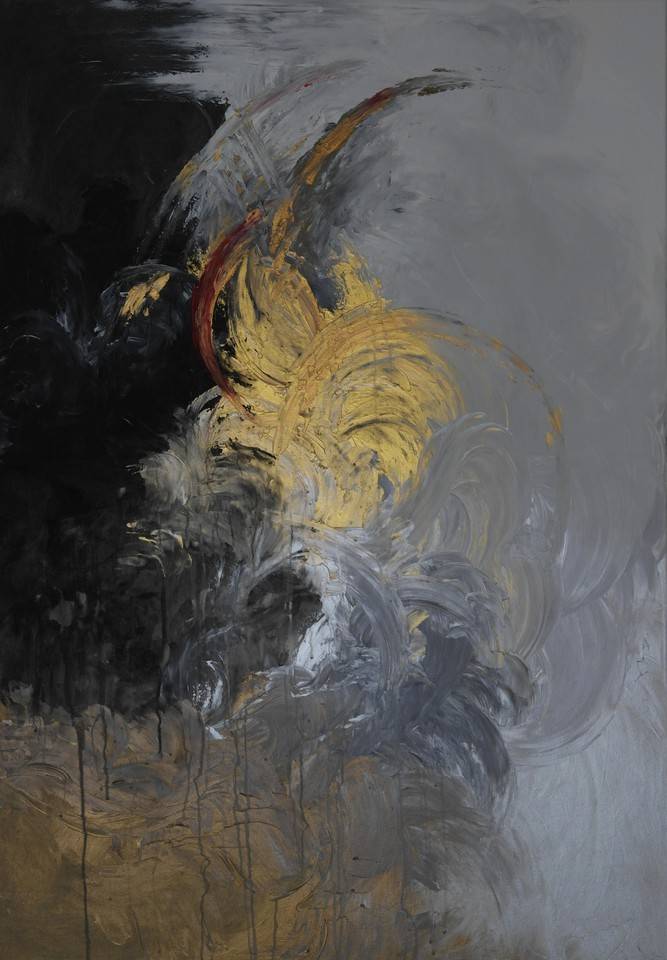 Obraz, na który patrzymy, to prawdziwa eksplozja emocji i kolorów. Dominują szarości, czernie i złote odcienie, które tworzą wirującą kompozycję, pełną energii i dynamizmu. Wygląda to trochę, jakby artysta próbował uchwycić moment przełomu, burzę uczuć, może nawet wewnętrzny chaos. Wykorzystane techniki – śmiałe pociągnięcia pędzla oraz chropowata faktura farby – dodają dziełu surowości i ekspresji. Atmosfera obrazu jest pełna napięcia, jakby coś się miało zaraz wydarzyć. Czujesz, jak obraz niemalże drży pod wpływem własnej energii. Można poczuć, jak myśli zaczynają galopować. A ta niepewność... Czy to nadzieja przebija się przez ciemność, czy raczej ona wciąga złote światło w otchłań? It's a mystery. Można się zastanawiać, co autor chciał powiedzieć – może to o walce, a może to tylko piękna abstrakcja, która daje ci przestrzeń do własnych przemyśleń. Kiedy patrzę na ten obraz, czuję się trochę jak w środku emocjonalnego wiru. Myślę o tym, jak życie potrafi być skomplikowane. Mój mały brat powiedziałby pewnie: "To wygląda jak wielka burza w kosmosie!". I to jest w tym wszystkim najpiękniejsze. Każdy może zobaczyć coś innego i poczuć coś własnego. To dzieło, które mówi do każdego innym językiem, a ty? Co czujesz?
