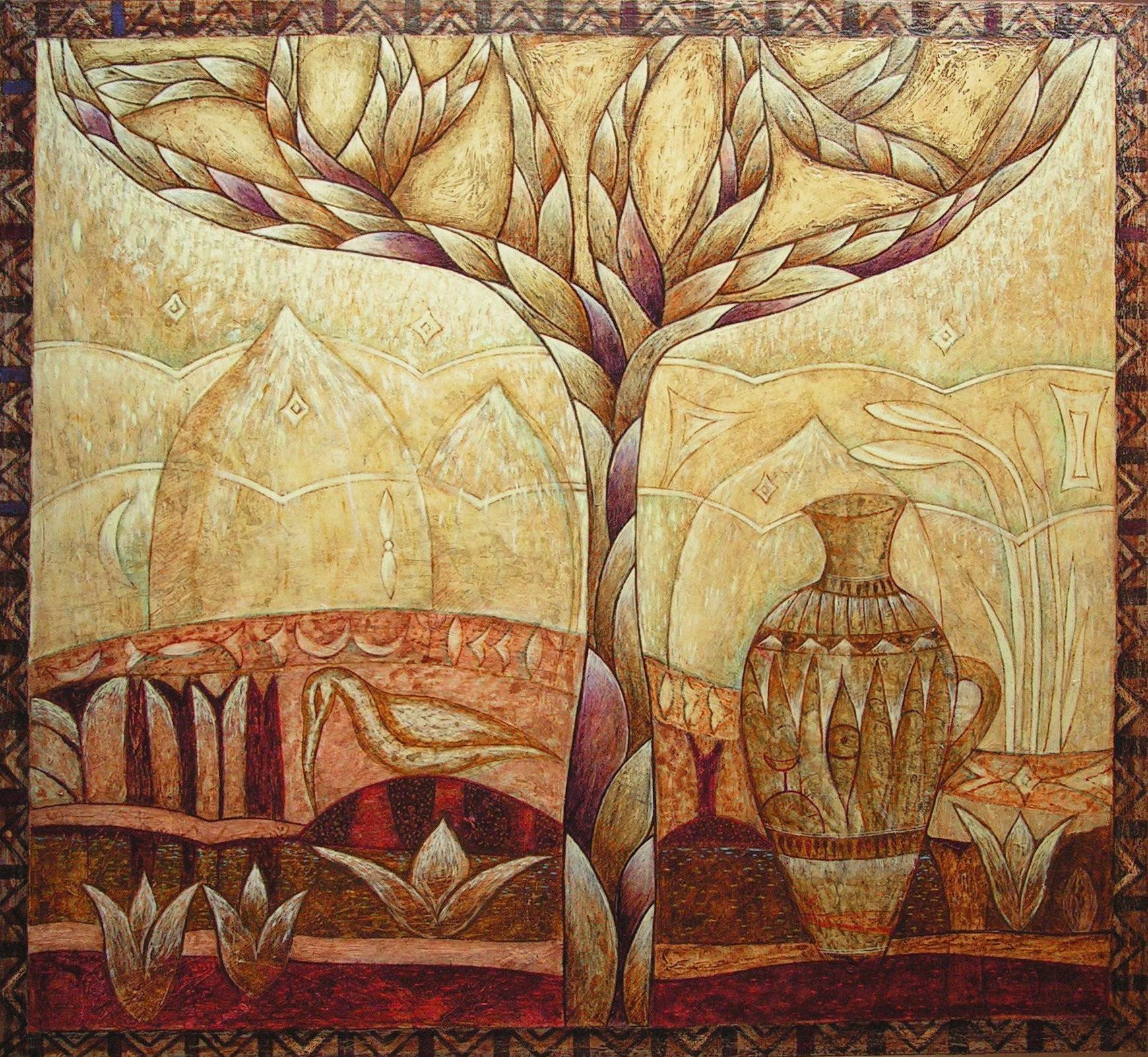 Obraz ten to prawdziwy feast for the eyes, z dominującymi odcieniami brązu i złota, które przywodzą na myśl ciepłe, słoneczne popołudnia. Centralny element to drzewo, którego liście splatają się w harmonijną mozaikę. Każdy liść zdaje się kołysać delikatnie na wietrze, tworząc spokojną atmosferę zasłużonego wypoczynku po długim dniu. Styl obrazu jest wyraźnie inspirowany sztuką abstrakcyjną, mieszającą geometryczne formy z organicznymi kształtami. Wazon po prawej stronie złożony jest z rozmaitych wzorów, co dodaje pracy niepowtarzalnego charakteru. To coś jak układanka, którą chcesz rozwiązać, ale wciąż odnajdujesz nowe fragmenty do podziwiania. Dzieło emanuje spokojem i refleksją, zachęcając widza do zadumy. Można wręcz poczuć, jak ciepły piasek przesypuje się między palcami, oferując chwilę wytchnienia. Tło, z jego delikatnymi, subtelnymi liniami przypomina górzysty krajobraz, który rozciąga się daleko poza horyzont. A ja, patrząc na to, czuję spokój i harmonię. Niby nic, a jednak coś tak magicznego wychodzi z tej kompozycji. Wywołuje wrażenie nieodpartej symetrii i równowagi, które pozwalają się zatracić na dłuższą chwilę. To praca pełna ciepła, jakby zapraszająca, by usiąść i odpocząć.