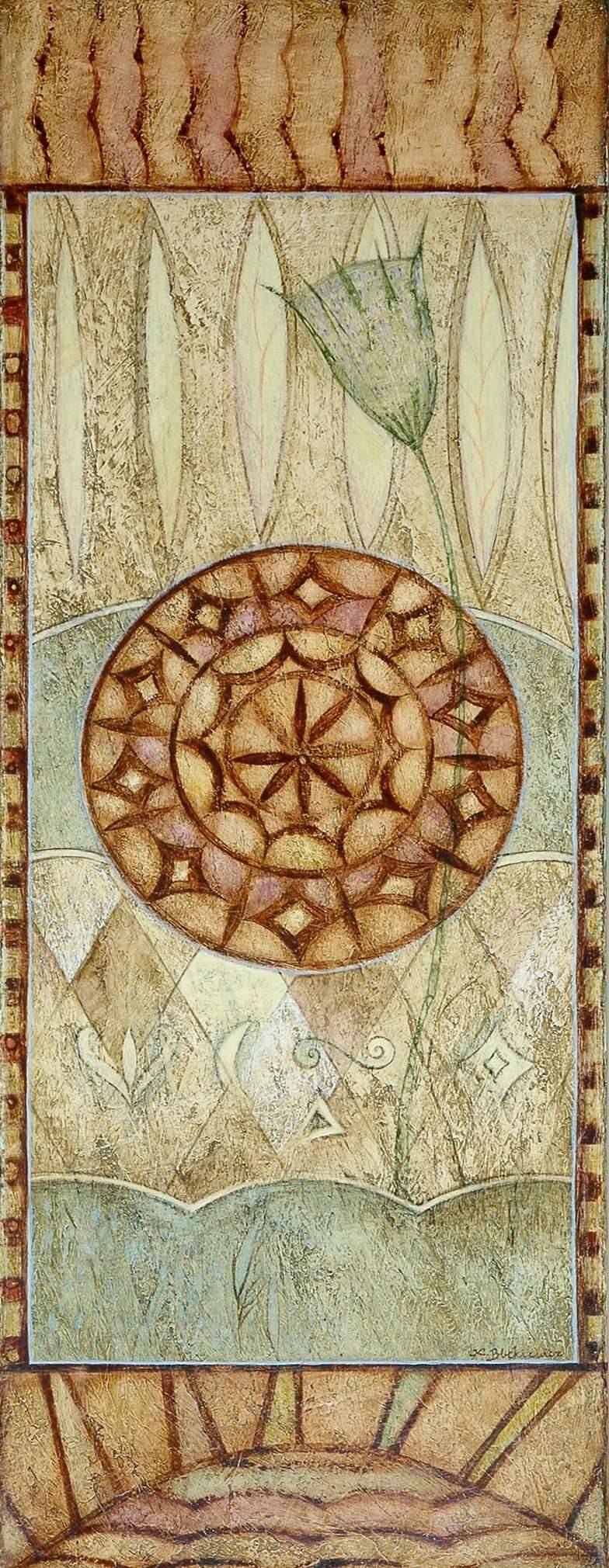 Obraz przyciąga wzrok bogactwem kolorów i wzorów, które tworzą niemal mistyczną kompozycję. Dominują ciepłe odcienie brązu i beżu, przełamane jasnym akcentem zieleni w postaci subtelnego kwiatu. Centralnym punktem jest okrągły wzór, przypominający mozaikę, który dodaje dziełu głębi i struktury. Wyraźnie zarysowane formy nadają obrazowi rytmicznego charakteru, jakby tańczyły na tle płynnego światła. Młody duch może z entuzjazmem powiedzieć: To wygląda jak tajemniczy skarb z innej planety! Panuje tu atmosfera spokoju i tajemniczości. Styl artystyczny wskazuje na wpływy abstrakcji i secesji, w których dominuje swobodna linia i organiczne kształty. Widz może odczuwać swego rodzaju nostalgiczną tęsknotę za czymś nieokreślonym, a może to tylko echo dawnych wspomnień. Wpatrując się w to dzieło, można ulec refleksji nad przemijaniem czasu i ulotnością piękna. Czy to dzieło jest jak whisper in the wind, zapraszające do głębszej zadumy? Dla mnie, to jak podróż w inne czasy, kiedy sztuka była magicznym mostem do nieznanego.