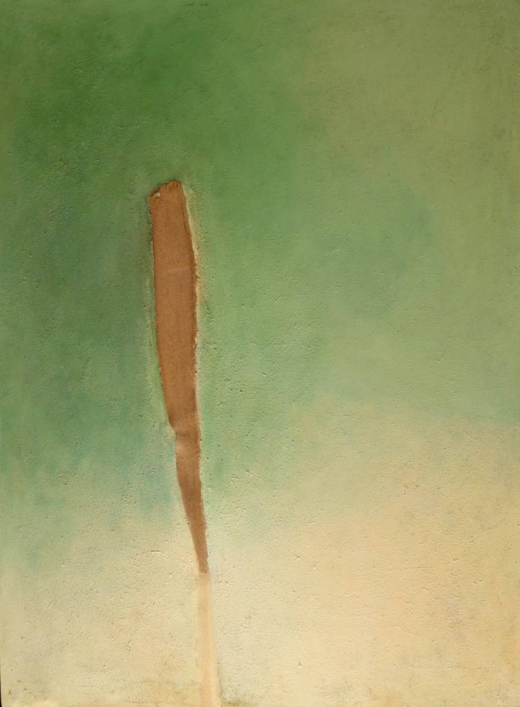 Obraz częściowo jest kolażem, gdyż brązowy element to jest jedno pióro ze słojów drzewa, naturalnie oddzielonego przez sól w kopalni soli na rzece Salzburg. Obraz sygnowany jest na odwrocie. Rok namalowania 2006.