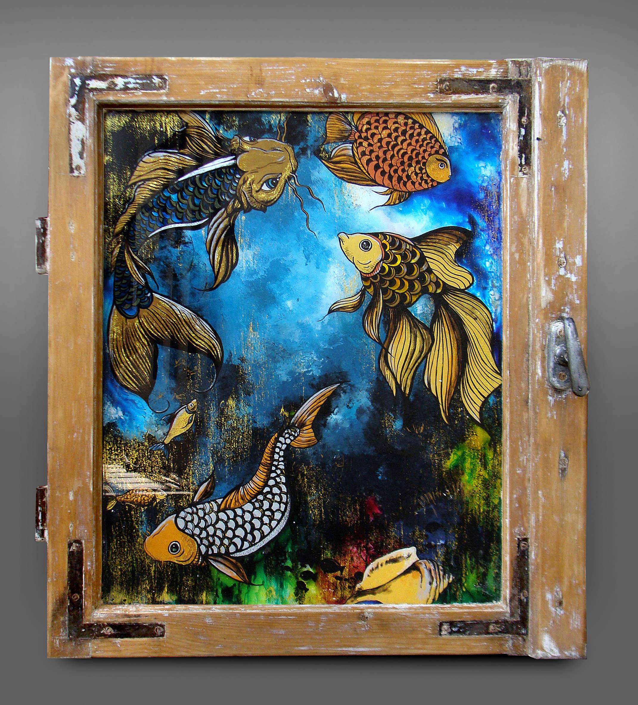 55x60; stare okno; technika mieszana na szkle; Magiczne Akwarium...